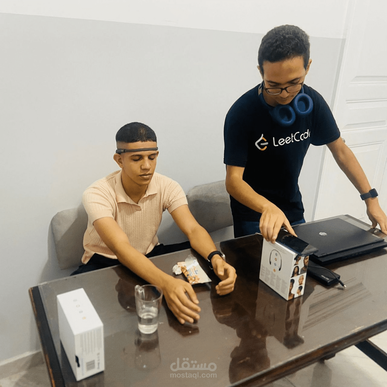 It's me on the photo's right wearing leetcode shirt collecting data and setting up the conditions for the Motor imagery experiment in a Local LAB