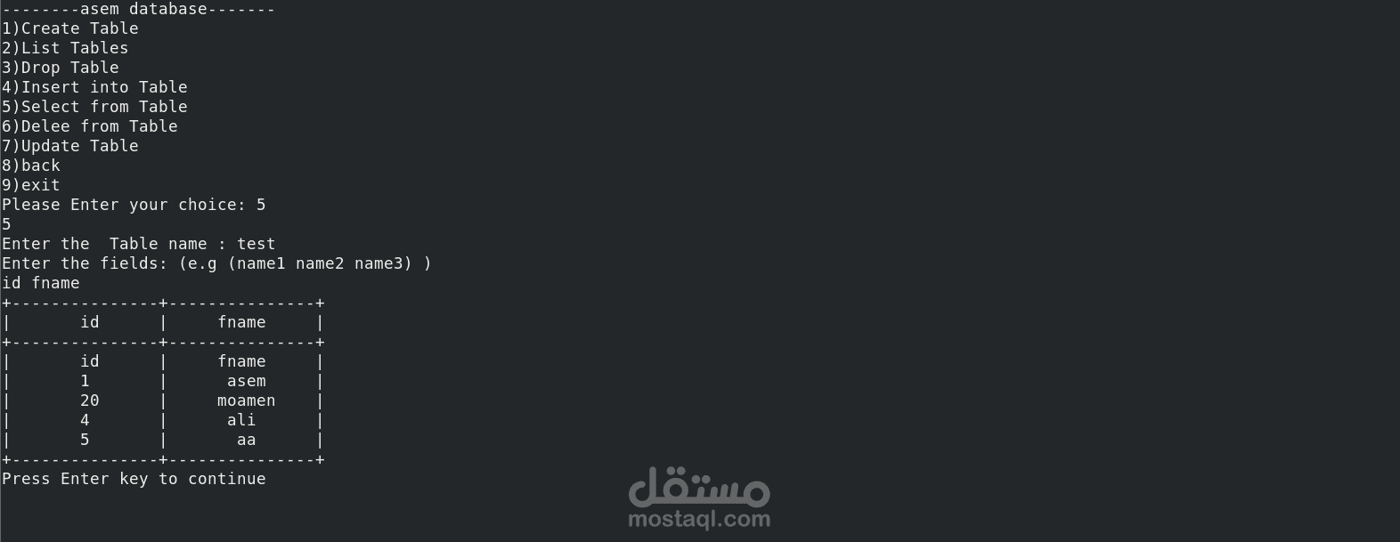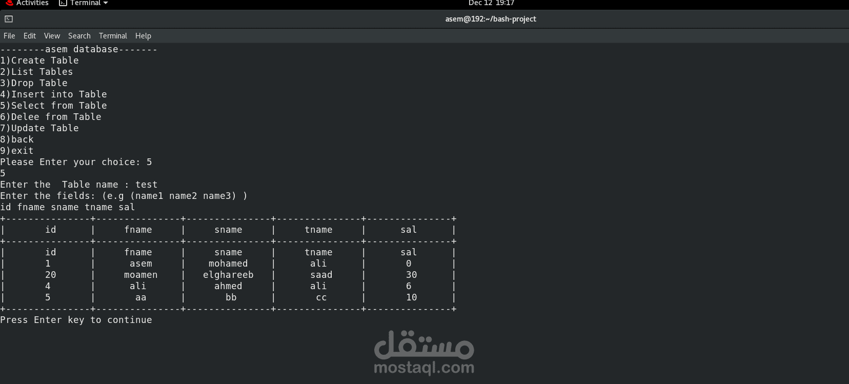 تطبيق يعتمد على واجهة سطر الأوامر (CLI) يتيح للمستخدمين إدارة البيانات المخزنة على القرص الصلب. يوفر هذا المشروع نظام إدارة قواعد بيانات (DBMS) مبسطًا ولكنه عملي، تم تنفيذه باستخدام برمجة Bash.