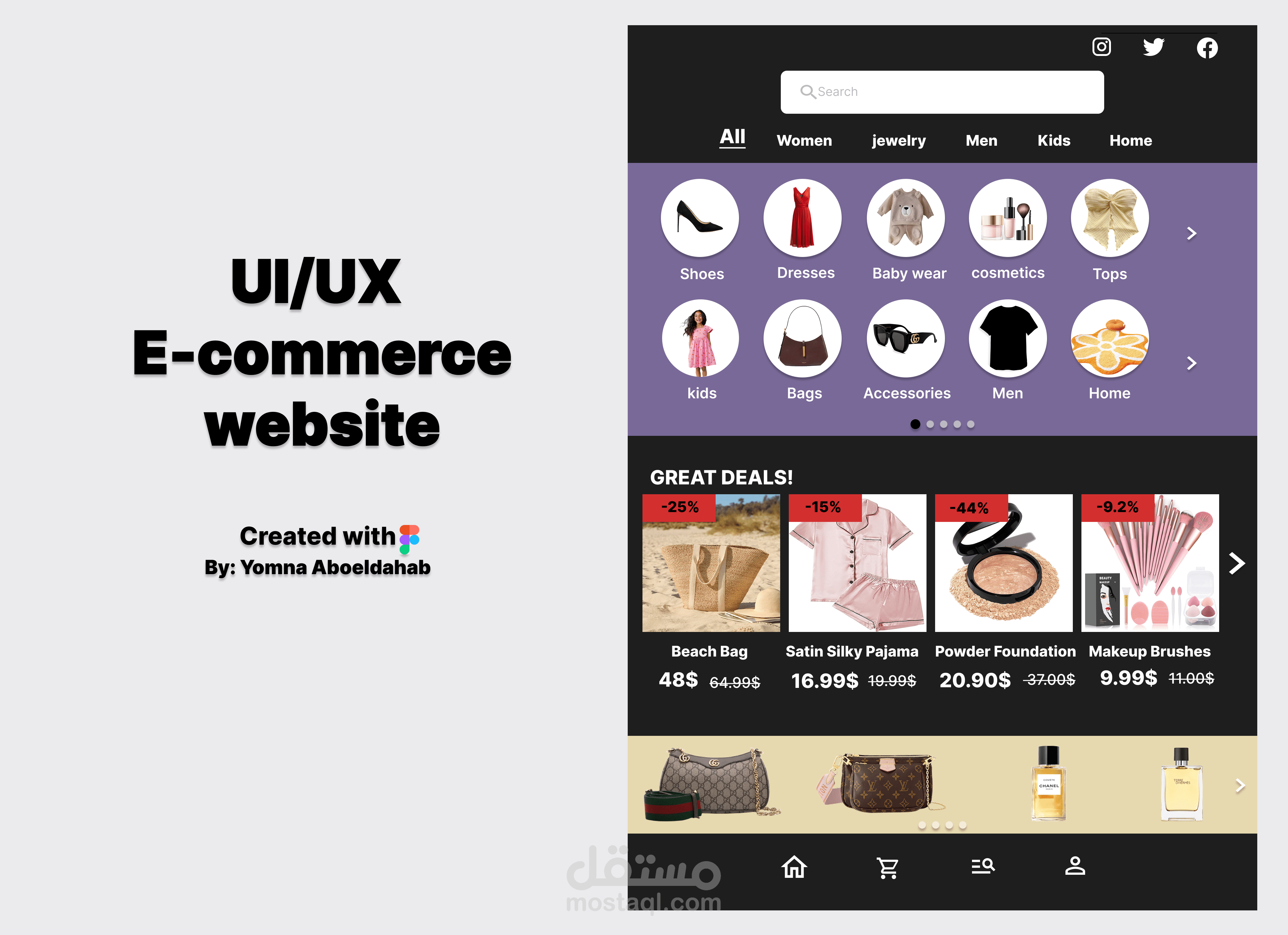 تصميم لموقع تسوق اونلاين يوفر سهوله وصول المستخدم لمتطلباته عن طريق ايقونات الاختصار البسيطه التي توضح الفئات وكذلك قائمة العروض الحاليه