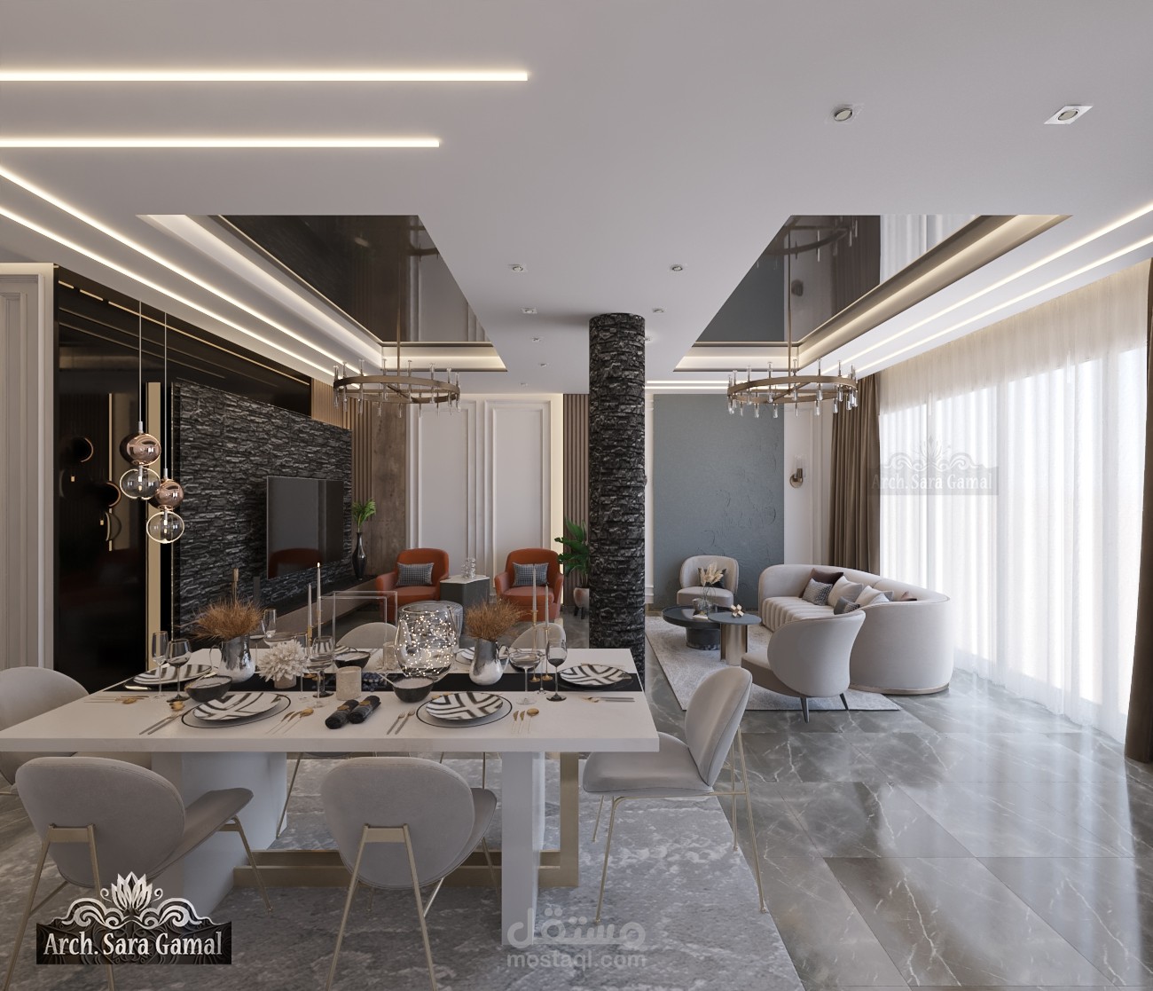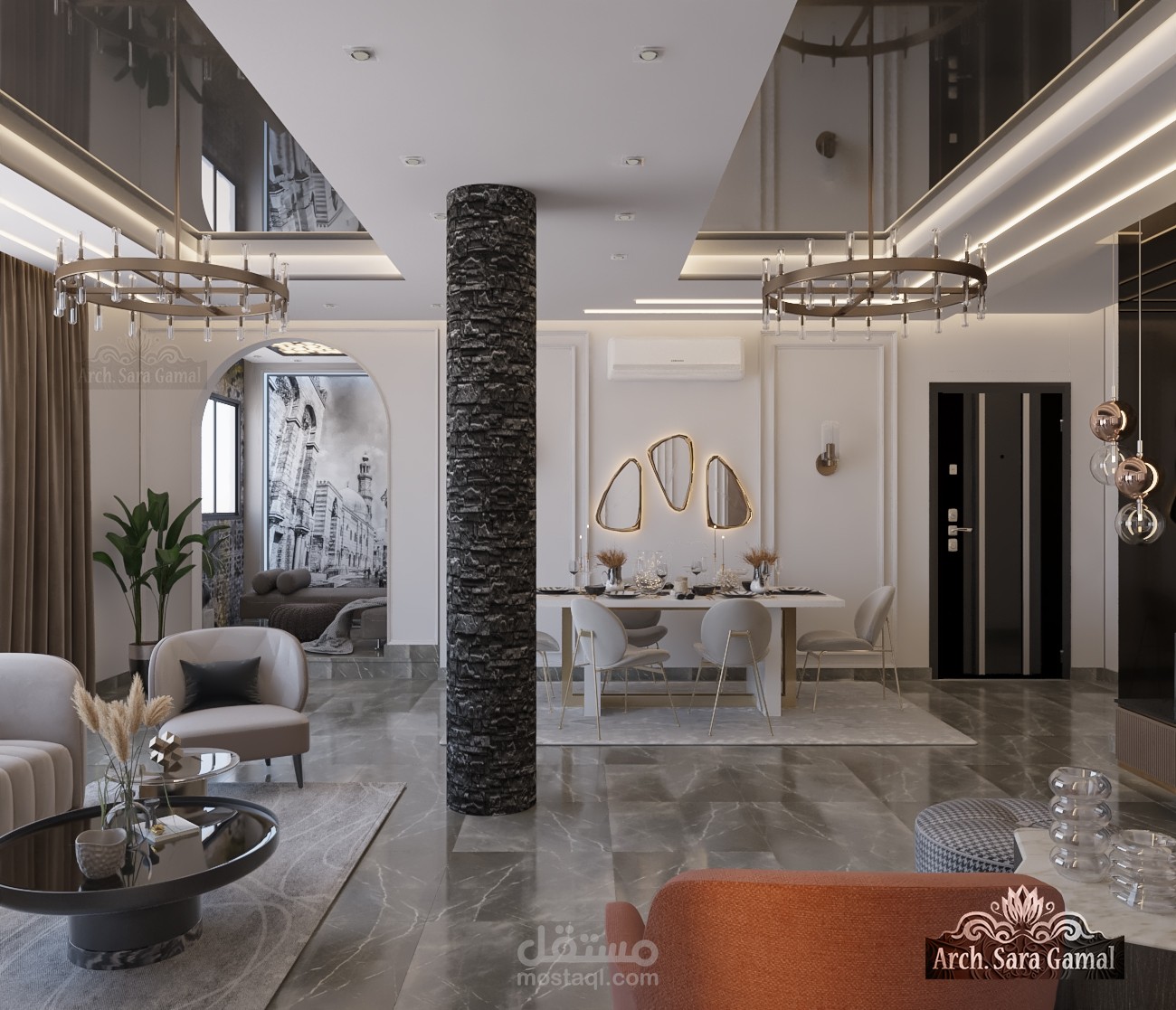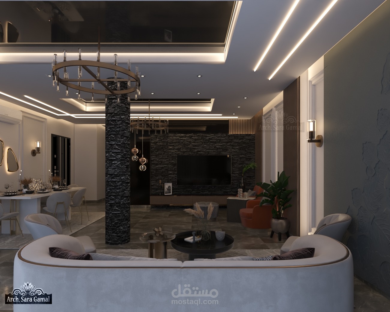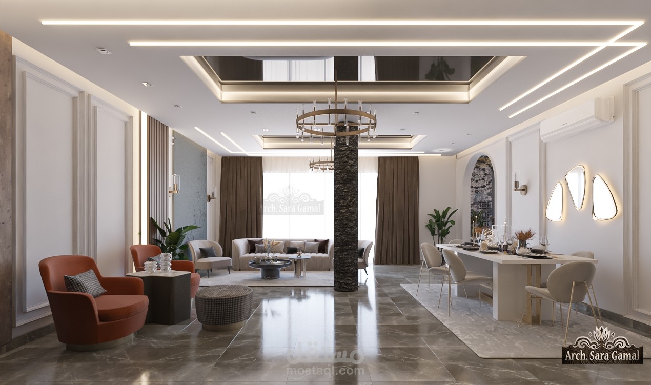 استخدام التوازن بين التفاصيل الراقية والبساطة الحديثة لخلق بيئة أنيقة ومريحة.