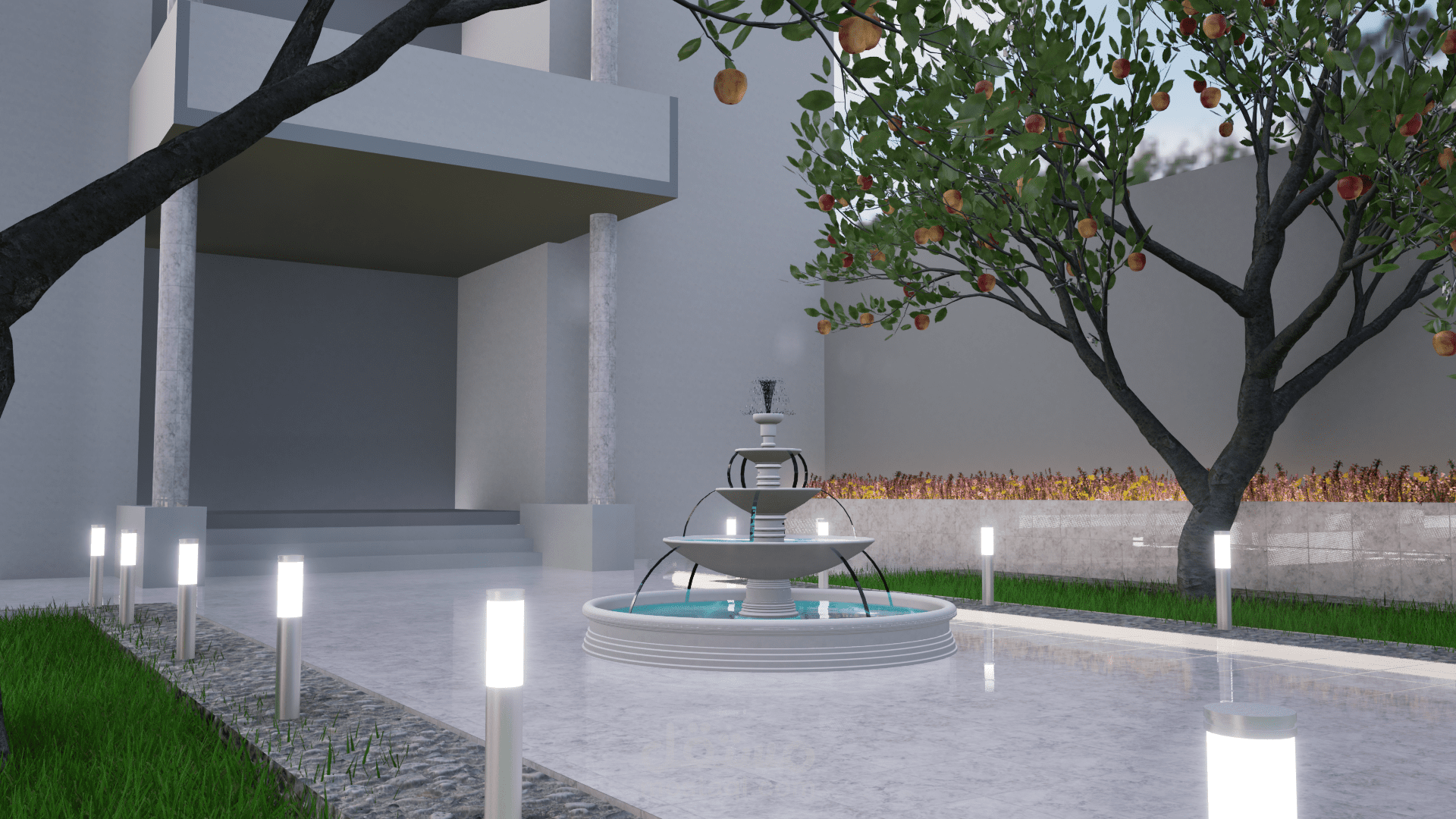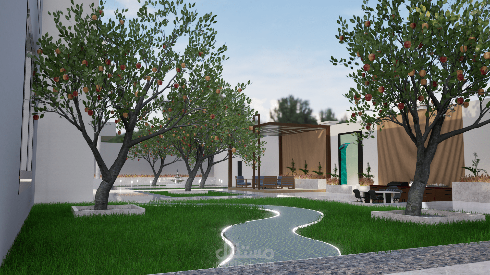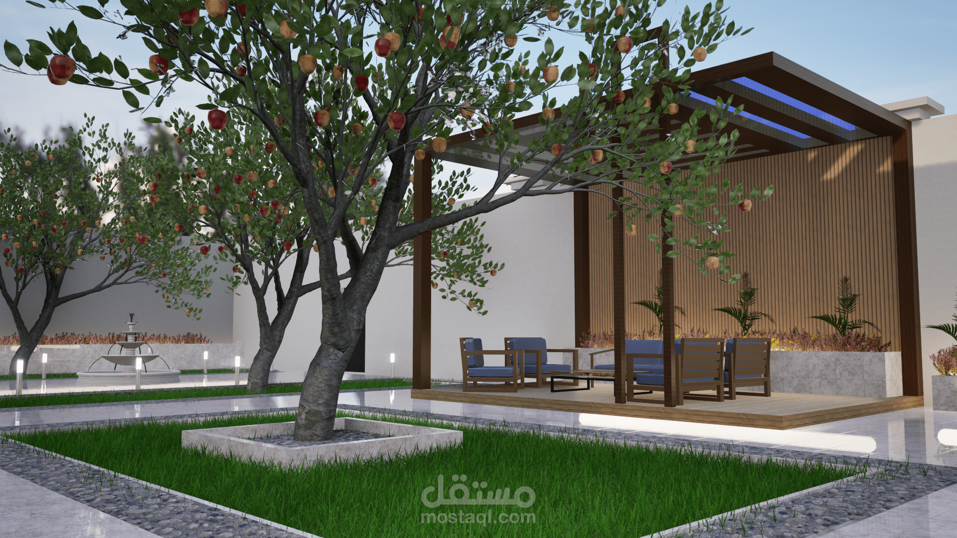 في منتصف الحديقة، توجد نافورة مائية حديثة بتصميم أنيق، تتكون من شلال متدرج يضيف حركة مائية هادئة تبعث على الاسترخاء. يتم استخدام الأحجار الطبيعية والبلاط الفاخر لدمج النافورة مع المساحات الخضراء المحيطة. تُضاء النافورة بأضواء LED خفية تضيف تأثيرات رائعة على المياه المتدفقة في الليل.