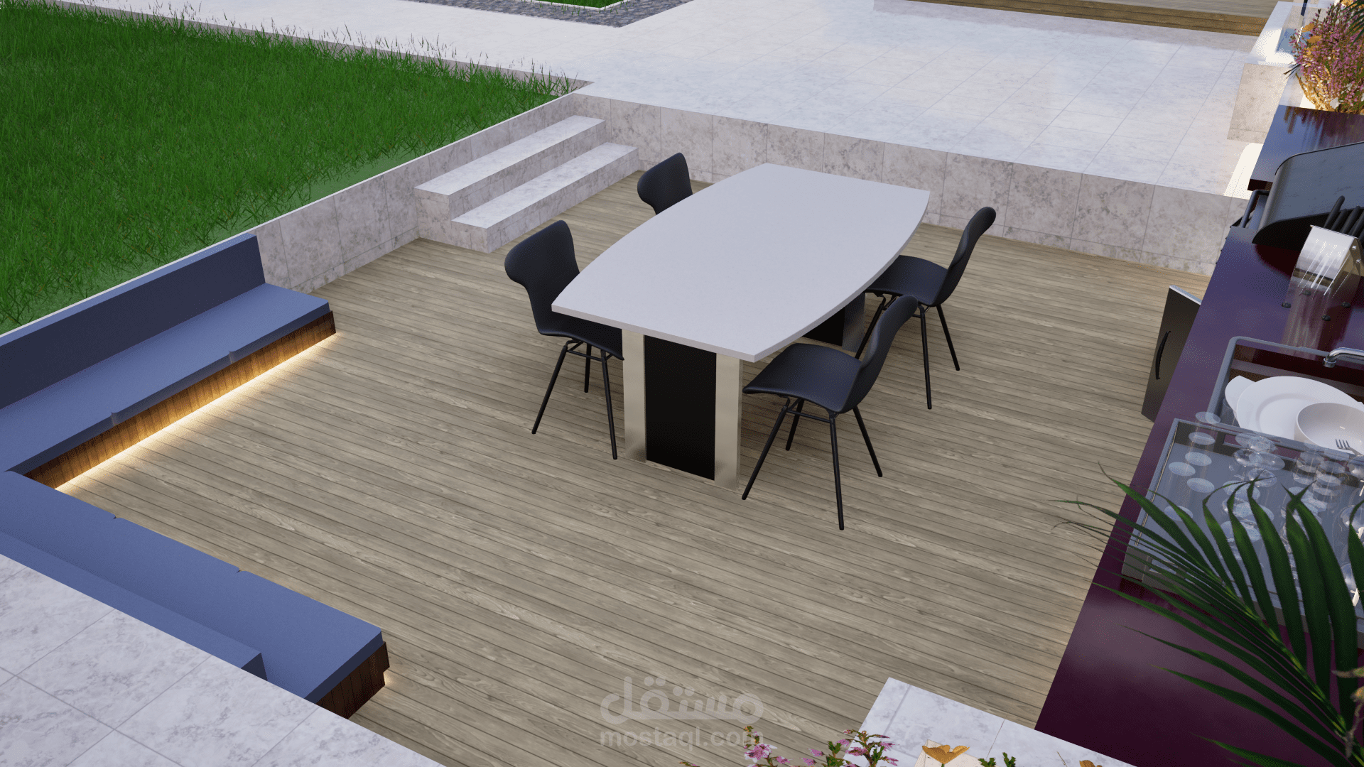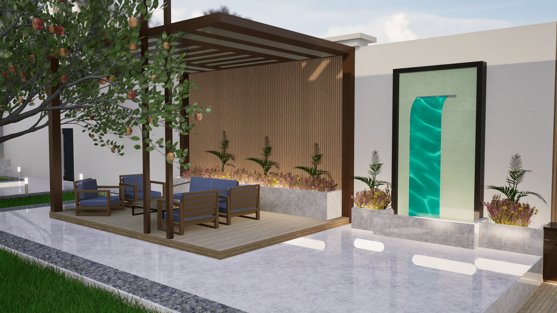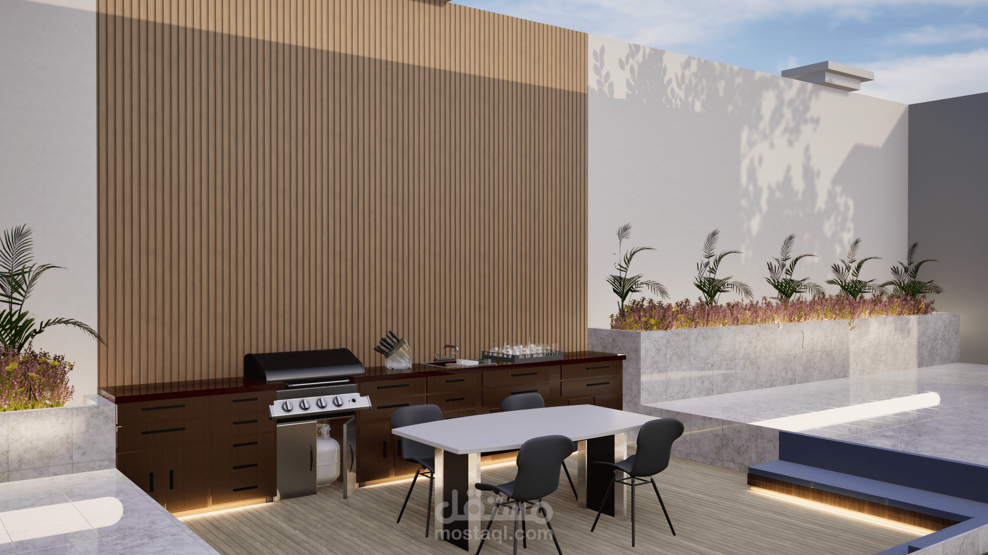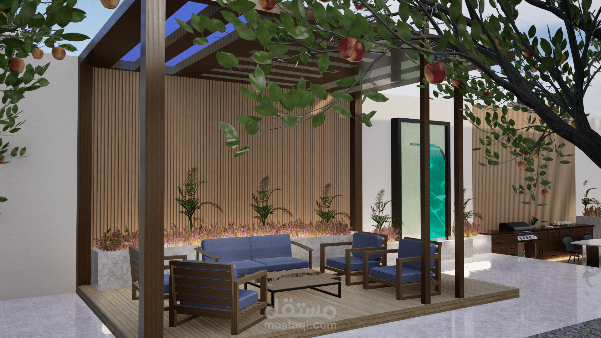 تم تصميم برجولا عصرية بأشكال هندسية أنيقة، مصنوعة من الخشب المعالج أو الألمنيوم المطلي بألوان محايدة تتناسب مع الطابع المعماري للفيلا. تم تزويدها بإضاءة LED مدمجة توفر أجواءً دافئة في المساء، مع ستائر جانبية قابلة للتحريك للحماية من الشمس وتوفير الخصوصية. يمكن إضافة جلسات مريحة مع طاولة وسطية مناسبة للجلسات العائلية أو الاستمتاع بالقهوة.