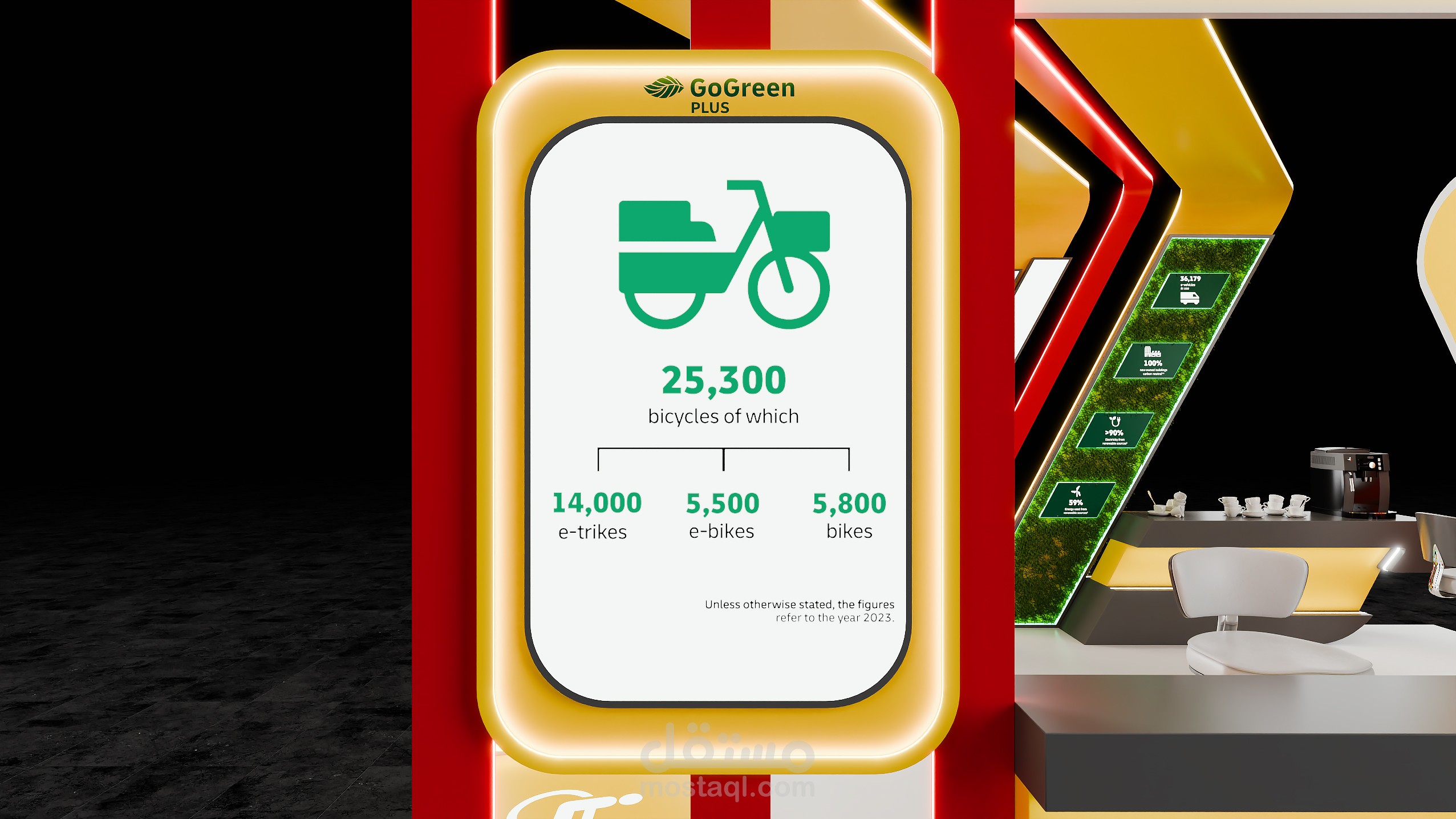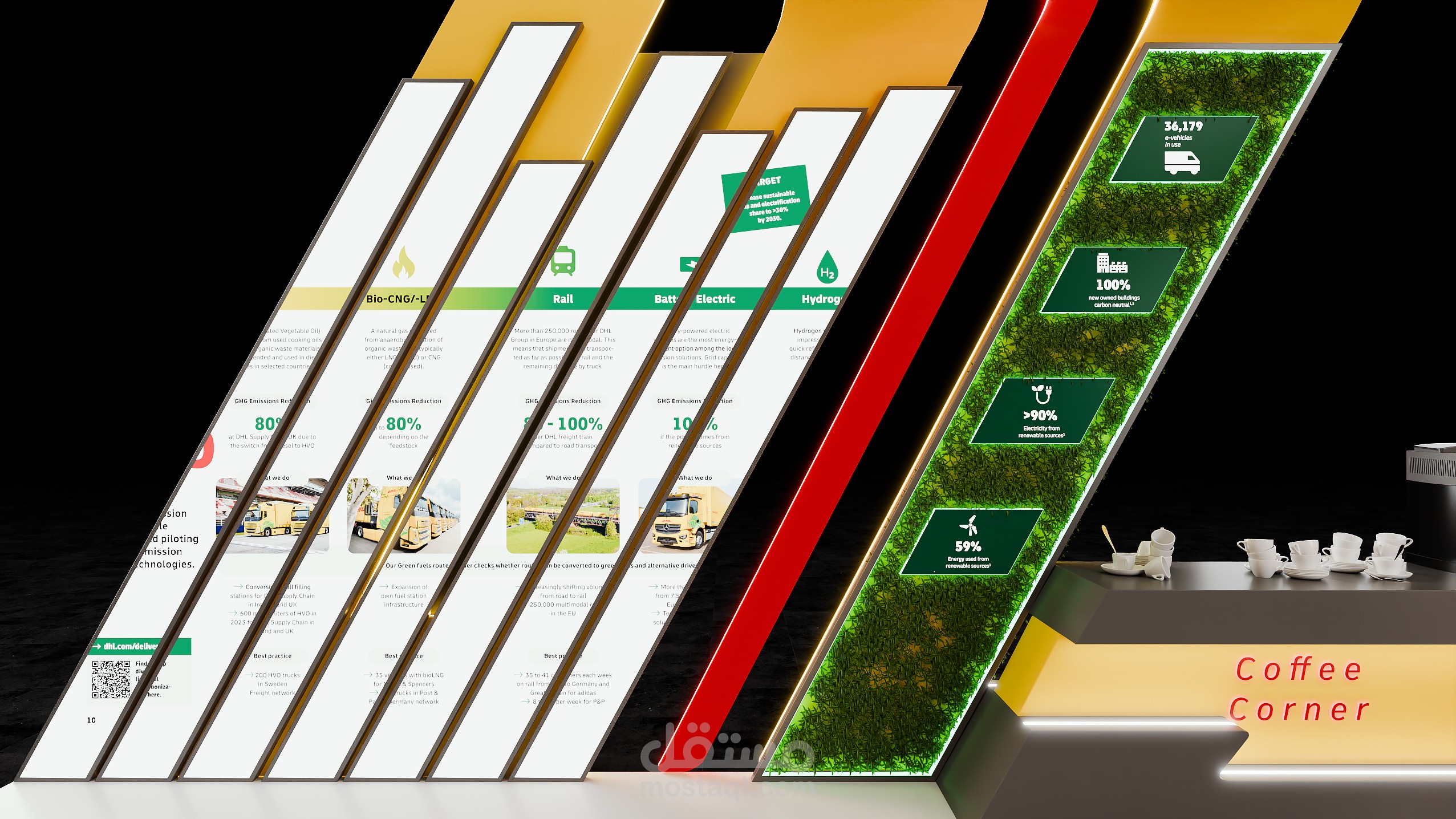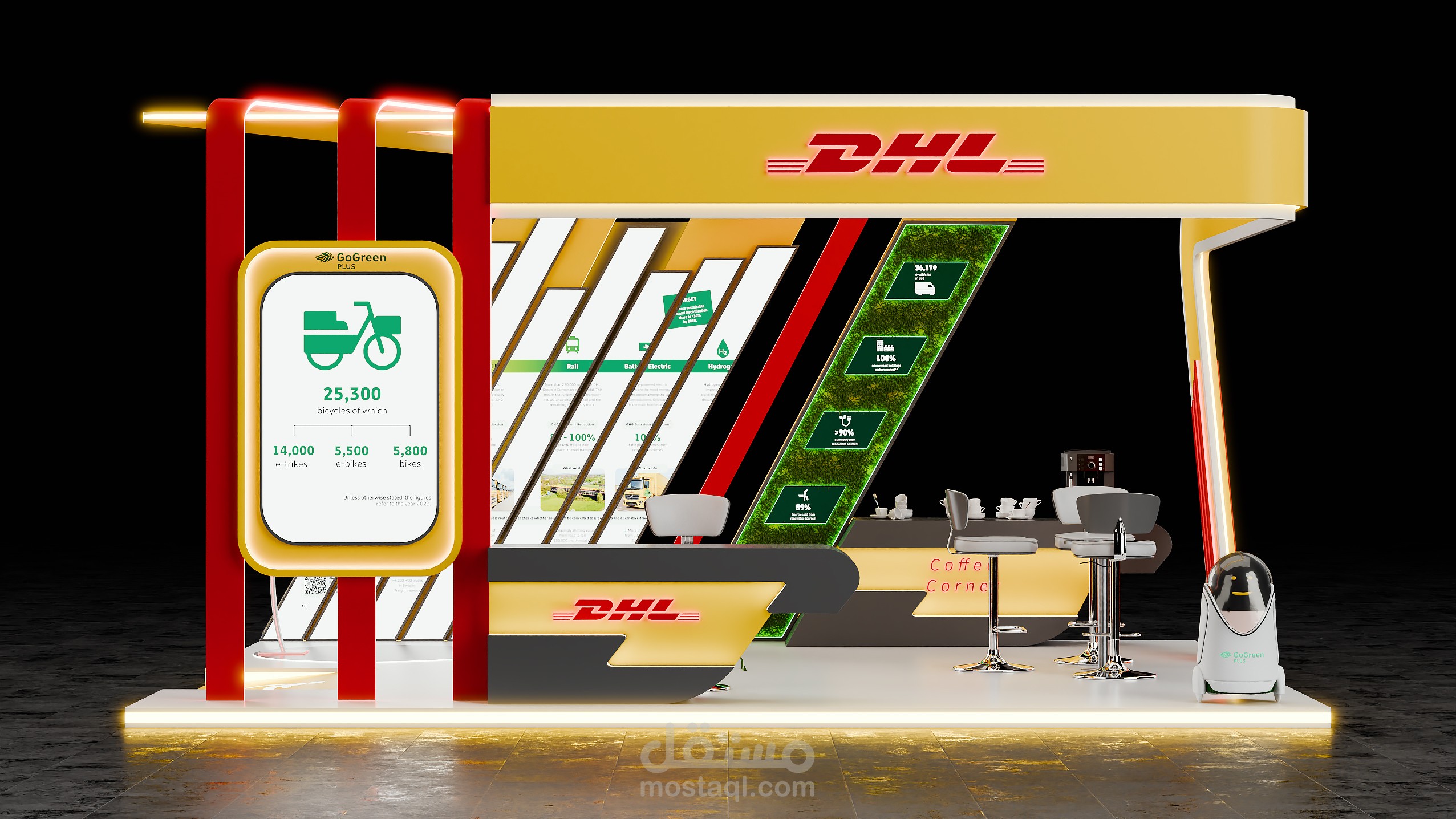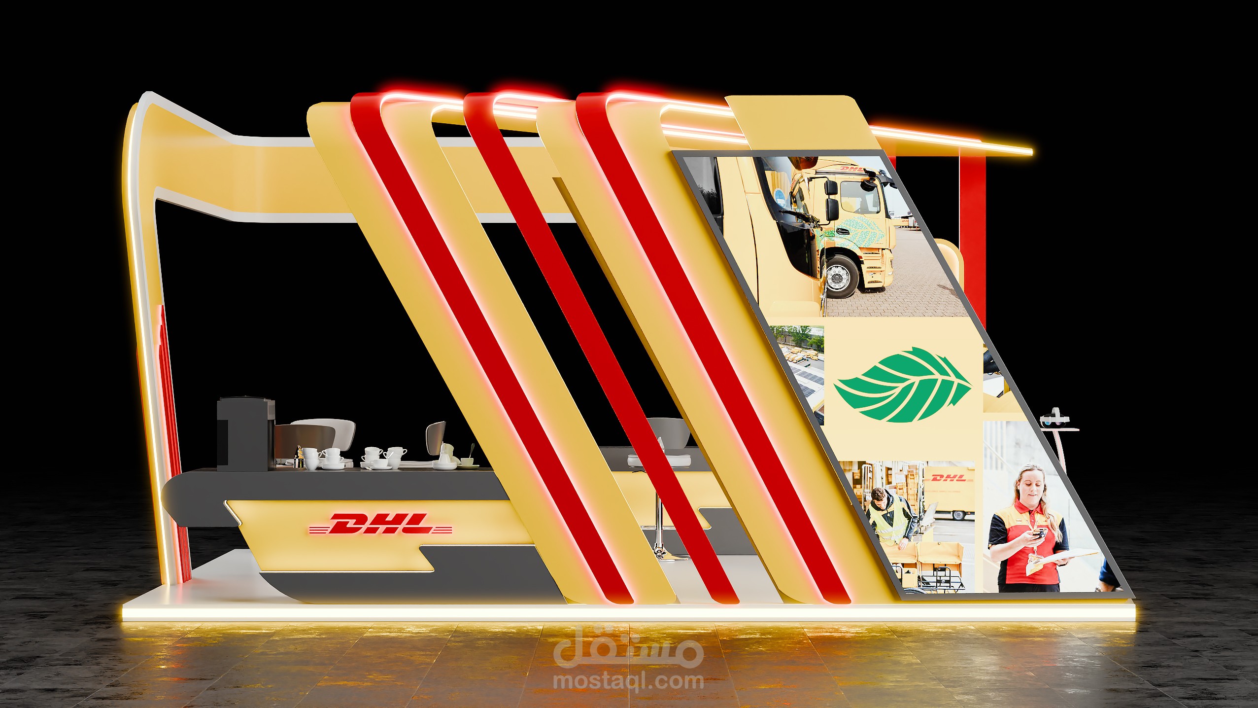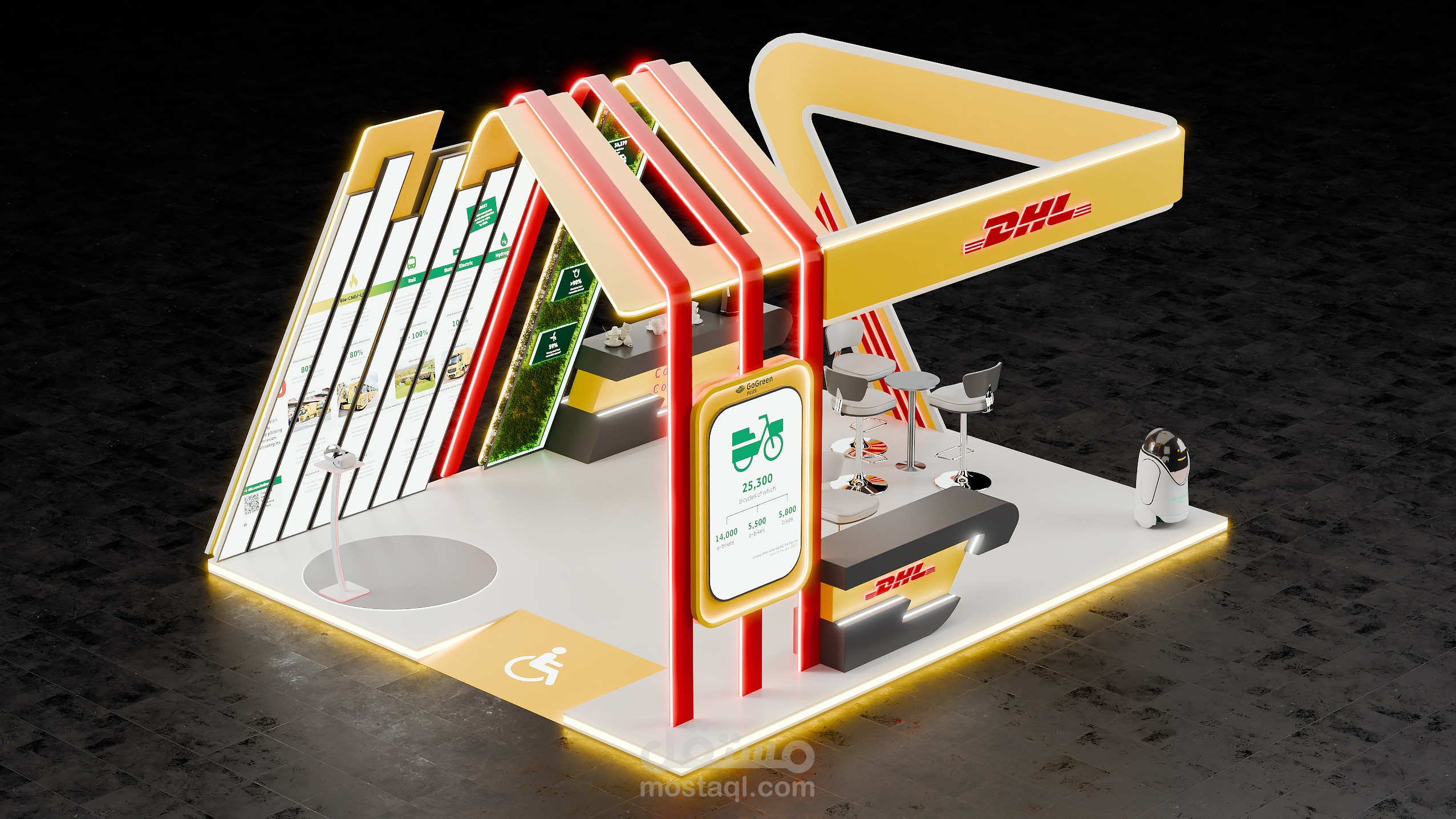 A modern and dynamic 6 x 5m booth is designed for DHL, showcasing the brand’s commitment to innovation and sustainability. The structure features bold red and yellow DHL branding, combined with sleek white surfaces and integrated LED lighting for a futuristic appeal.