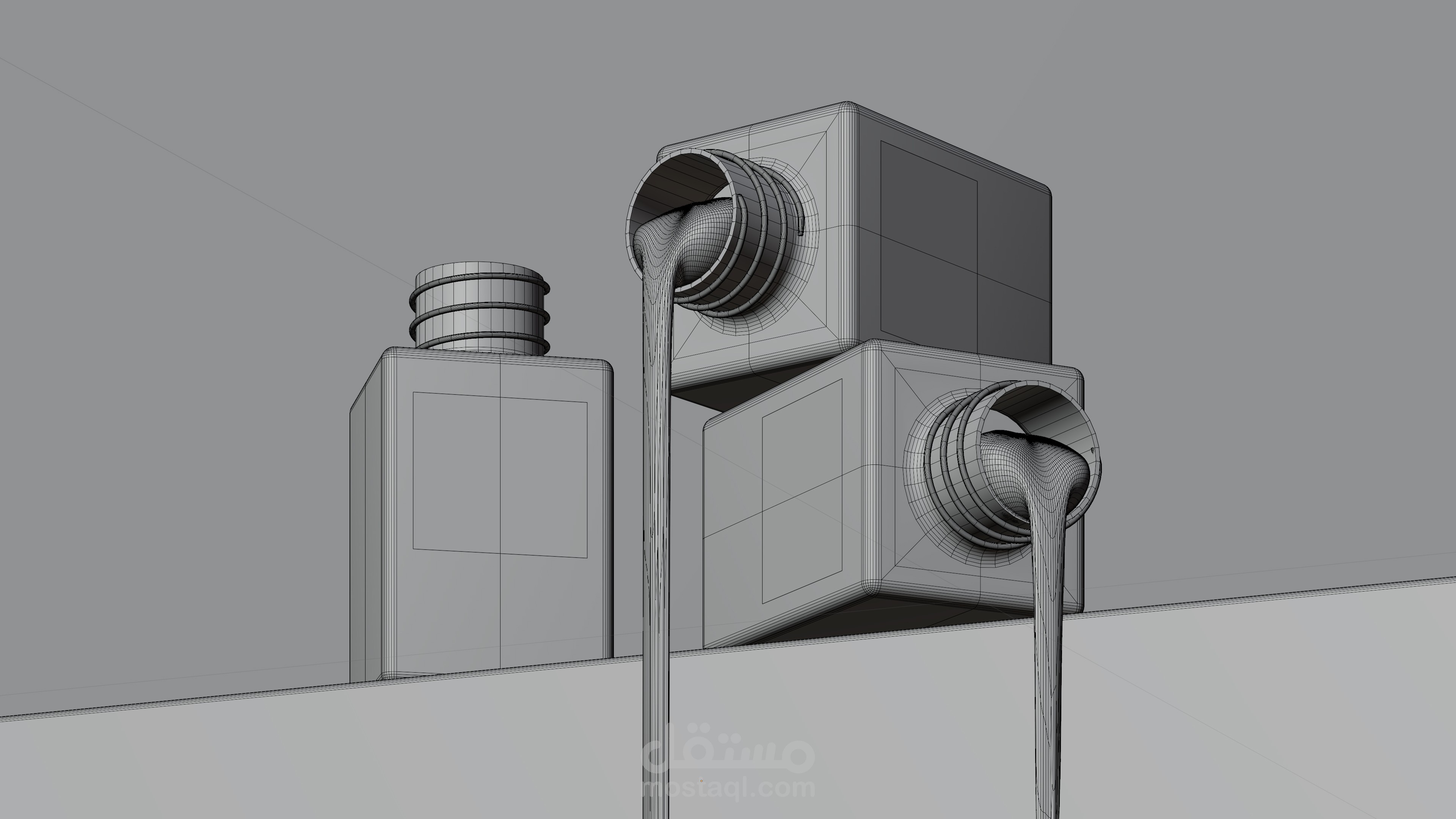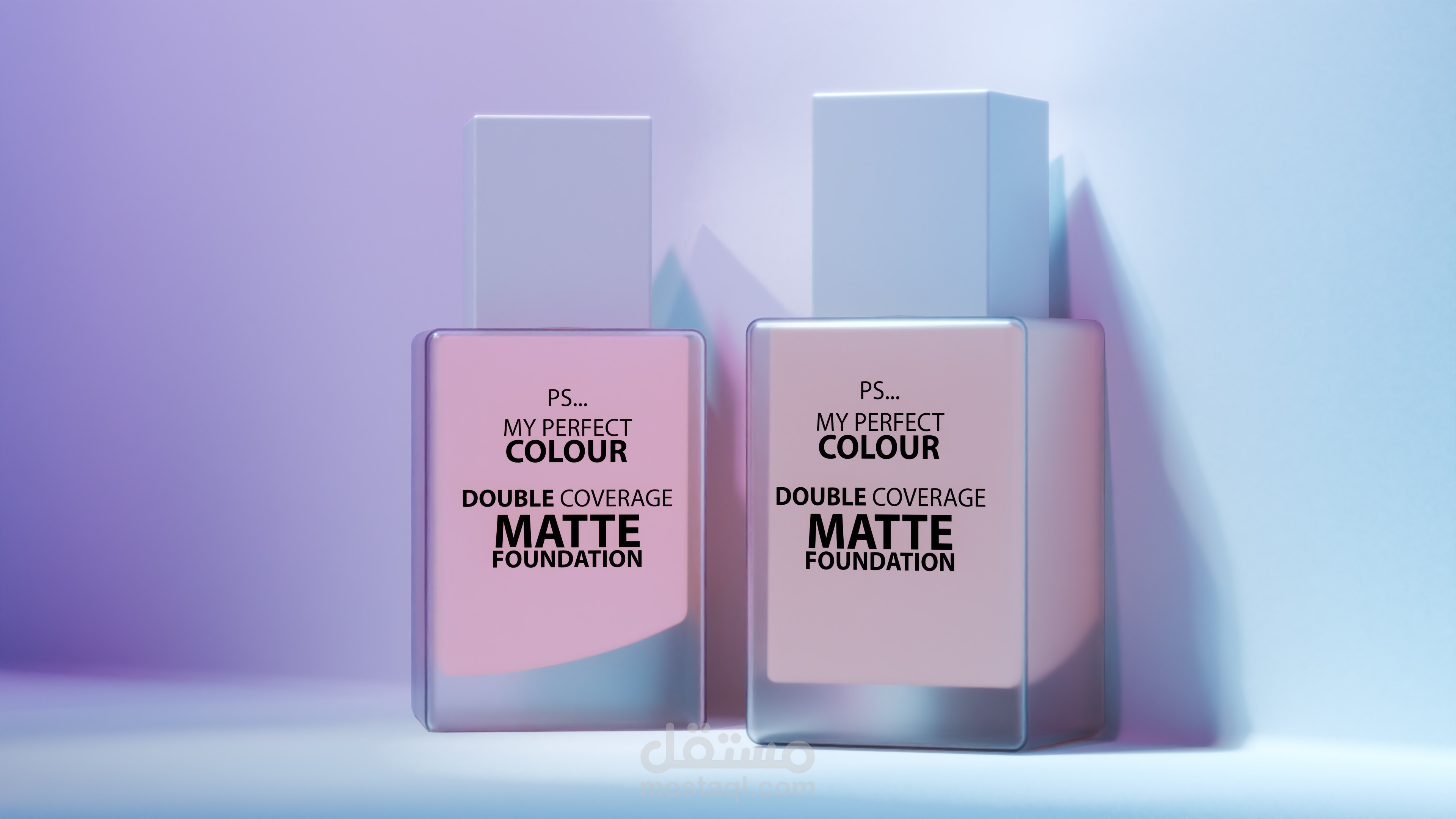 This 3D-rendered composition showcases a premium foundation collection, highlighting rich textures, elegant packaging, and a refined color palette. The dynamic pouring effect adds a sense of fluidity and movement, emphasizing the smooth and flawless coverage of the product. The soft pink backdrop enhances the luxurious aesthetic, making this visual both sophisticated and eye-catching.