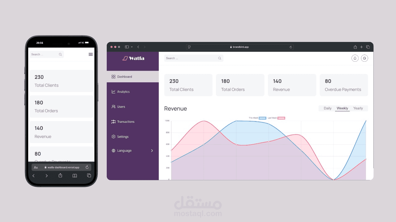 Watfa Dashboard هو لوحة تحكم إدارية متكاملة تتيح للإدارة متابعة الطلبات، عرض الإحصائيات، مراجعة مستندات البائعين، والتحكم في حسابات المستخدمين بكفاءة. كما يوفر أدوات لمراقبة عمليات تحويل الأموال واستقبال إشعارات المستخدمين، مما يساعد في تحسين عمليات الإدارة واتخاذ القرارات بسرعة ودقة.