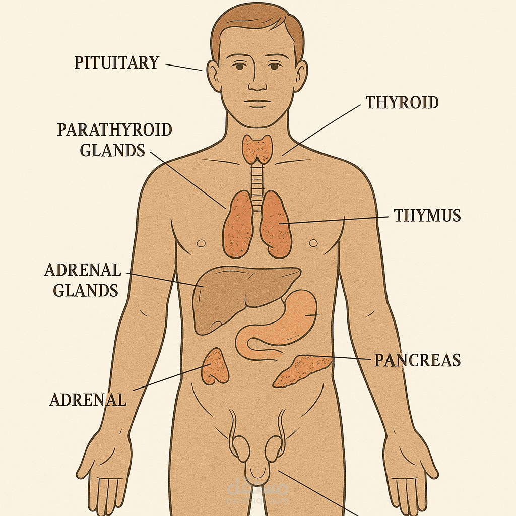 Controls other glands and regulates growth, metabolism, and reproductive functions.