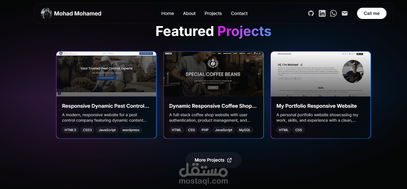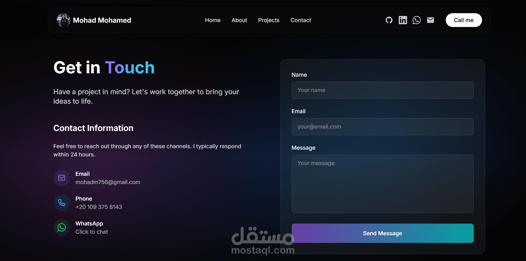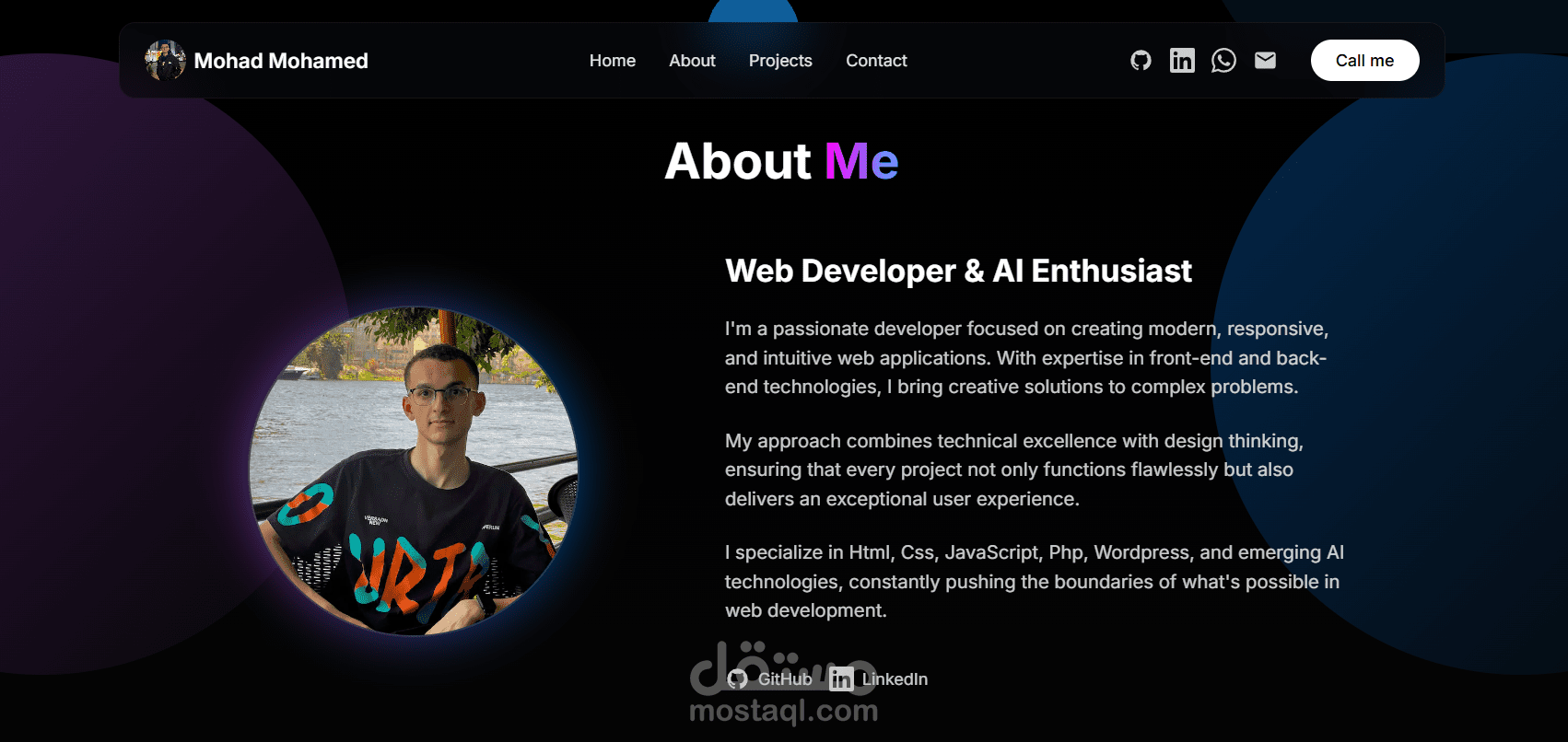 موقع بورتفوليو شخصي تم تطويره باستخدام React و Tailwind CSS، يتميز بتصميم عصري وسريع الاستجابة يعمل على جميع الأجهزة. يحتوي الموقع على أقسام لعرض المشاريع السابقة، المهارات، والخبرات، بالإضافة إلى معلومات التواصل. تم التركيز على تجربة المستخدم (UI/UX) والأداء العالي مع واجهة نظيفة وسهلة التصفح.