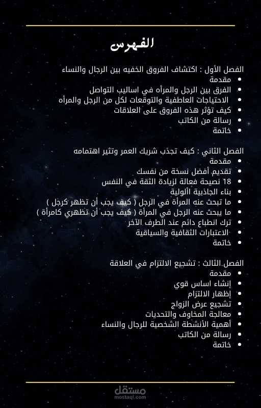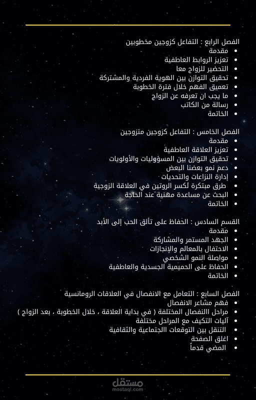 يتناول الكتاب بشكل شامل كيفية التعامل مع شريك الحياة عبر مراحل العلاقة المختلفة ، ابتداء من مرحلة جذب الشريك ، مرورًا بتكوين العلاقة والتعرف على الآخر في فترة الخطوبة ، وصولاً إلى مرحلة الزواج وكيفية الحفاظ على مشاعر الحب والود بين الزوجين.