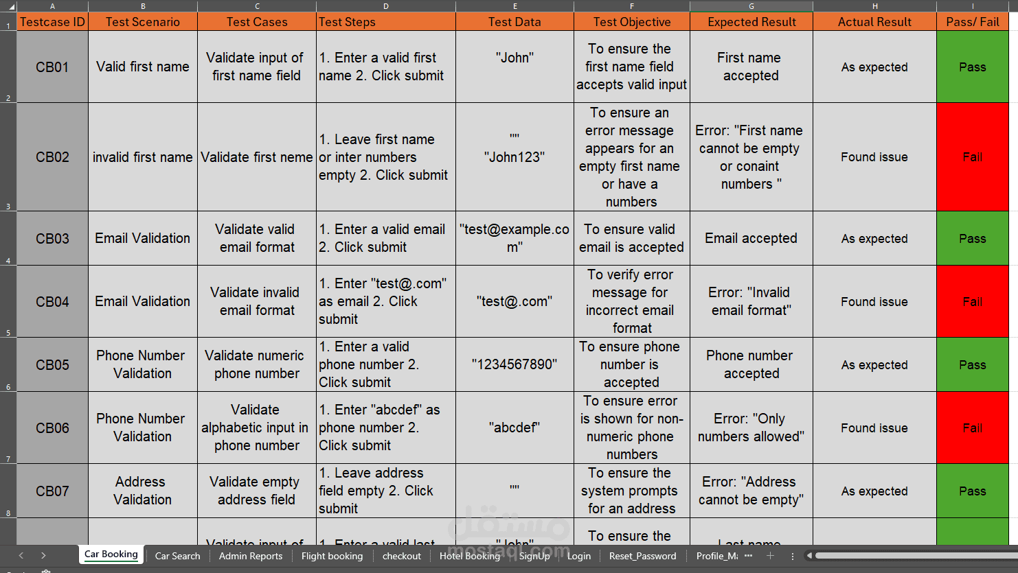 Form Validation Testing: Check all forms (sign-up, login, booking, contact, etc.) for proper input validation and error messages.
