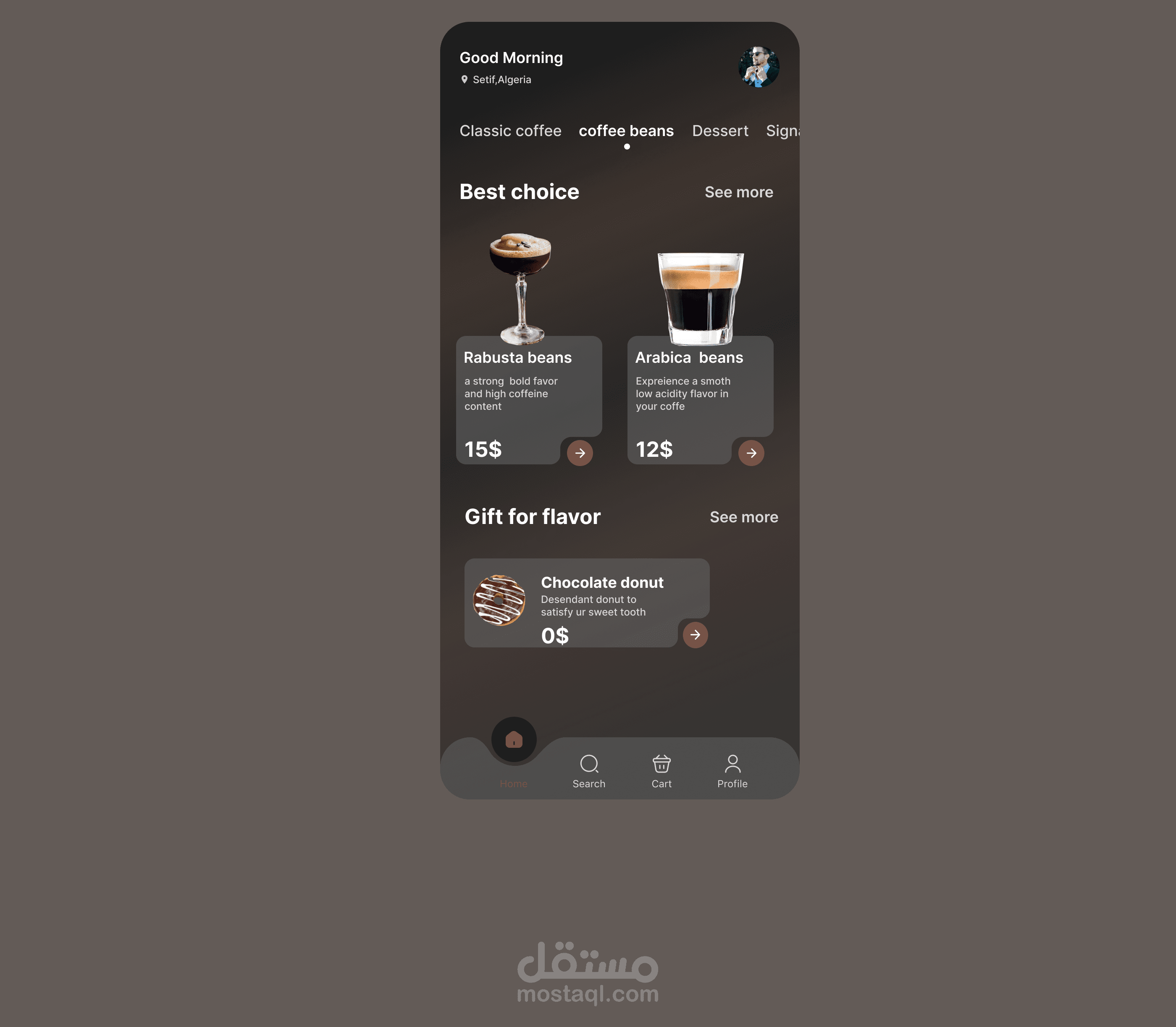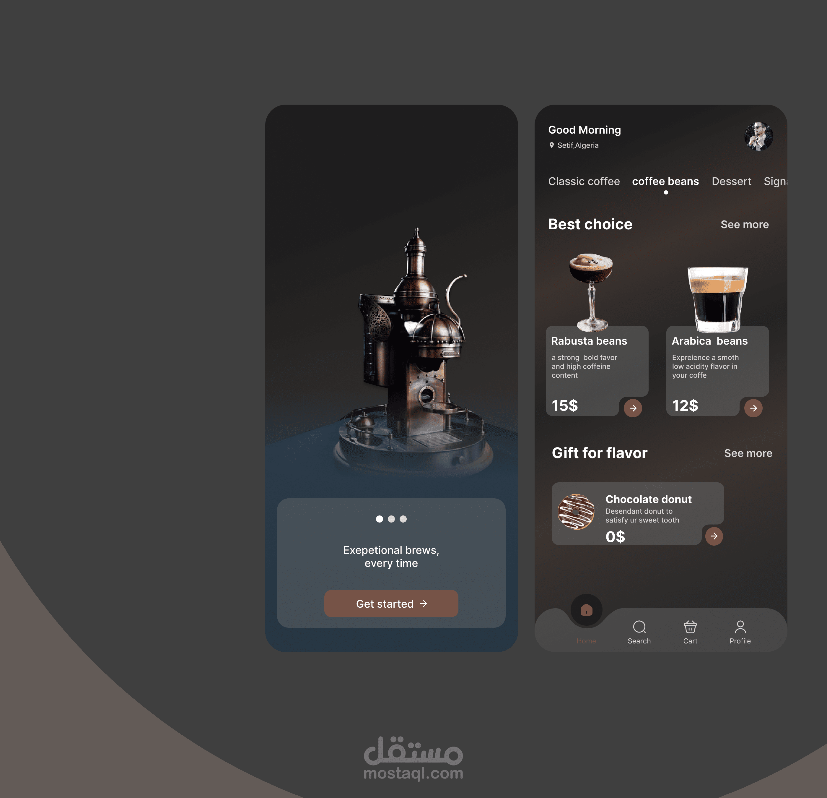 تطبيق صُمم لسلسلة مقاهي محلية يتيح للزبائن طلب القهوة أونلاين، استكشاف الفروع القريبة، والانضمام إلى برنامج ولاء رقمي يعزز من تجربة المستخدم.