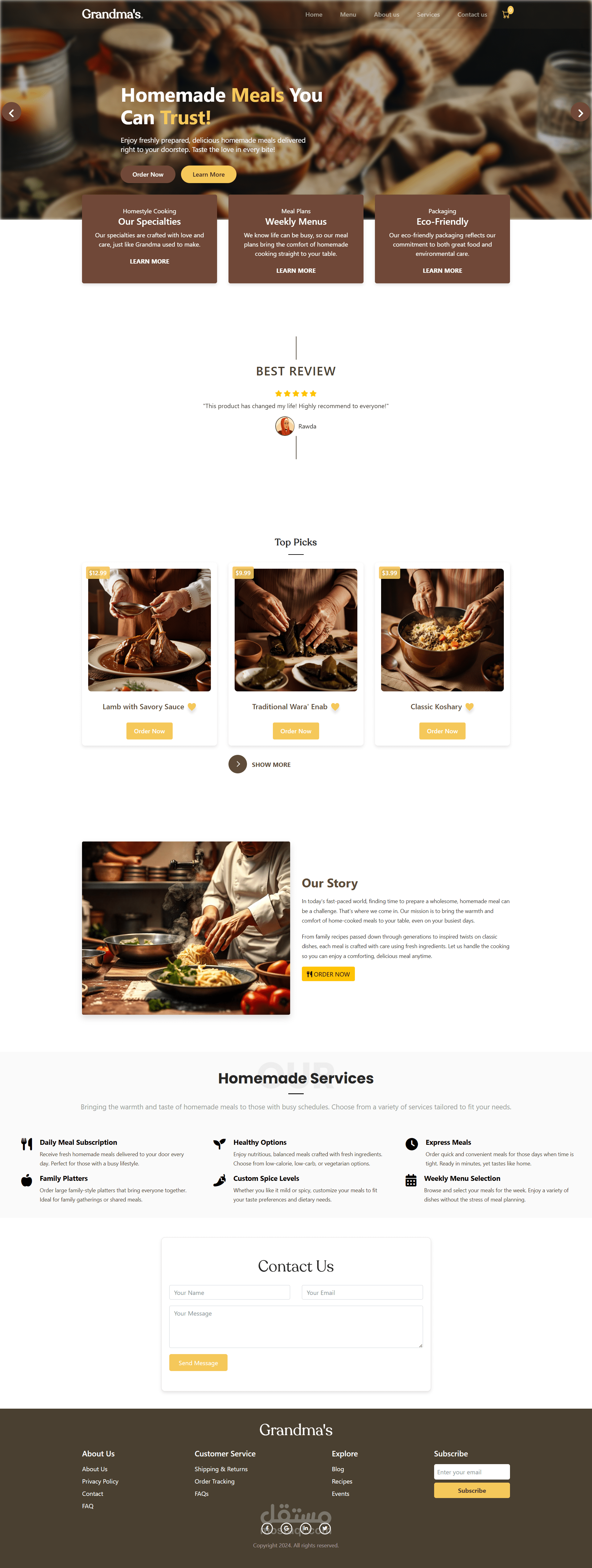 قمت بتطوير موقع Grandma's بهدف توصيل الأكل البيتي للأشخاص المغتربين أو اللي وقتهم مش بيسمح يطبخوا بنفسهم. الموقع بيعرض قائمة بالأكلات المتاحة، مع تفاصيل الأسعار والمكونات، وبيوفر تجربة طلب سهلة وسريعة.
