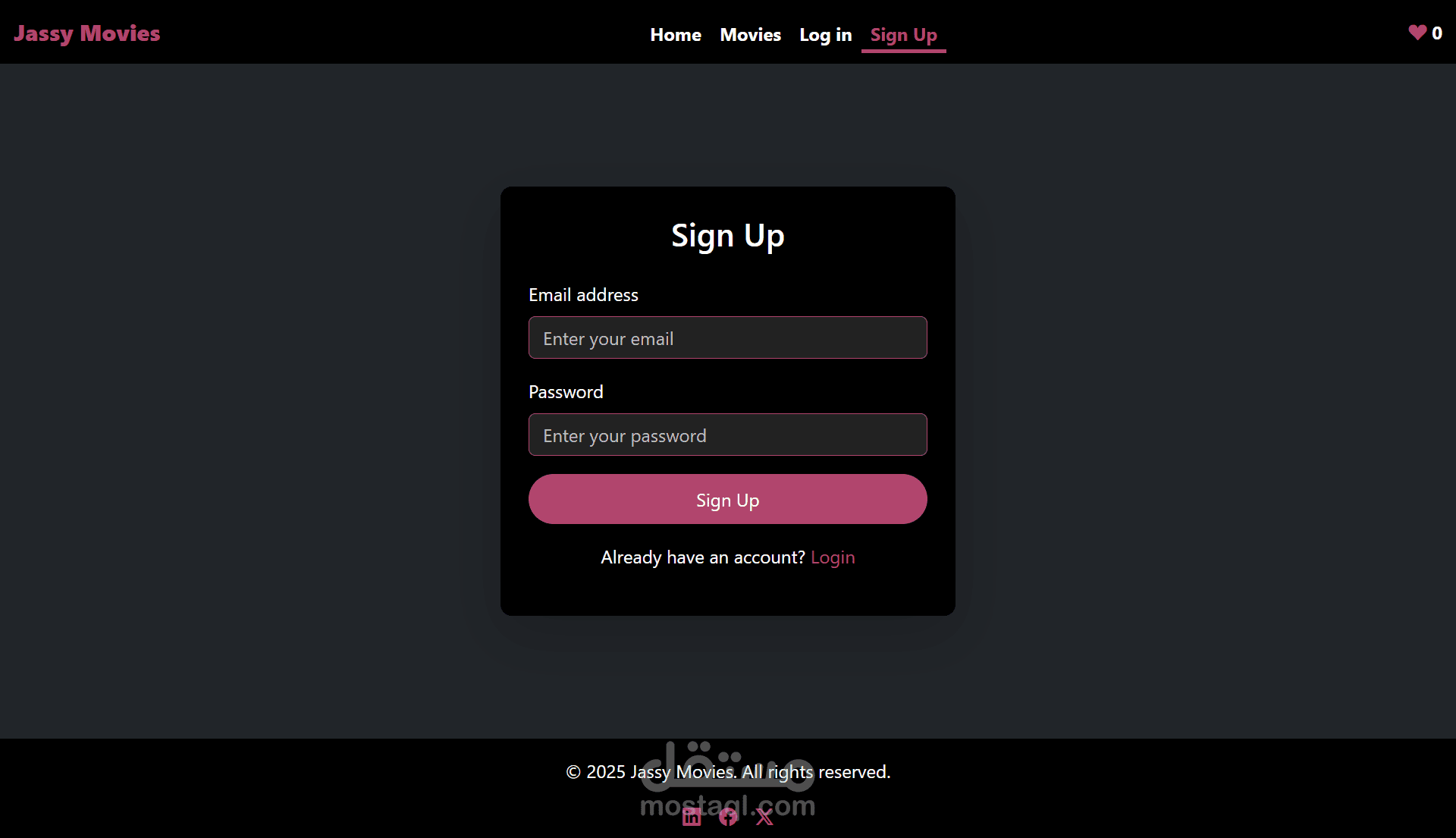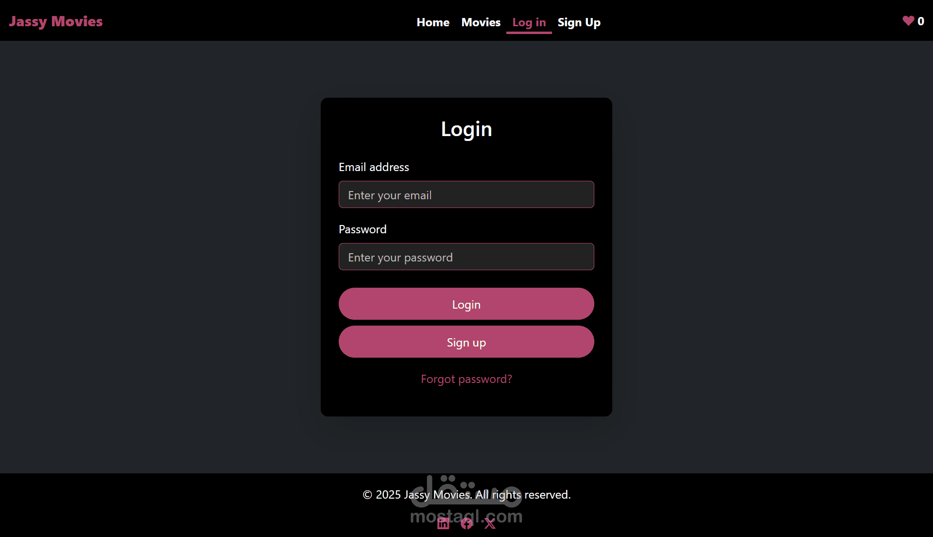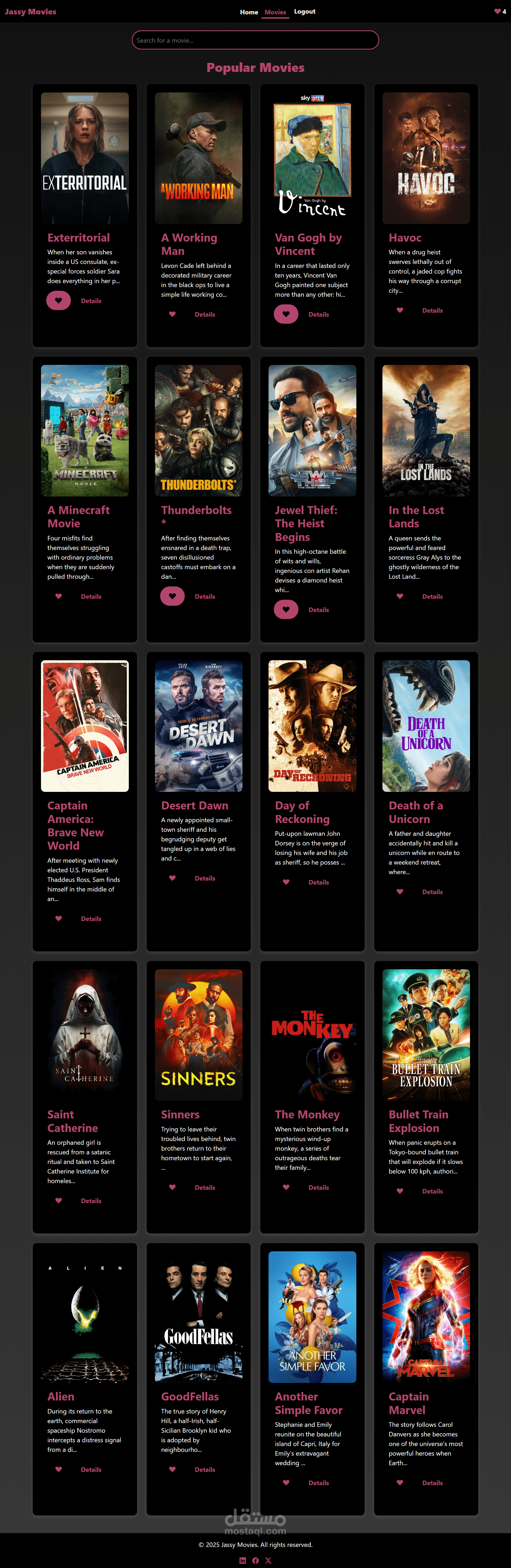 Jassy Movies هو تطبيق ويب تم تطويره باستخدام React JavaScript. يتيح للمستخدمين تصفّح مجموعة كبيرة من الأفلام التي يتم جلبها من API خارجي. يتميز التطبيق بواجهة نظيفة وسهلة الاستخدام، ويتضمن عدة صفحات، منها: