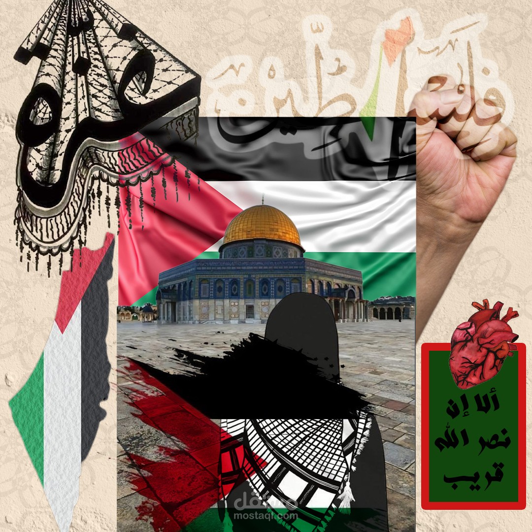 تصميم كولاج عن فلسطين مقاس 1080×1080 باستخدام برنامج ادوبي فوتوشوب حيث تم استخدام صور وايقونات تدل على الحرية والاستقلال بجانب علم فلسطين