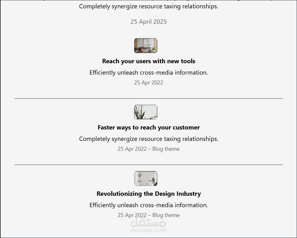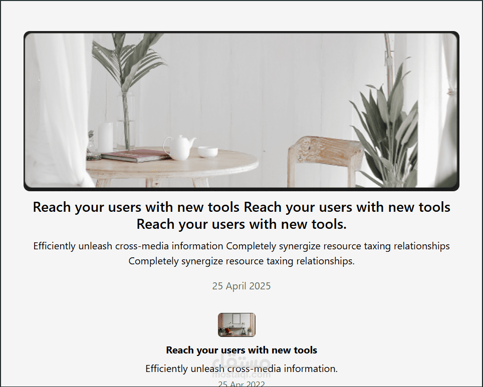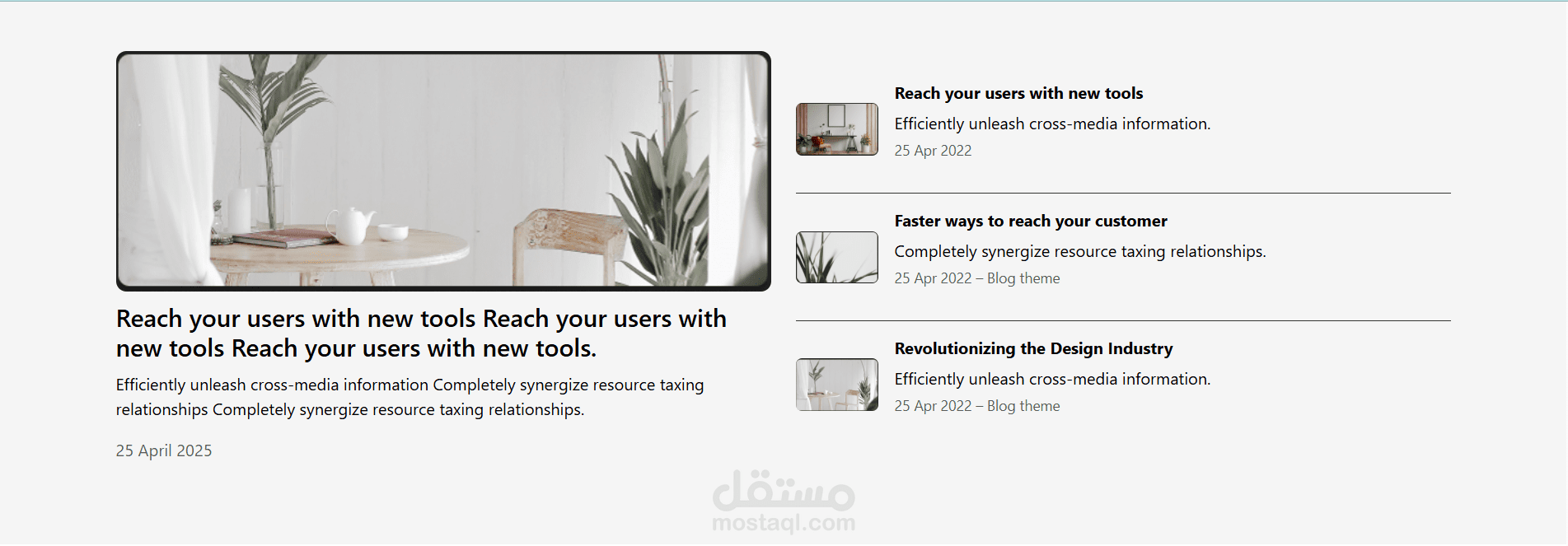 يتميز التصميم ببنية واضحة ومنظمة تسهل على الزوار اكتشاف المحتوى الجديد، مع عرض مرئي جذاب للصور وعناوين المقالات. تم الاهتمام بالتفاصيل لضمان سهولة التصفح وقراءة مريحة للمحتوى. يوفر استخدام Bootstrap أيضًا مرونة عالية في التخصيص وإمكانية الدمج بسهولة مع مختلف أنظمة إدارة المحتوى.