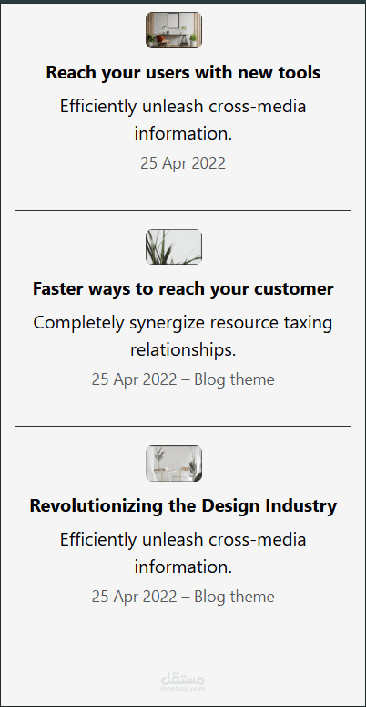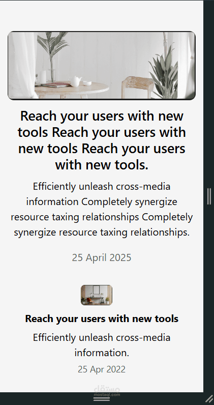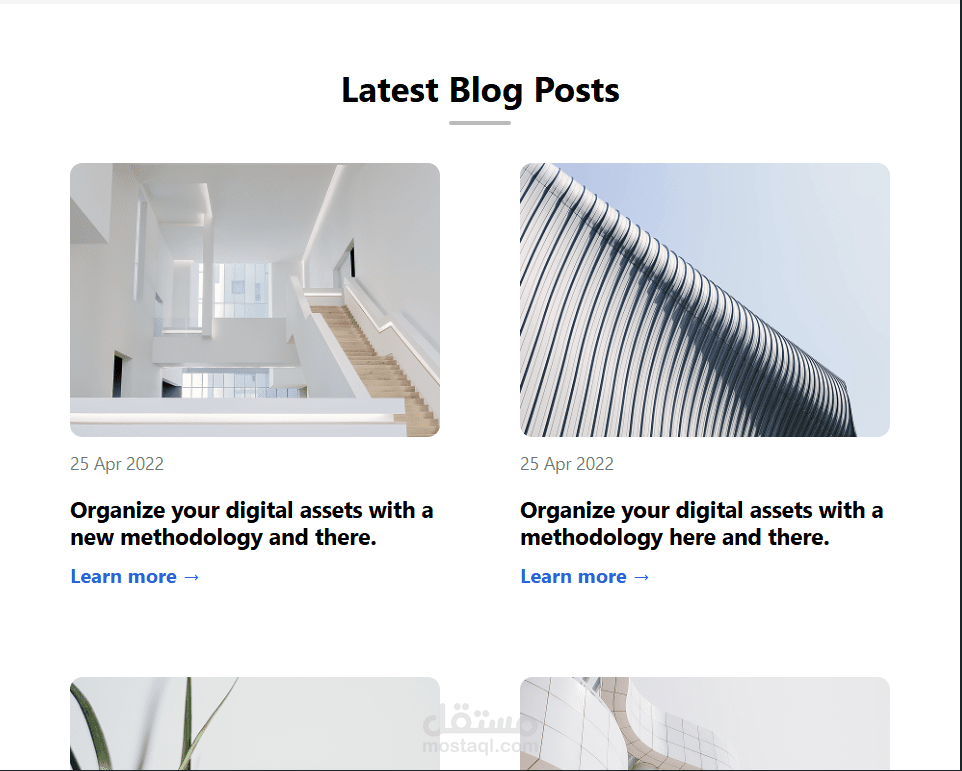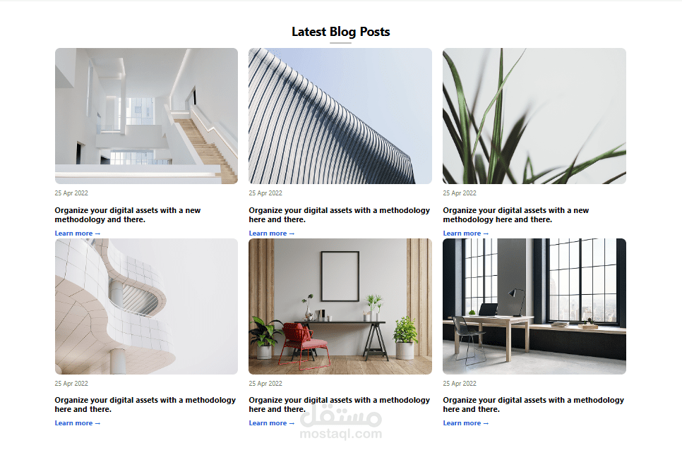 قمت بتصميم واجهة عرض احترافية وجذابة لأحدث المقالات والتدوينات، مع التركيز على توفير تجربة مستخدم مثالية على جميع الأجهزة. تم تطوير هذا التصميم باستخدام إطار عمل Bootstrap القوي والمرن، مما يضمن توافقًا كاملاً وتصميمًا متجاوبًا يتكيف بسلاسة مع أحجام الشاشات المختلفة (Responsive Design).