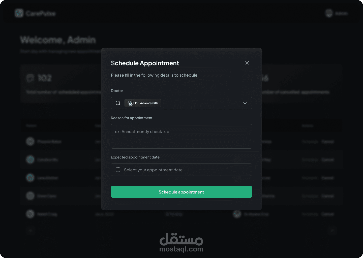 لوحة تحكم للطبيب لإدارة المواعيد وعرض معلومات المرضى.