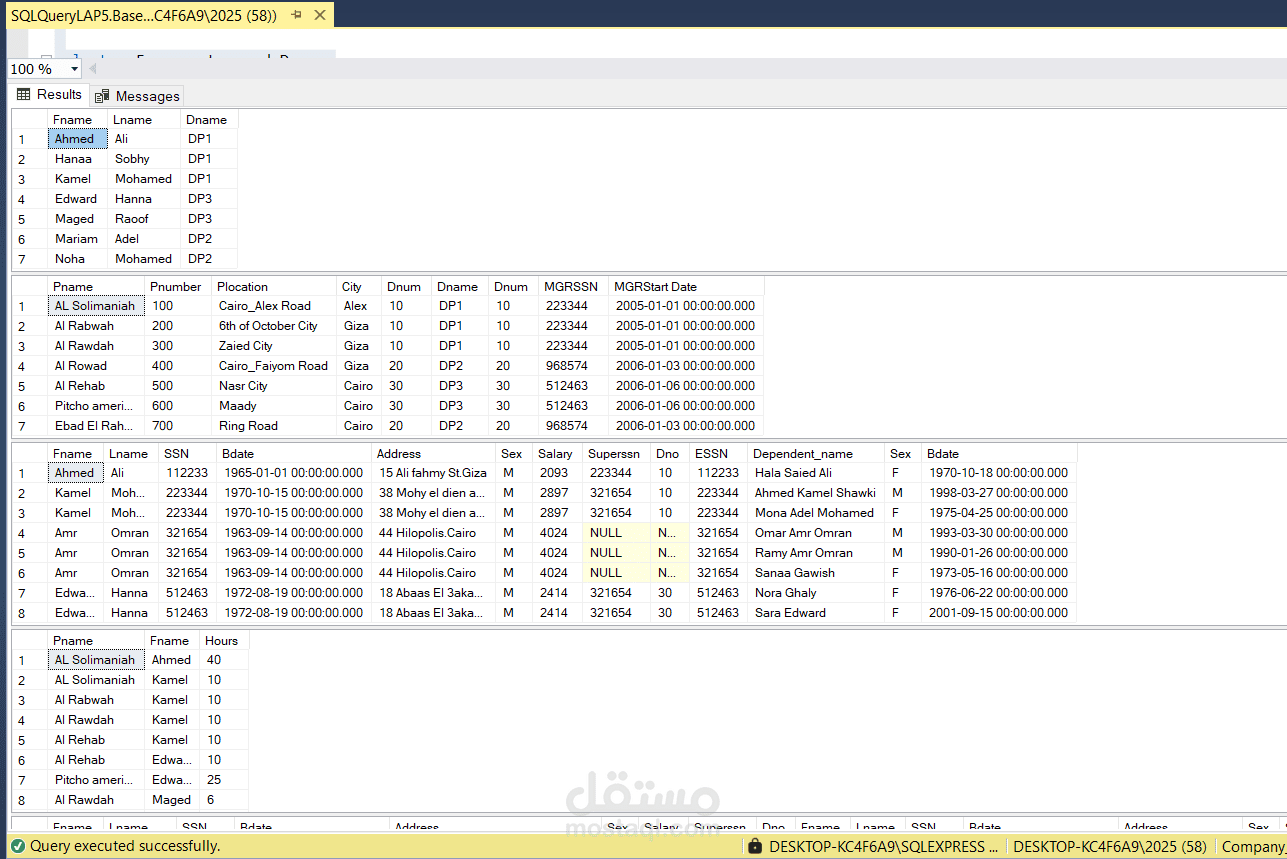 This image displays the result of an SQL query from a database containing multiple tables related to employees, facilities, and departments. It includes: