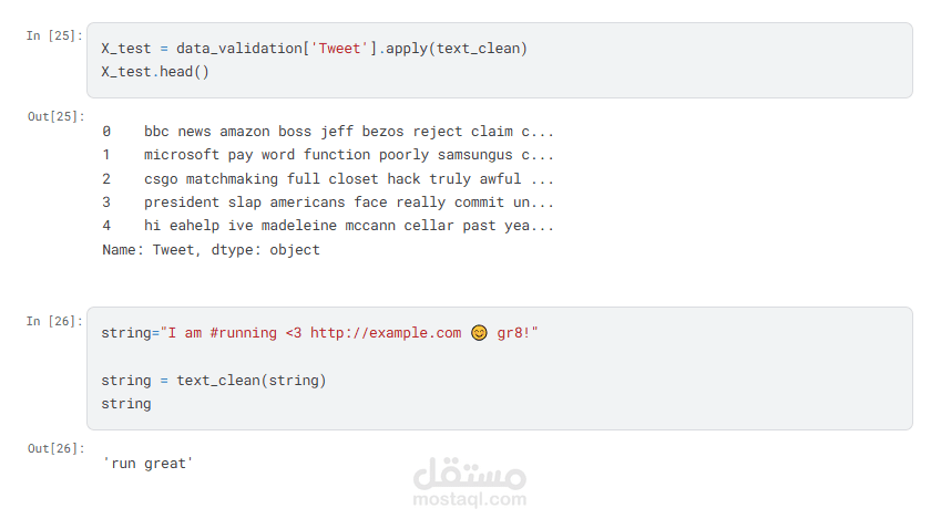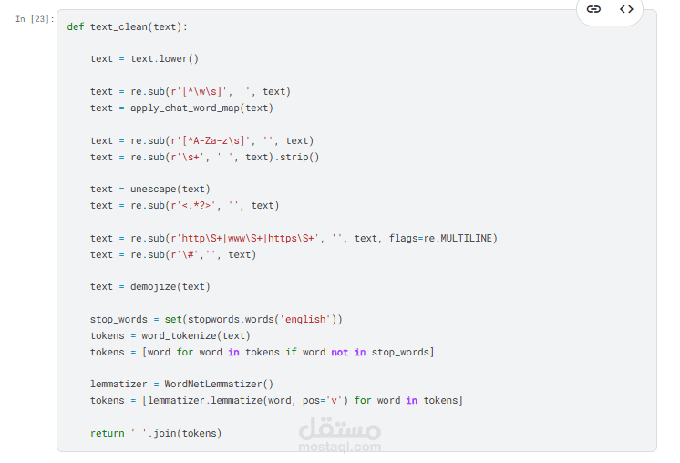 * تنظيف ومعالجة التغريدات (إزالة الضوضاء، الكلمات الشائعة، تطبيق Stemming، وغيرها)