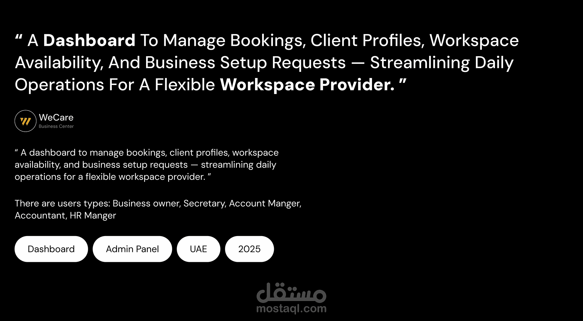“ A dashboard to manage bookings, client profiles, workspace availability, and business setup requests — streamlining daily operations for a flexible workspace provider. ”
