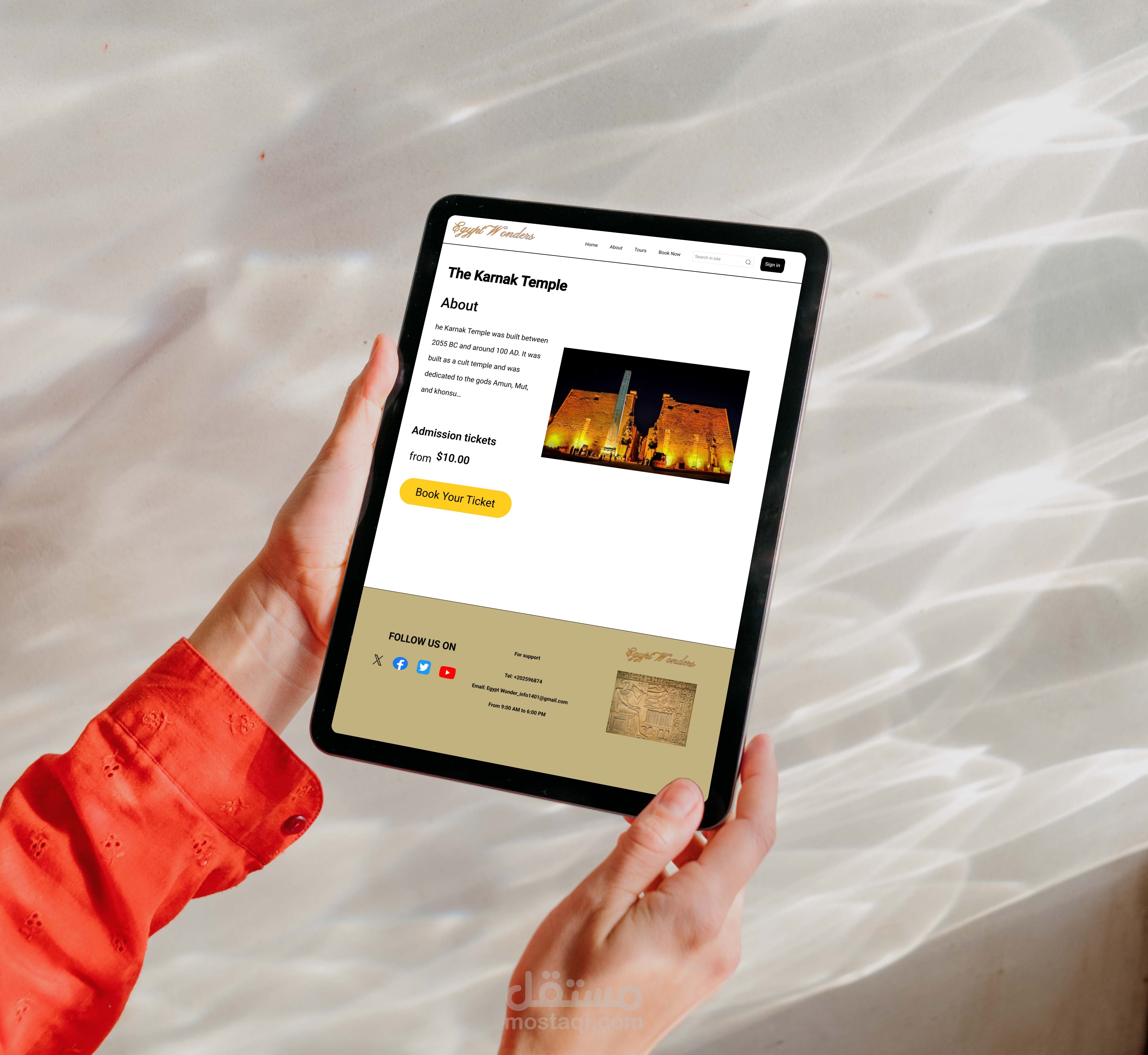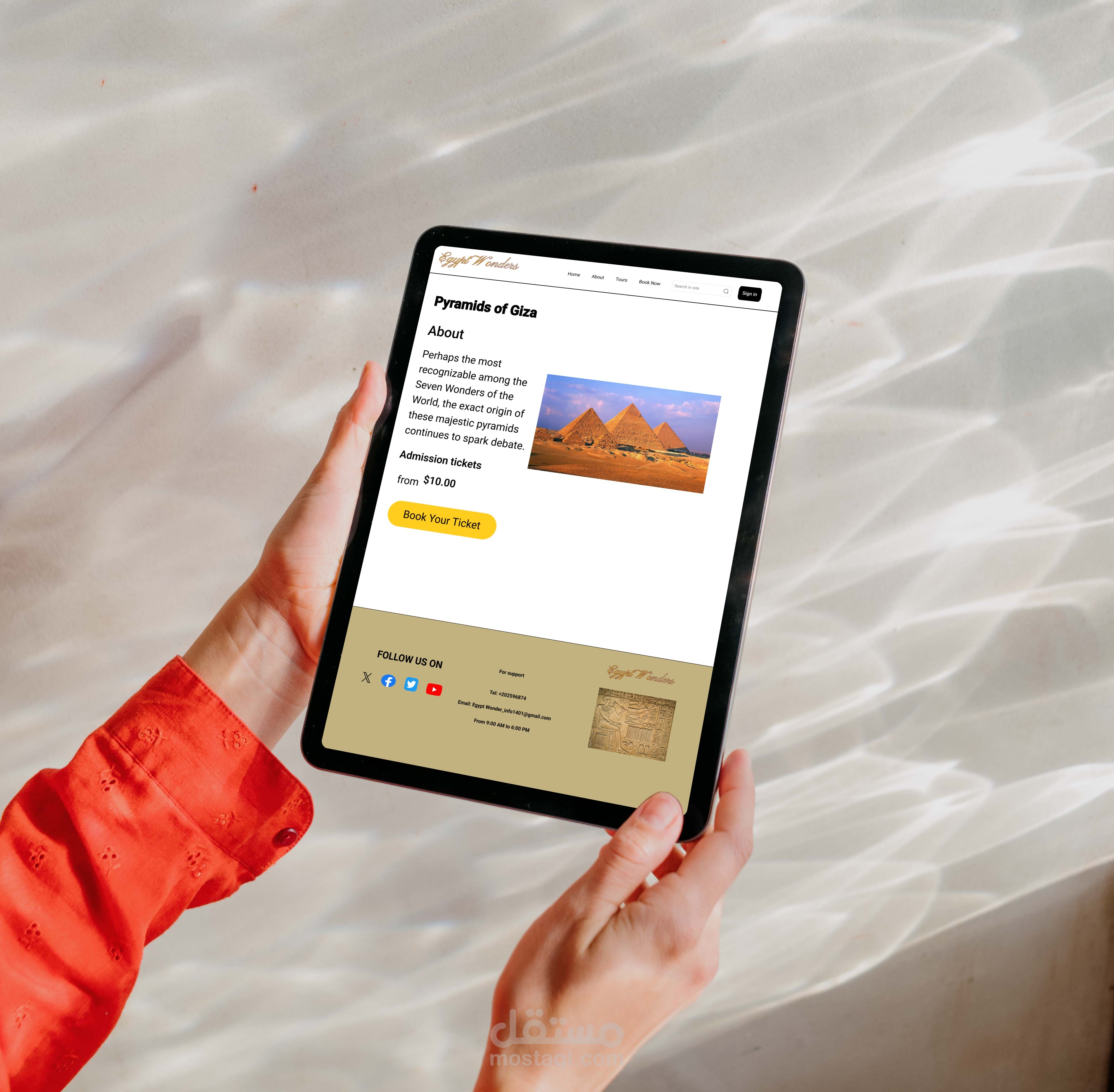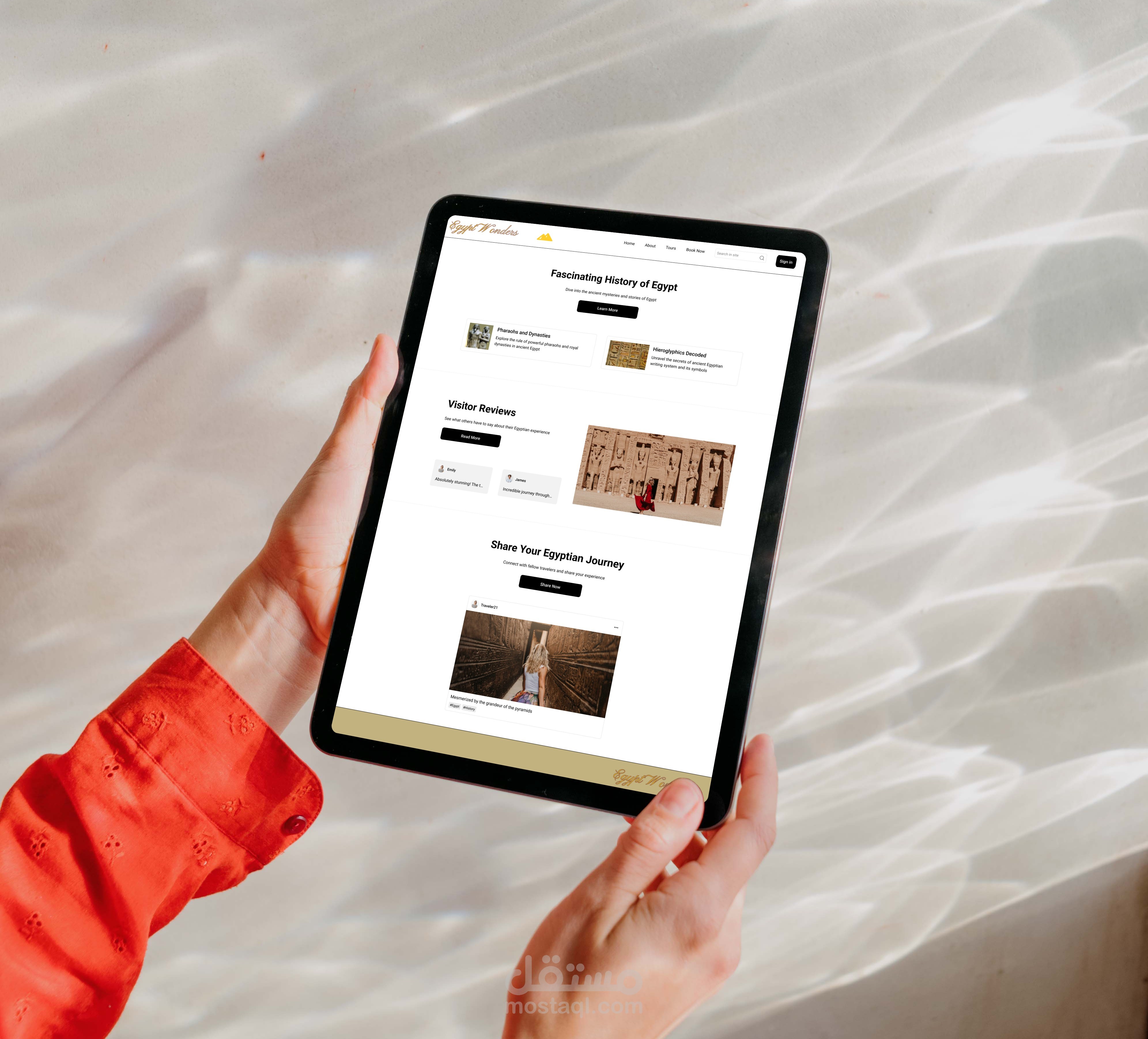 موقع سياحي متكامل لعرض المعالم المصرية مثل الأهرامات ومعابد الأقصر وآثار القاهرة، مع نظام حجز تذاكر إلكتروني.