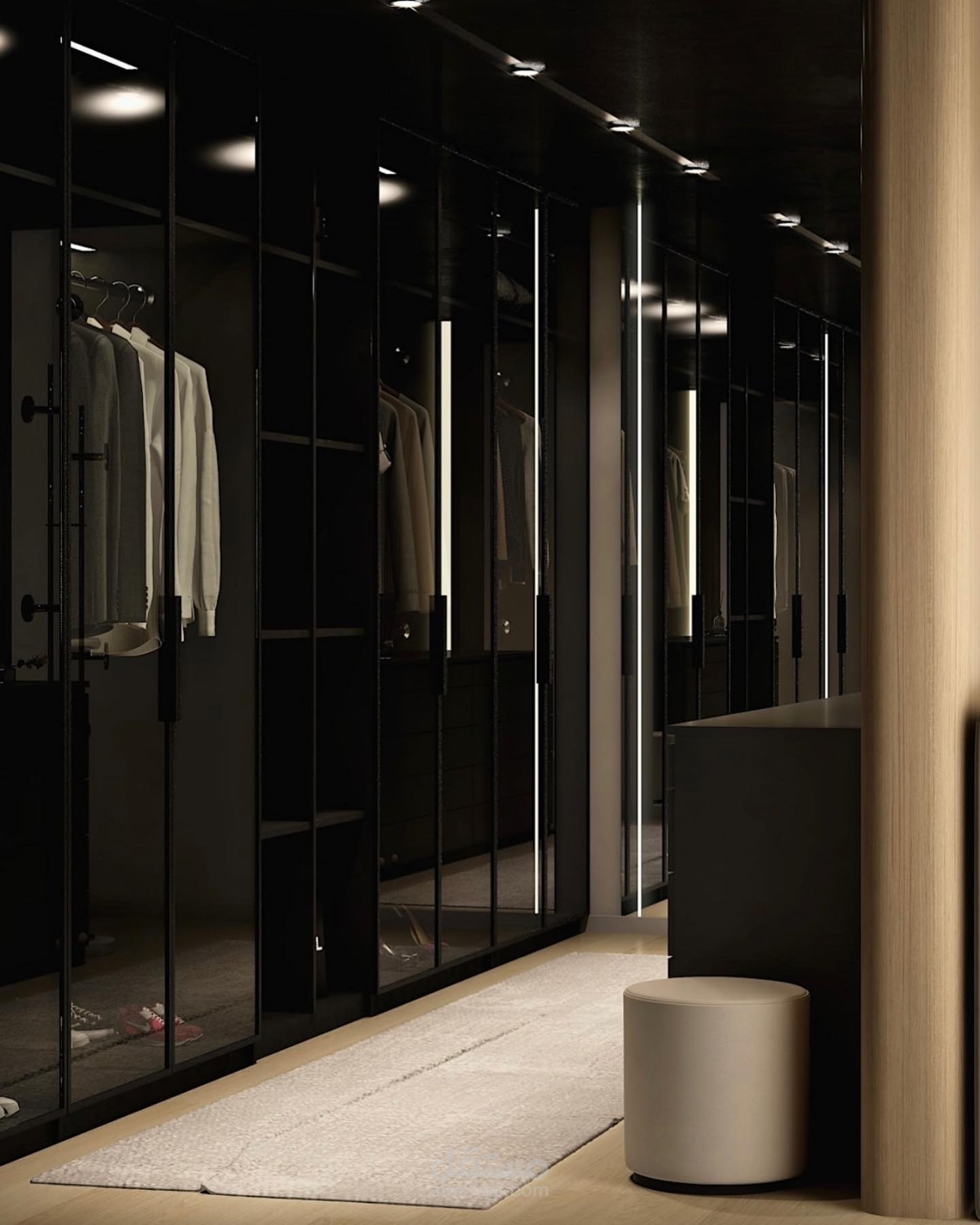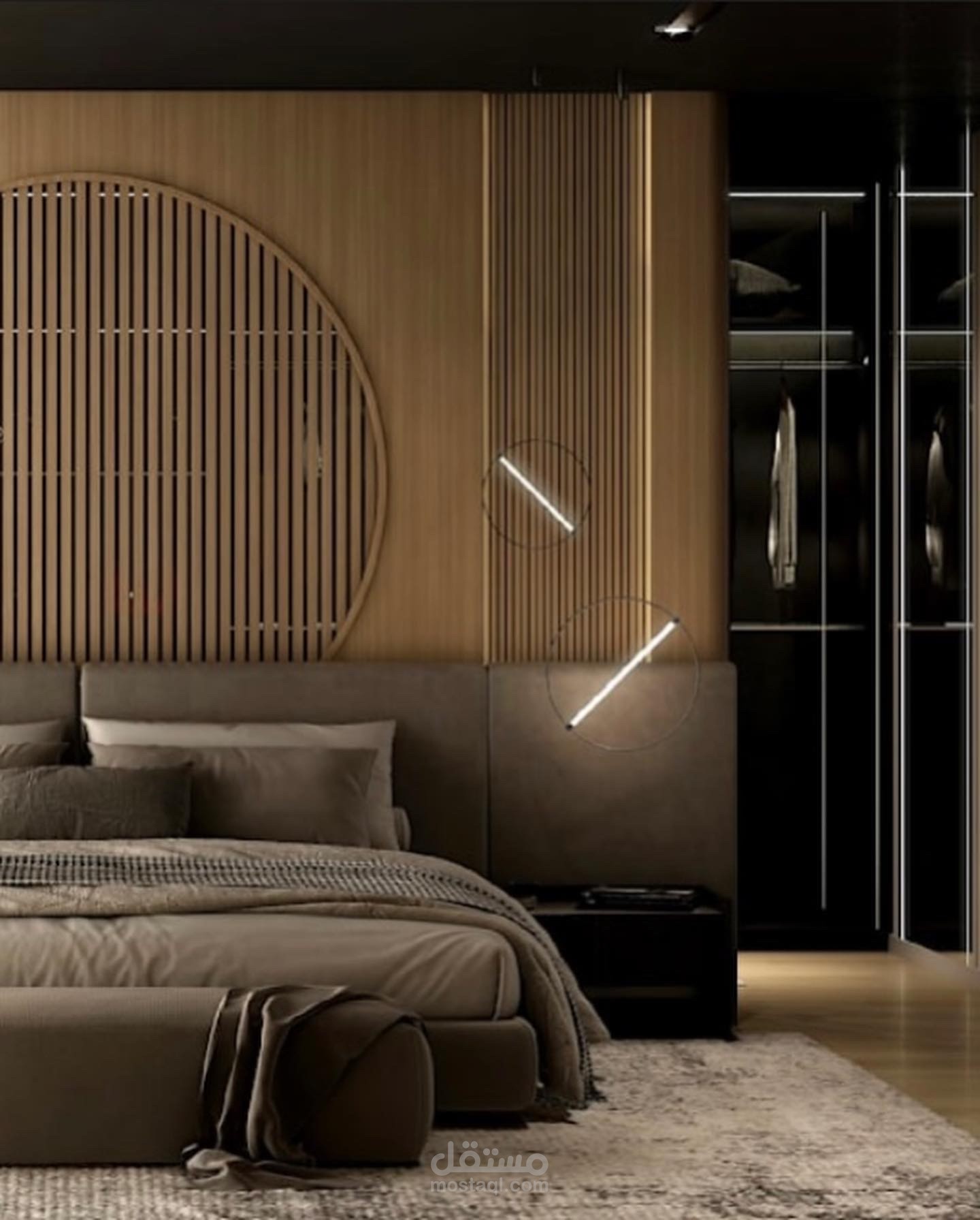 تصميم أنيق يعكس الفخامة والدفء، حيث تبرز الجدران الخشبية المتناسقة بنمط شرائحي عمودي ودائري يضيف لمسة فنية راقية. السرير المريح بألوان البيج الناعمة يعزز الشعور بالهدوء، فيما تضفي الخزانة الزجاجية لمسة عصرية تكشف عن تفاصيل مرتبة وأنيقة. الإضاءة الطبيعية تكمل المشهد، مما يجعل المساحة مزيجًا مثاليًا من الراحة والجمال الحديث.