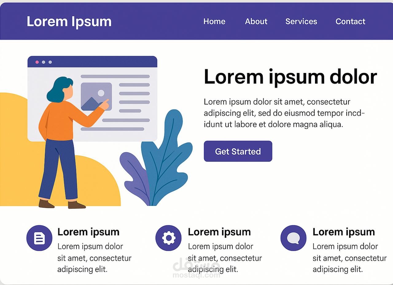 This webpage appears to be a template for a business or service website. It features a clean and modern design with a hero section including a title "Lorem ipsum dolor," a short descriptive text, and a "Get Started" button. The navigation bar includes "Home," "About," "Services," and "Contact." Below the hero section, there are three sections with placeholder text "Lorem ipsum" and brief descriptions, likely intended to highlight key features or services. The overall impression is a simple and professional layout for a company website.