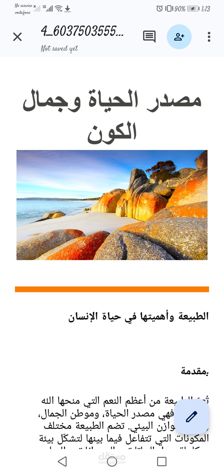 يتناول هذا البحث الشامل مفهوم الطبيعة وأهميتها في حياة الإنسان من مختلف الجوانب، بما في ذلك عناصرها، وتأثيرها النفسي، ودورها الاقتصادي والبيئي. كما يناقش المشكلات البيئية الناتجة عن الإضرار بالطبيعة، ويقترح طرقًا فعالة للحفاظ عليها من خلال التشجير، التدوير، التوعية، وسن القوانين. يُعد هذا البحث دعوة لاحترام البيئة وتعزيز الوعي البيئي لدى الأفراد والمجتمعات.تم إعداد هذا البحث باستخدام برنامج Microsoft Word