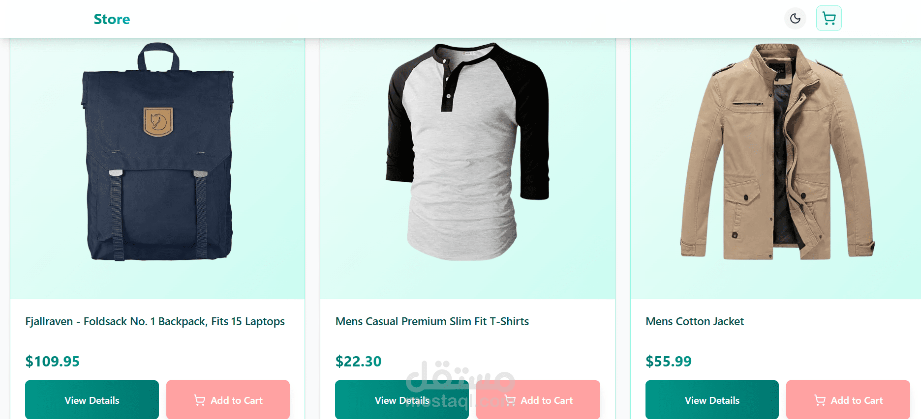 أزرار تفاعلية: "View Details" و "Add to Cart".