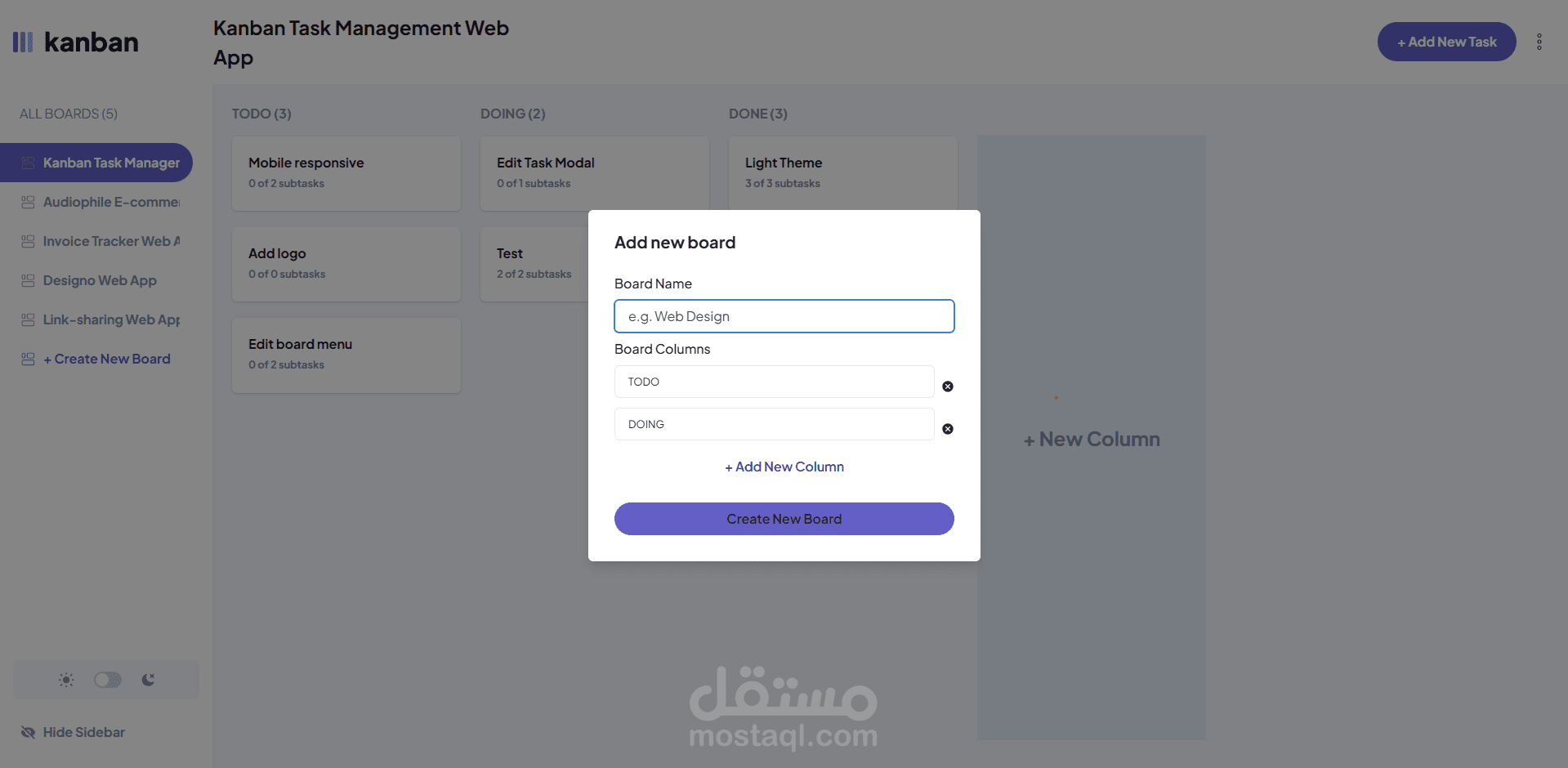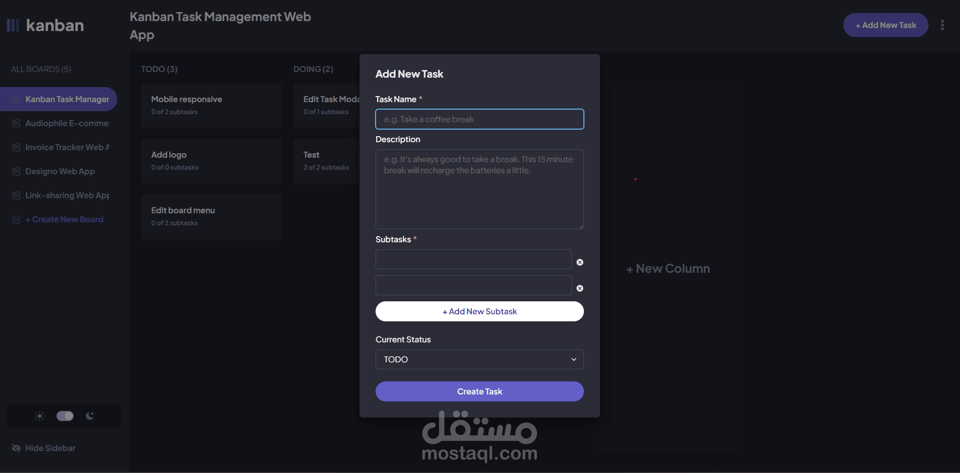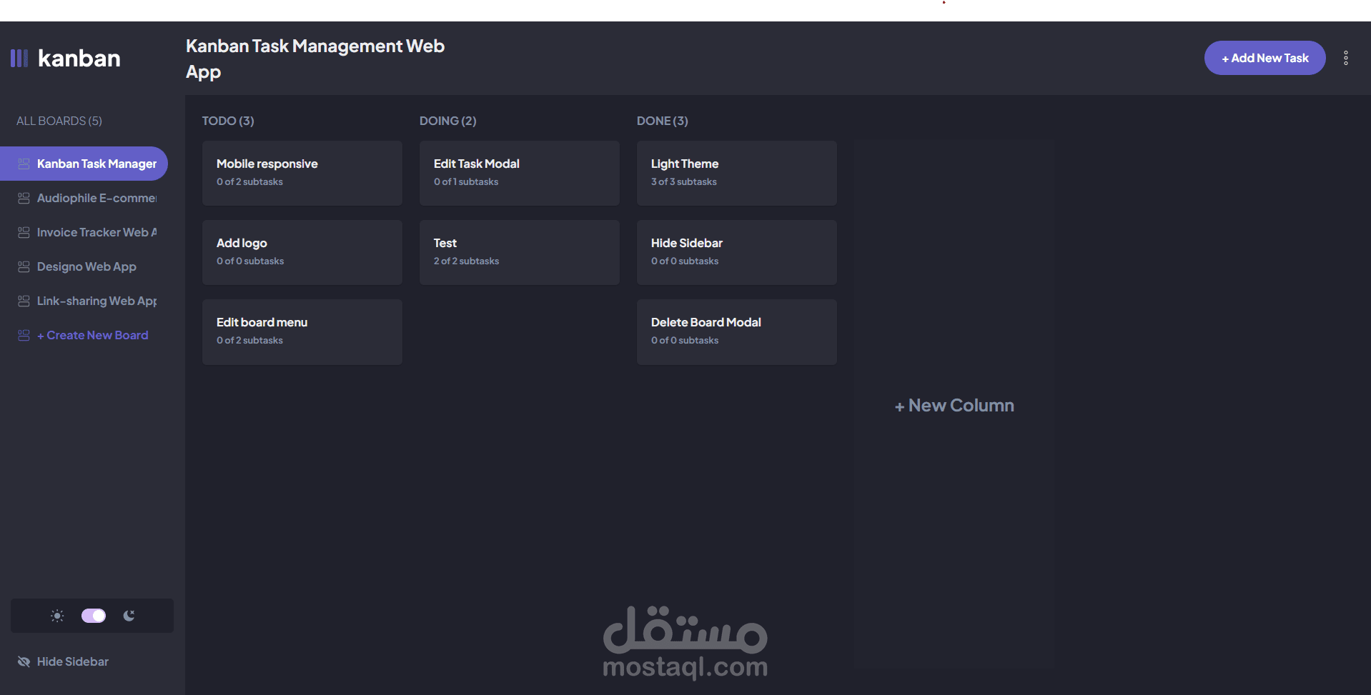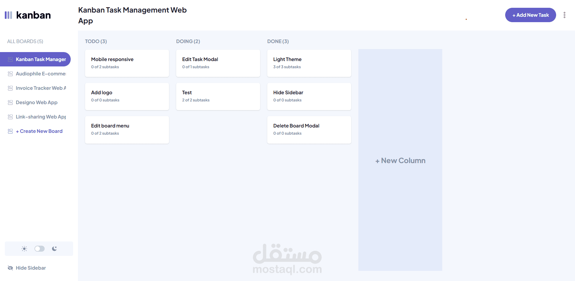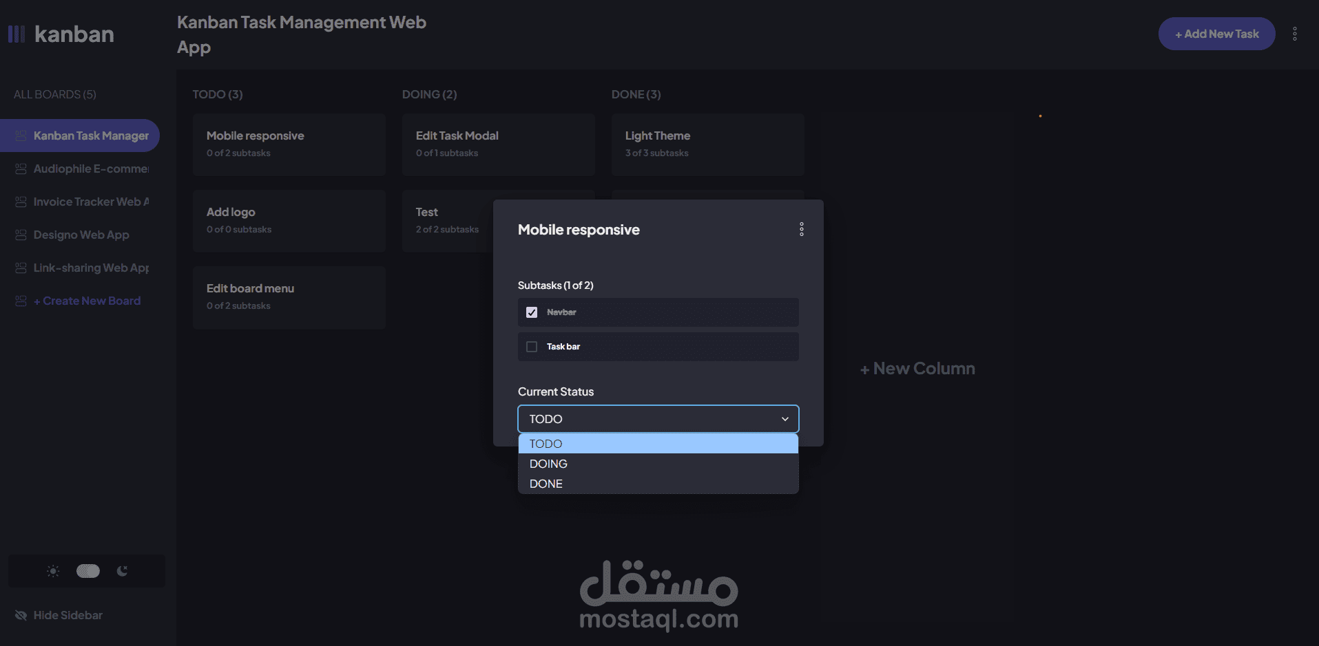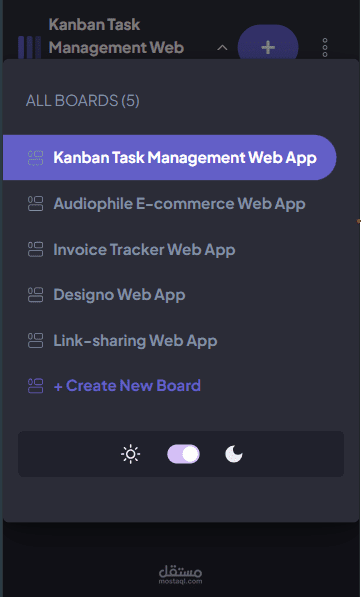 إدارة المهام: إضافة المهام، حذفها، ووضع علامة "تم الإنجاز" عليها داخل كل لوح.