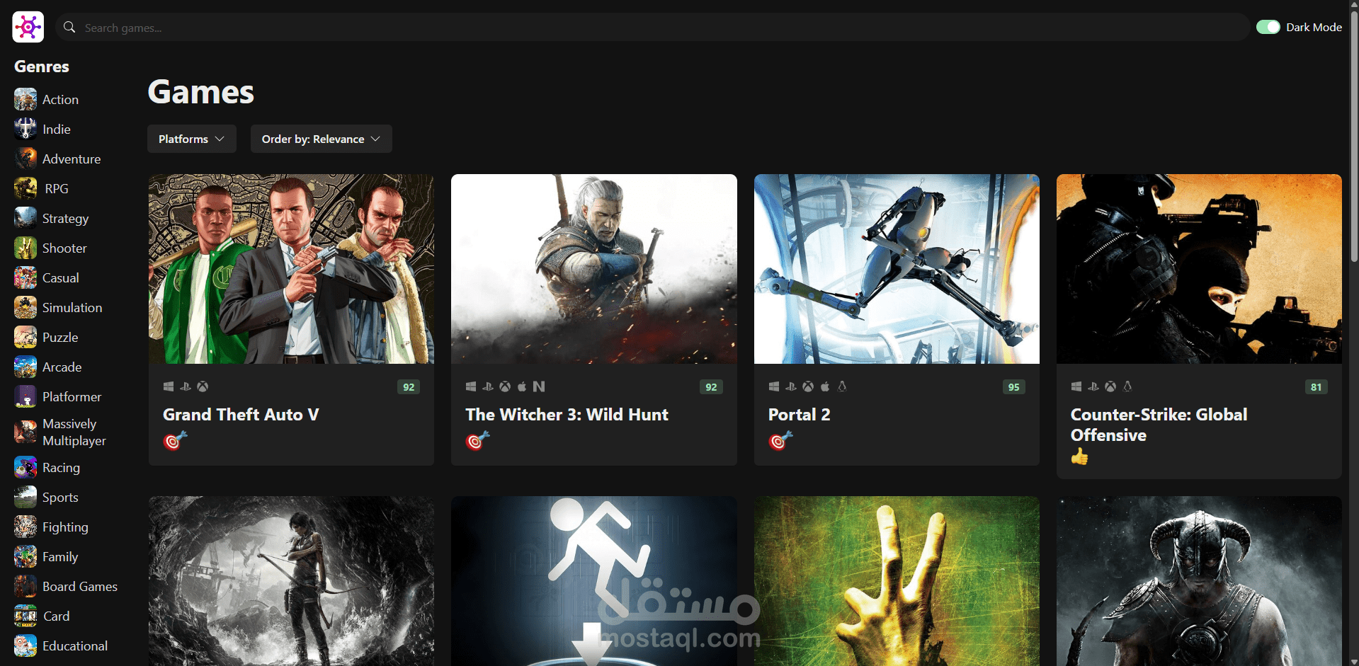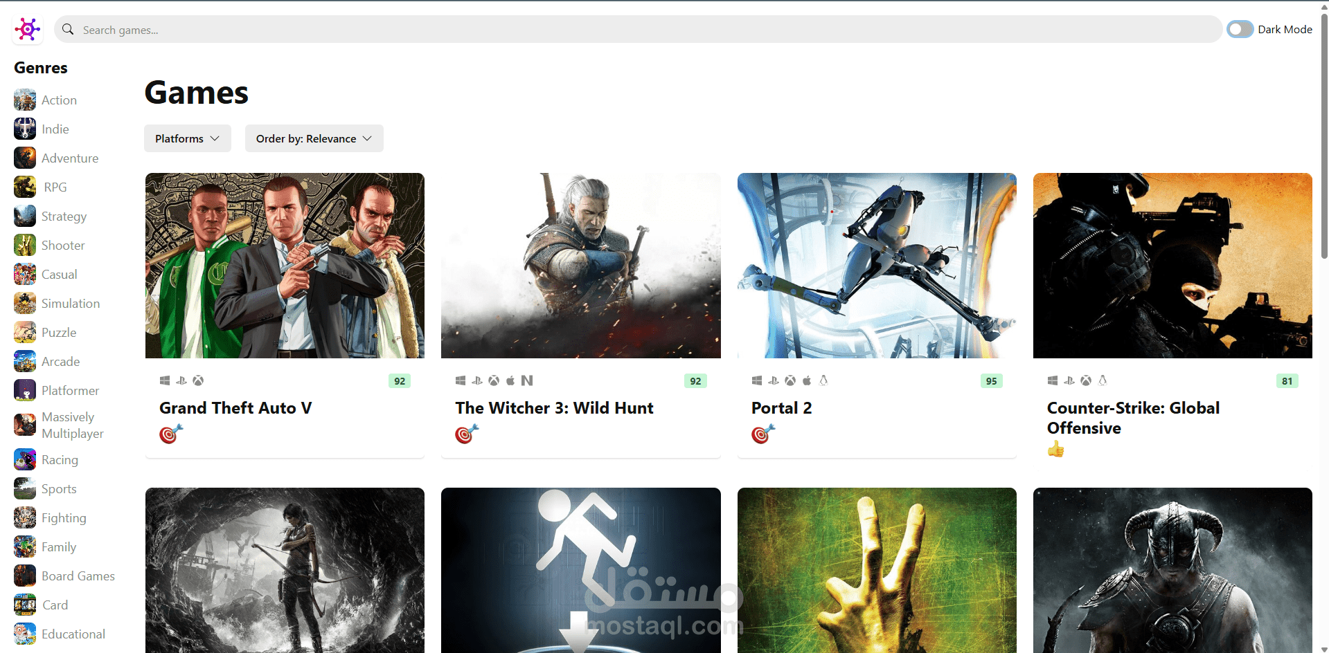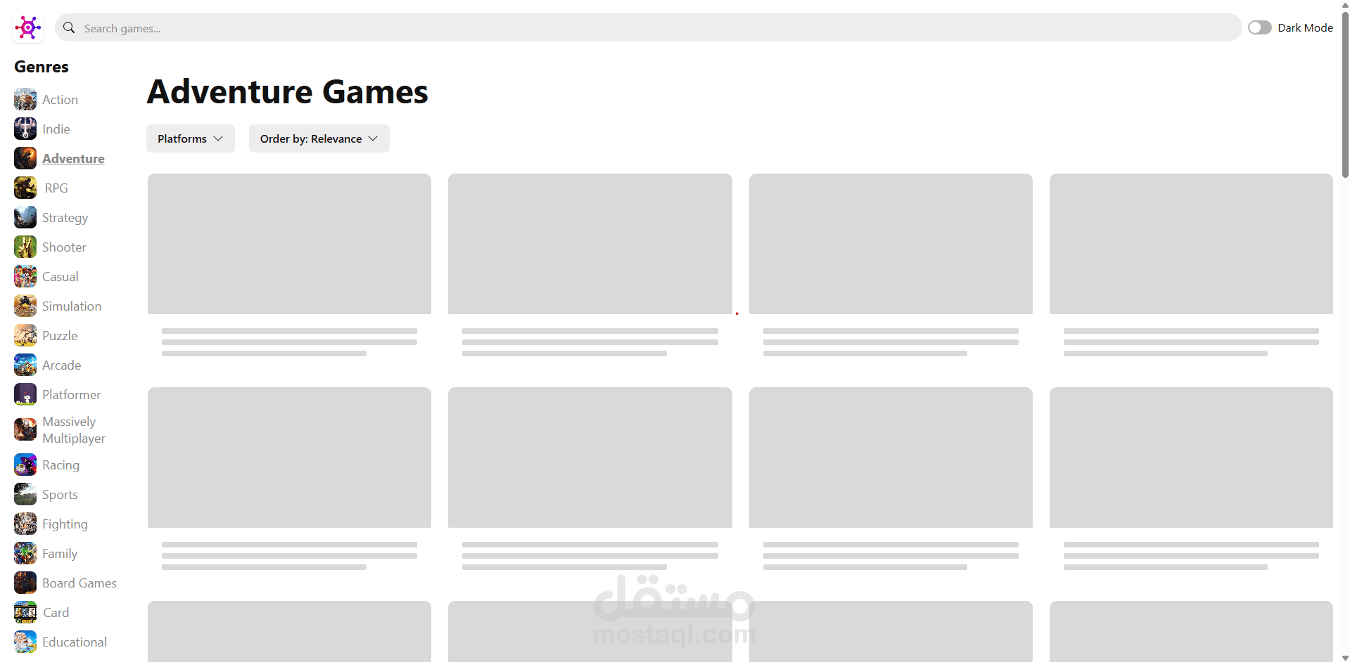 تطبيق ويب تفاعلي تم تطويره باستخدام React و TypeScript مع تصميم أنيق باستخدام Chakra UI، ويعتمد على واجهة برمجة التطبيقات rawg.io لجلب بيانات الألعاب من الخلفية.