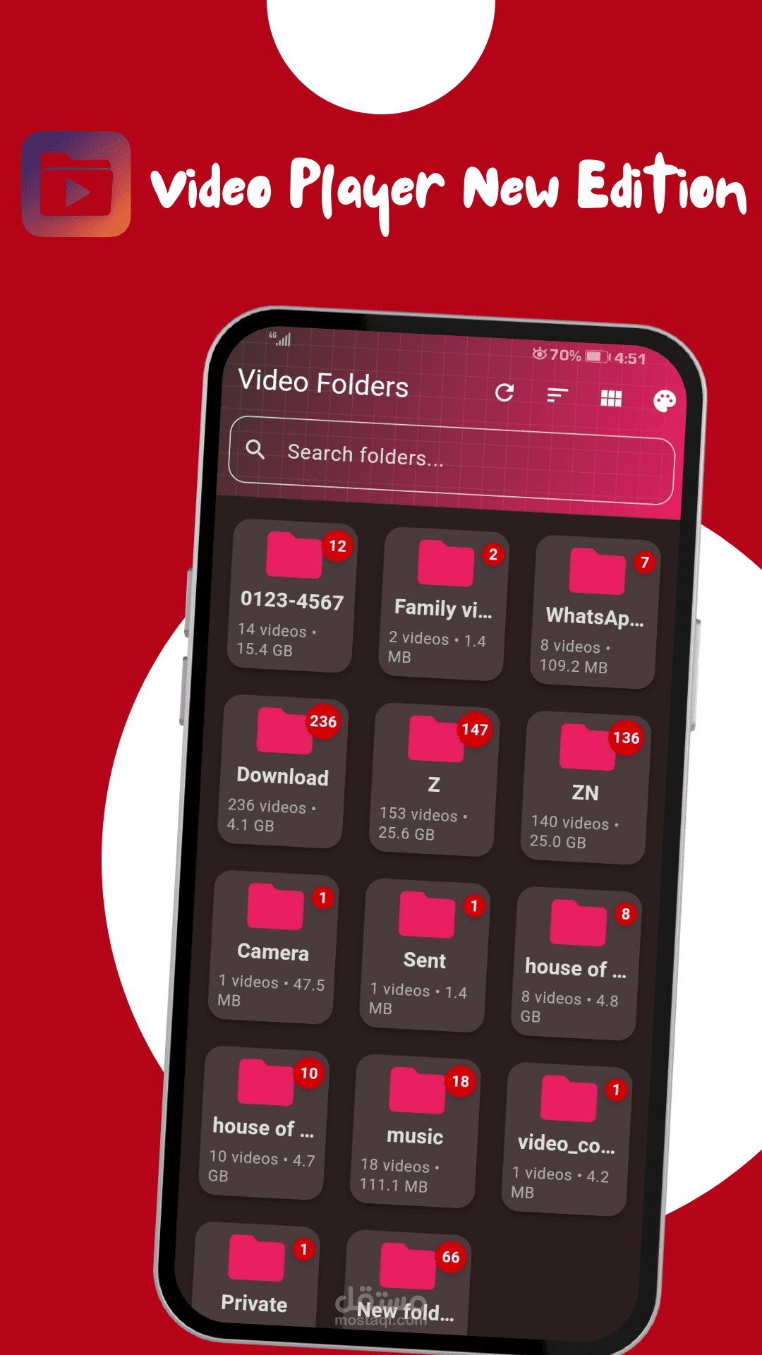 سحر المجلدات: التطبيق بينقّب في موبايلك (زي Movies، Downloads أو Videos) ويرتب الفيديوهات في مجلدات منظمة. وداعًا للتمرير اللامتناهي!