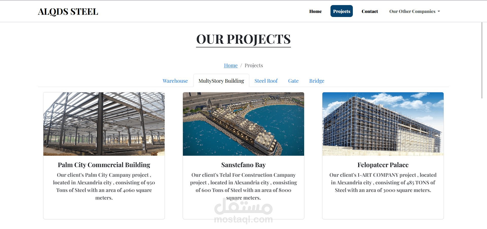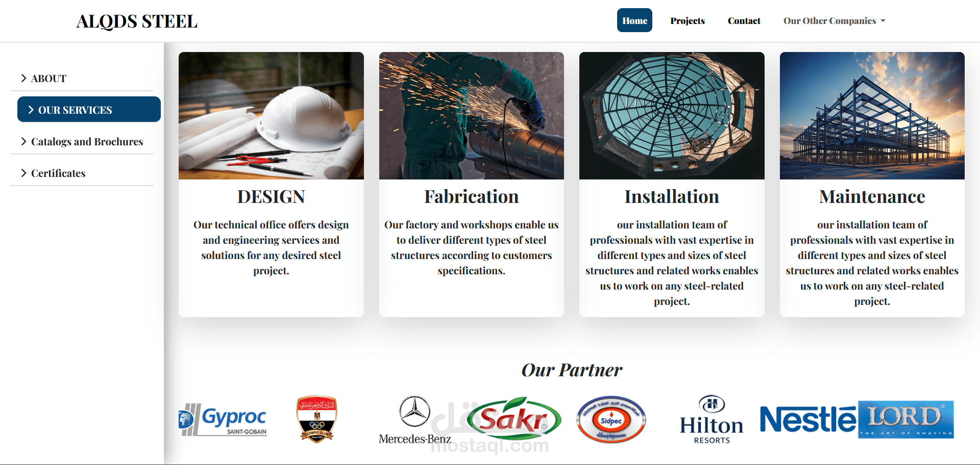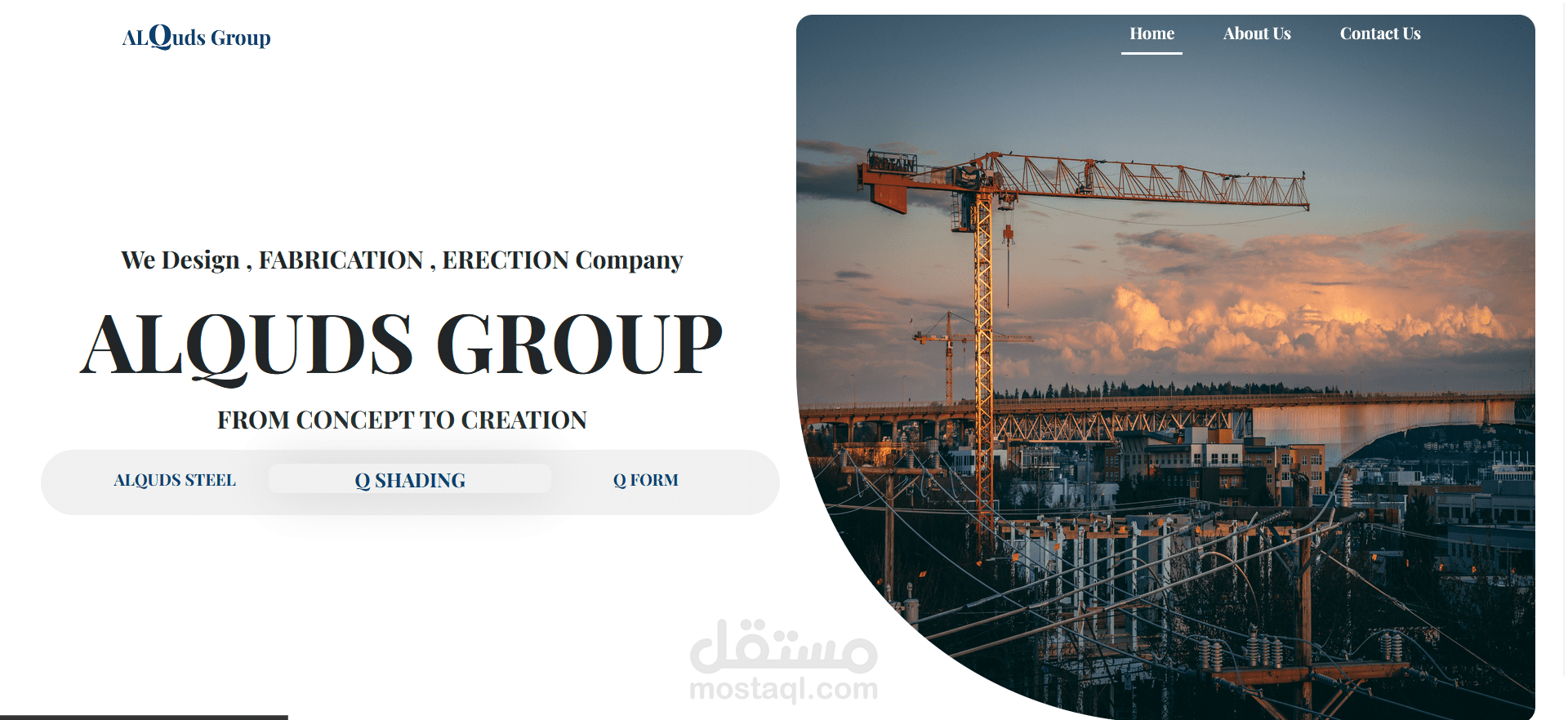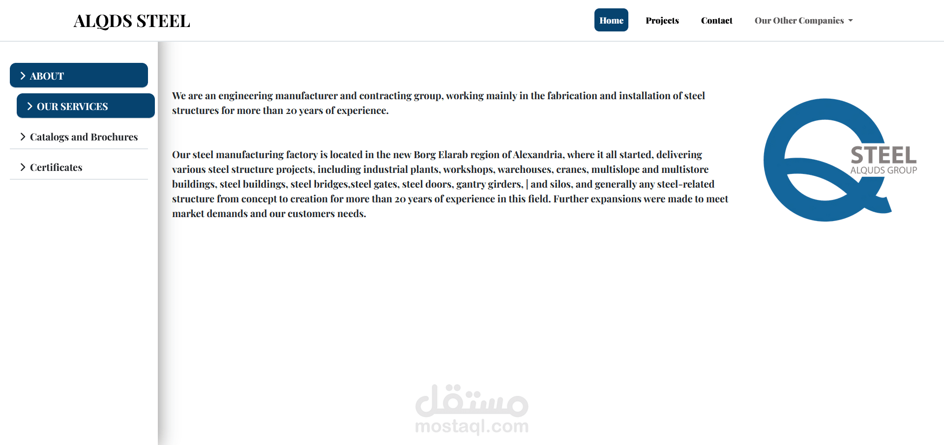 هذا المشروع هو موقع إلكتروني متكامل لمجموعة القدس (ALQUDS GROUP)، وهي شركة متخصصة في تصميم وتصنيع وإنشاء الهياكل الحديدية. تم تطوير الموقع باستخدام إطار عمل Angular لإنشاء واجهة أمامية ديناميكية وسريعة الاستجابة.