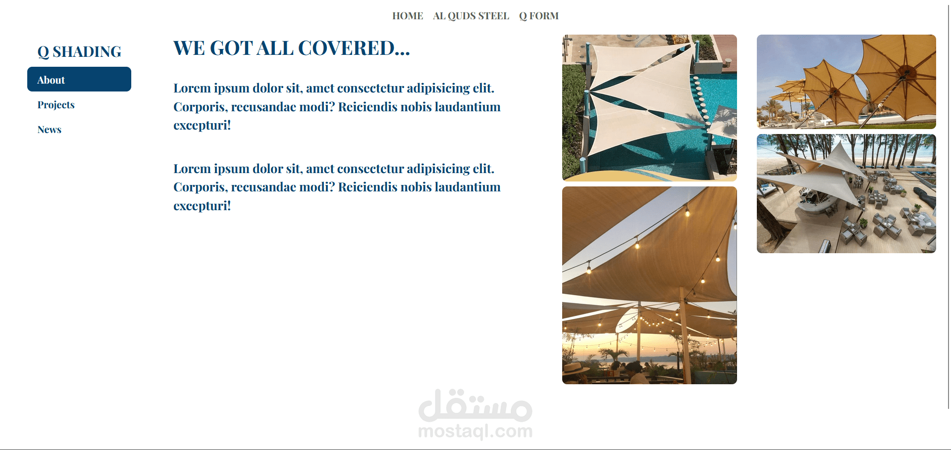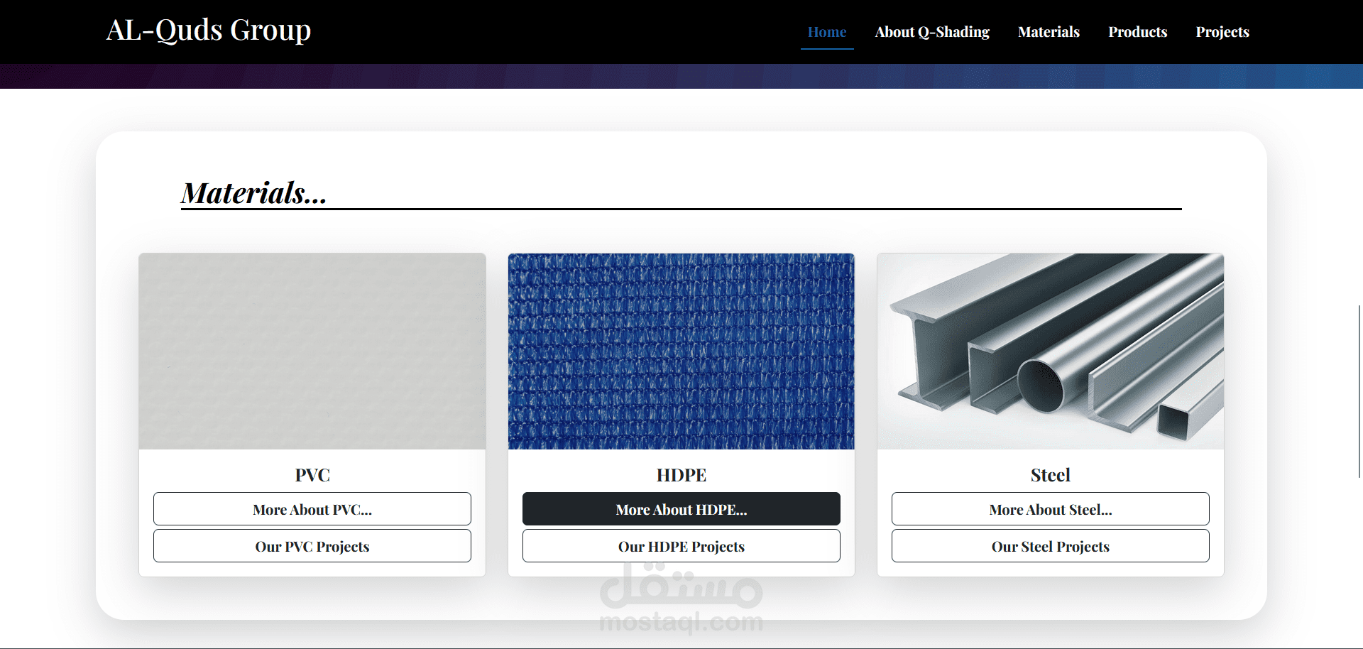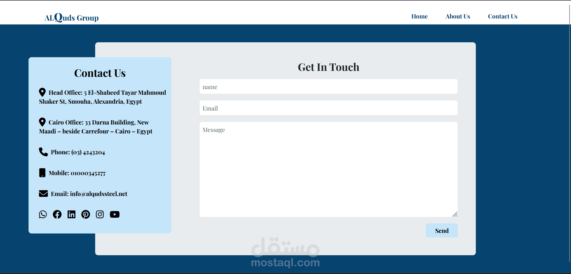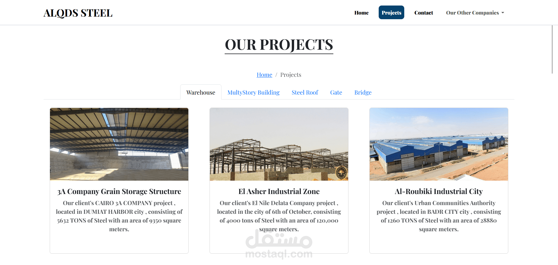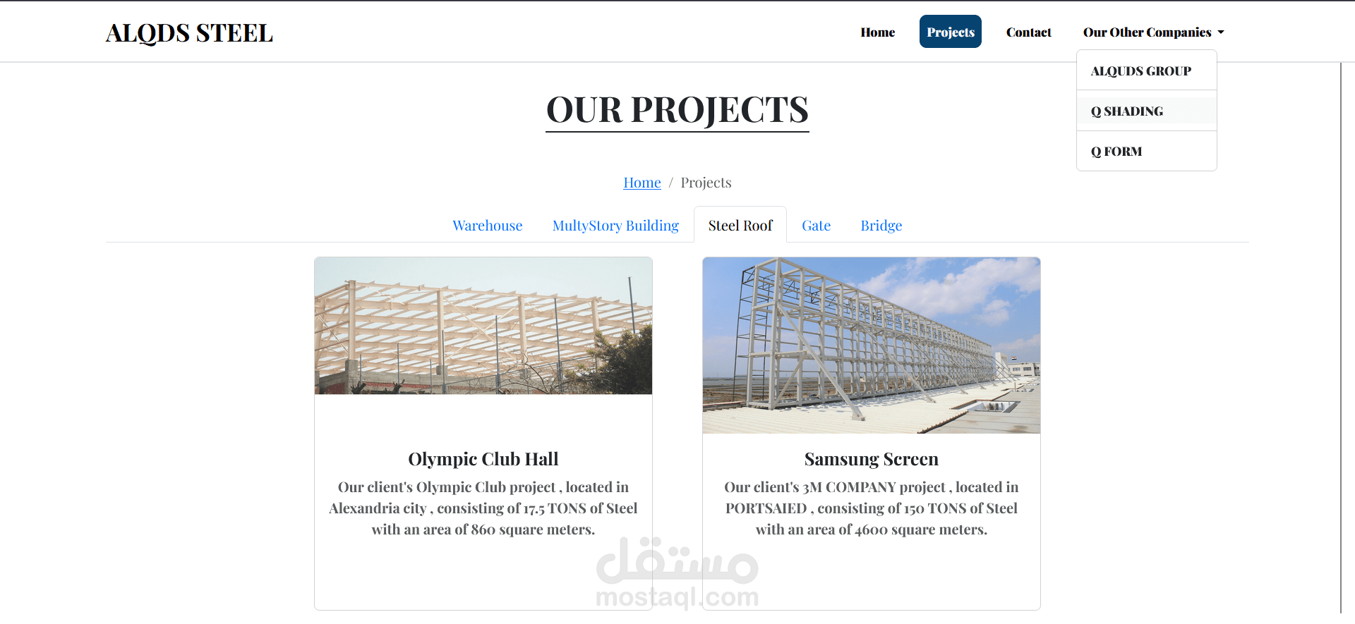 هذا المشروع هو موقع إلكتروني متكامل لمجموعة القدس (ALQUDS GROUP)، وهي شركة متخصصة في تصميم وتصنيع وإنشاء الهياكل الحديدية. تم تطوير الموقع باستخدام إطار عمل Angular لإنشاء واجهة أمامية ديناميكية وسريعة الاستجابة.