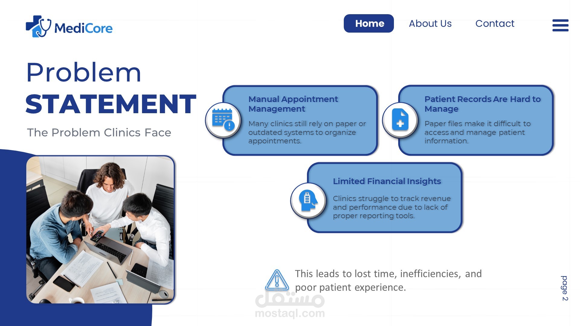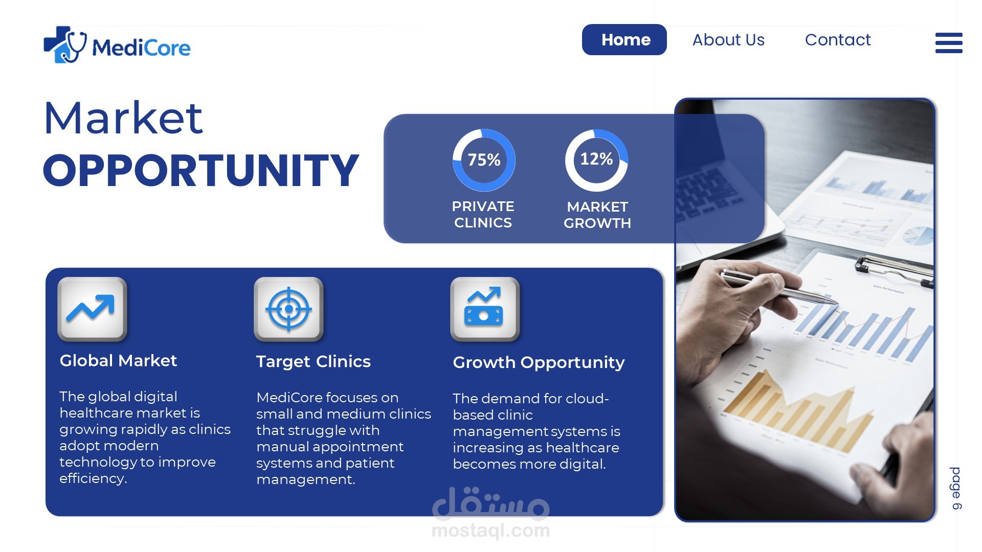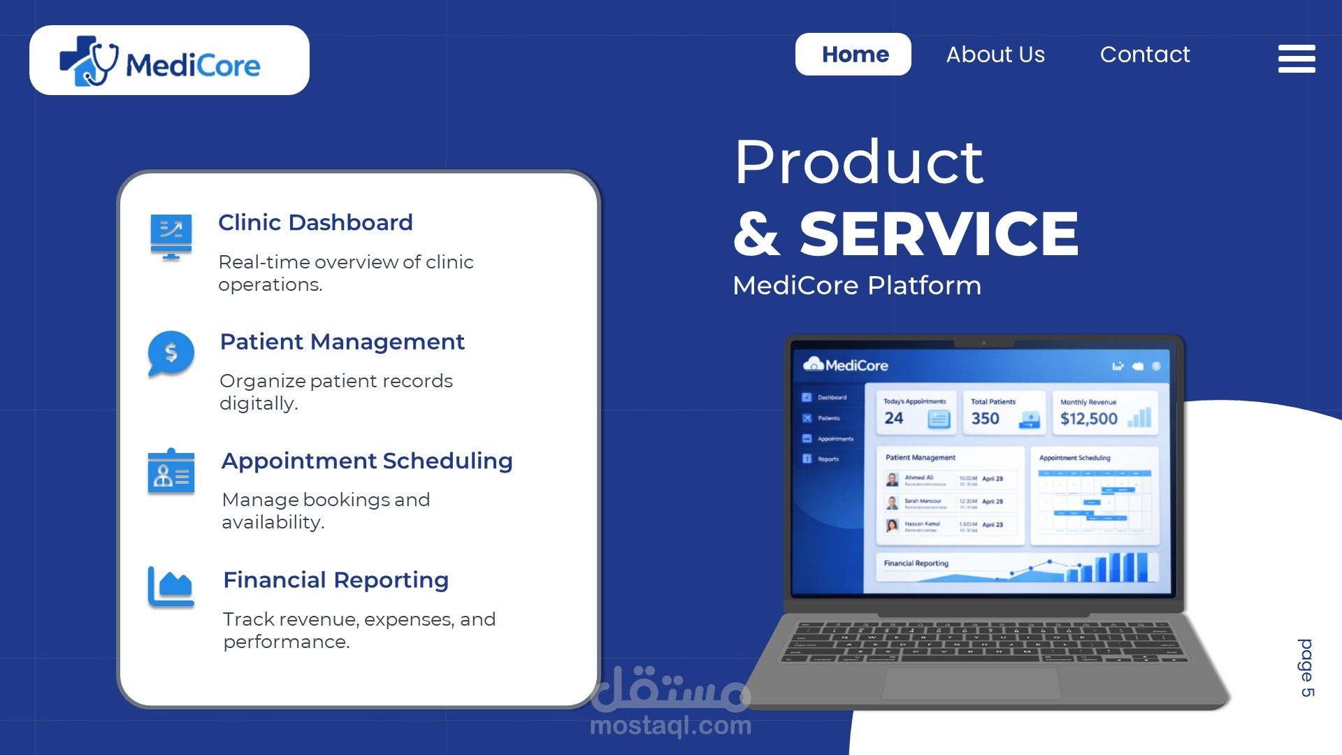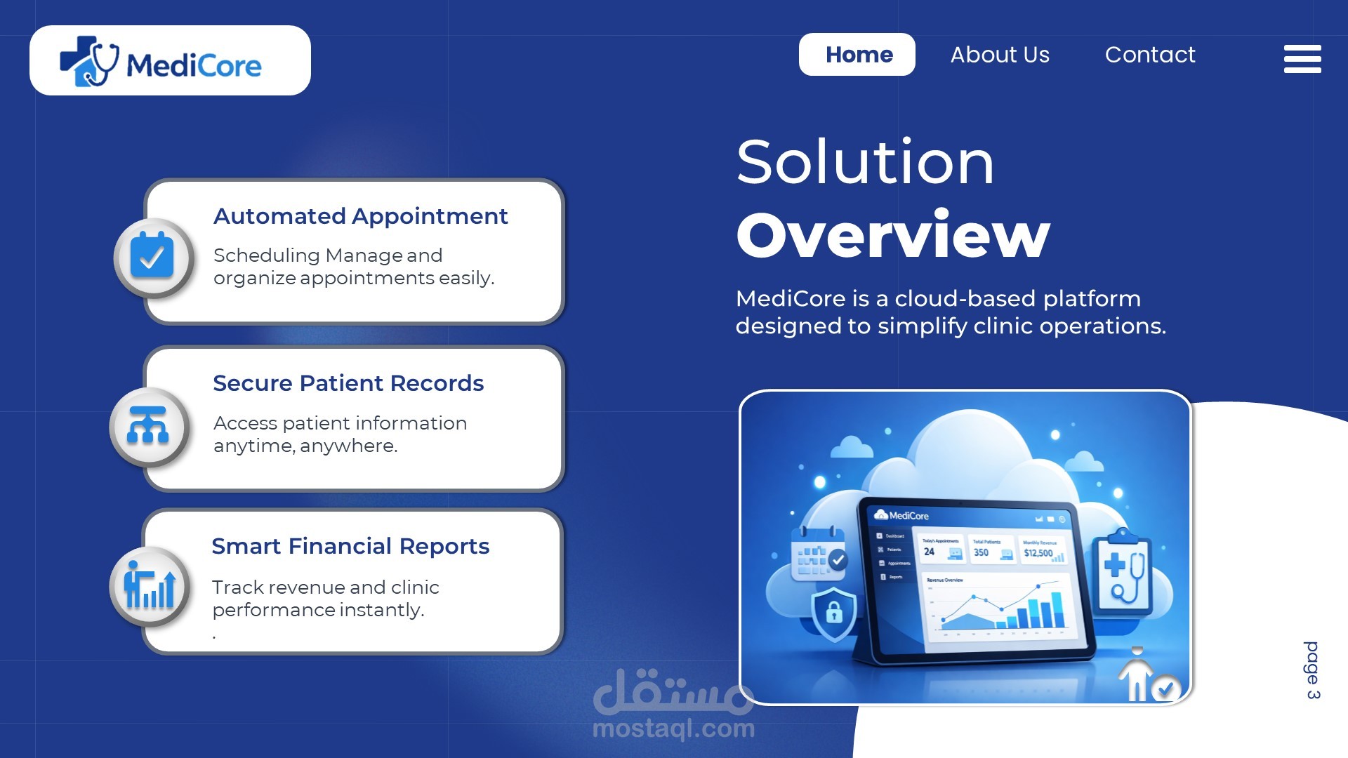 هذا العمل هو تصميم Pitch Deck احترافي لنظام إدارة عيادات (MediCore)، يركز على تبسيط الفكرة وتحويلها إلى عرض واضح وجذاب.