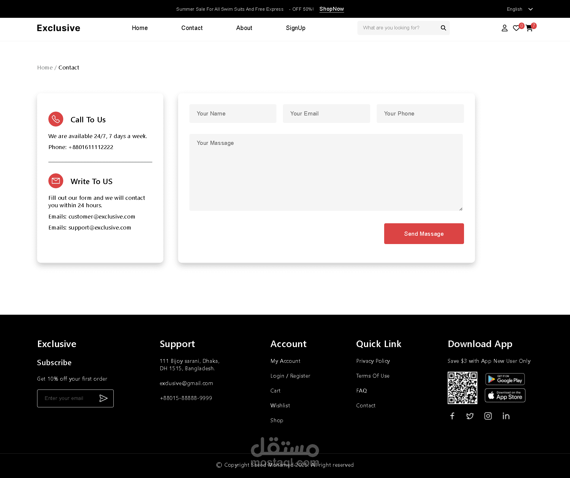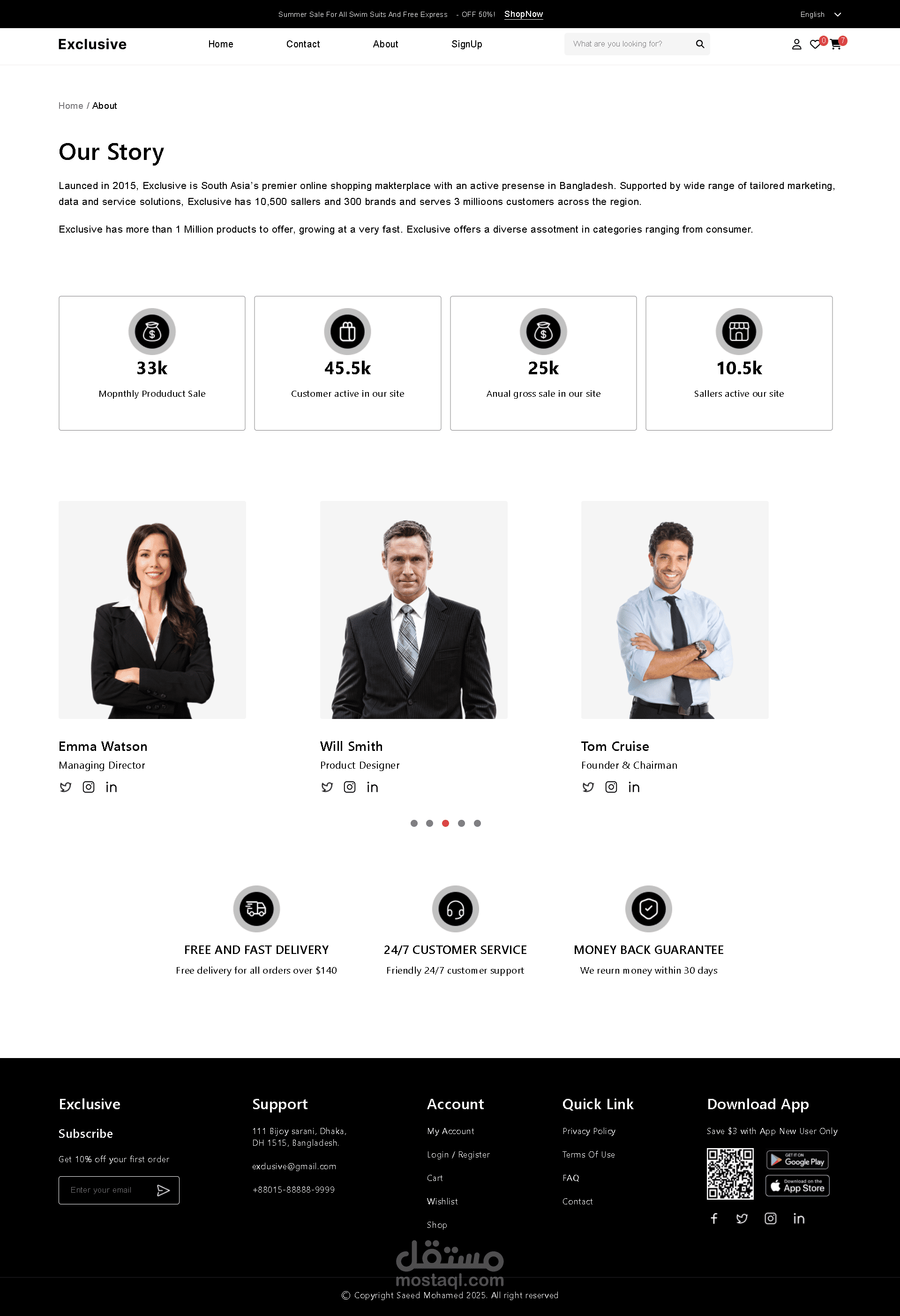 يحتوي على عدة صفحات منها: الصفحة الرئيسية، تواصل معنا، من نحن، تسوق الآن، حسابي، عربة التسوق، صفحة الدفع.