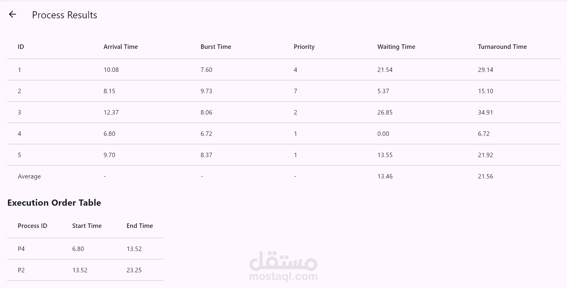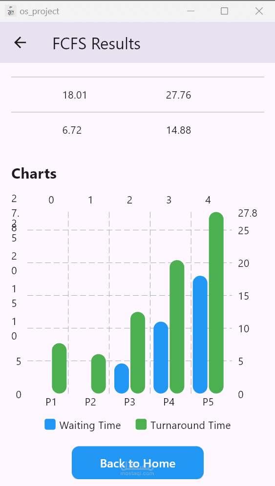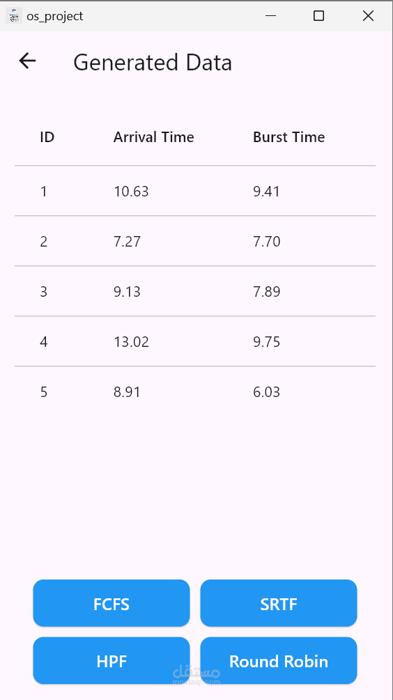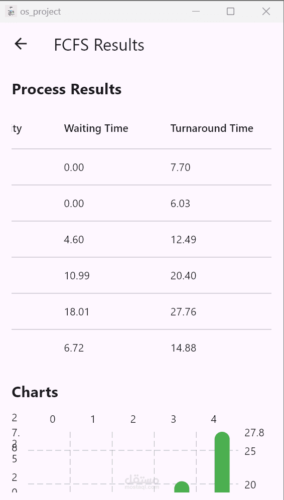 التطبيق بيحسب ويعرض حاجات زي متوسط وقت الانتظار، ومتوسط وقت الدوران، لكل خوارزمية.