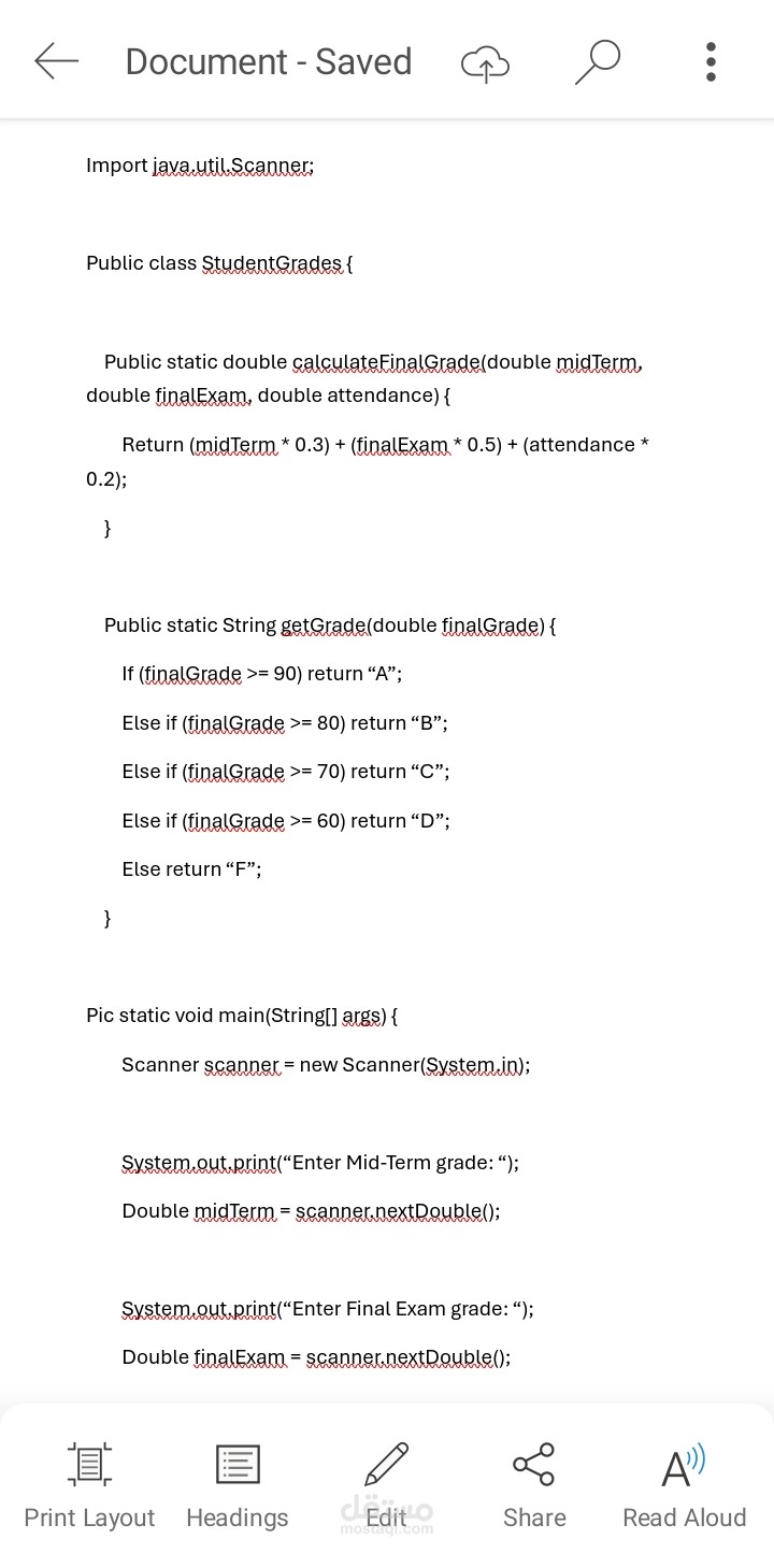 برنامج تم تطويره باستخدام لغة Java لحساب التقدير النهائي للطلاب بناءً على درجاتهم في الميدتيرم، الفاينال، والأنشطة. يسمح البرنامج للمستخدم بإدخال الدرجات، ثم يقوم بحساب المجموع وتحديد التقدير النهائي (ممتاز، جيد جدًا، جيد، مقبول، ضعيف...) باستخدام شروط منطقية لكل فئة.