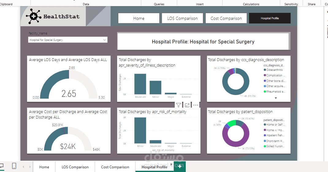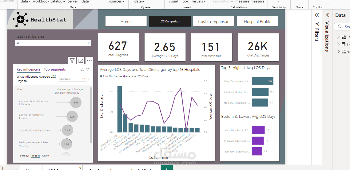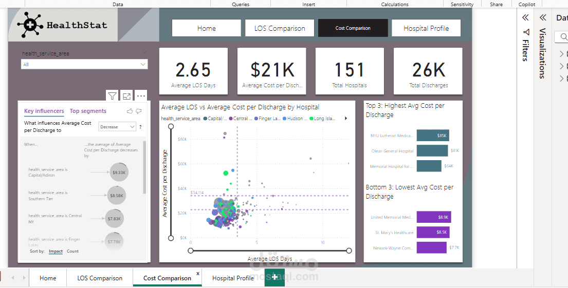 مقارنة أداء المستشفيات من حيث الكفاءة والتكلفة ومدة الإقامة.