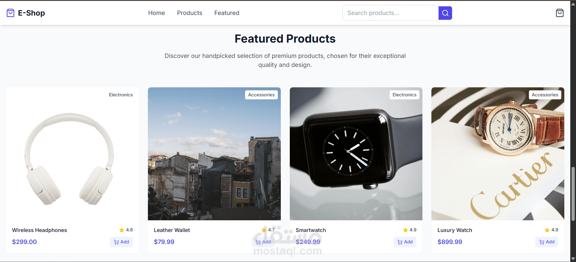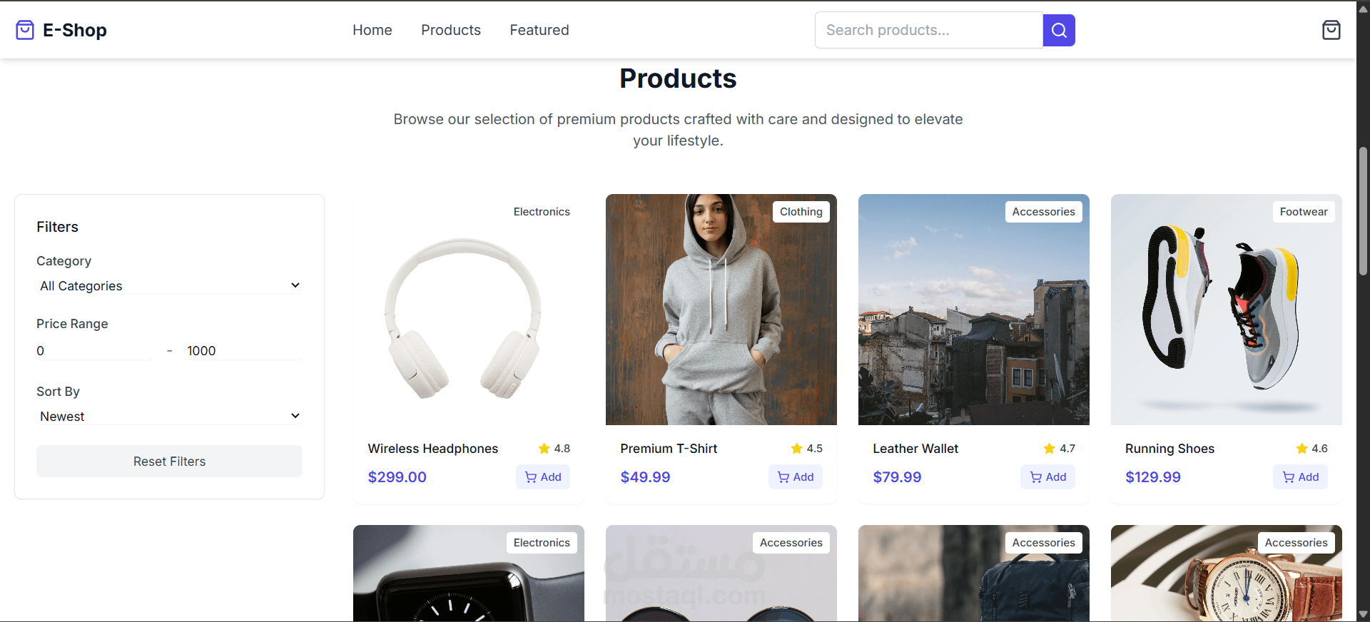 عرض المنتجات بأسعار واضحة مع زر "Add to Cart" لإضافة المنتجات إلى السلة.