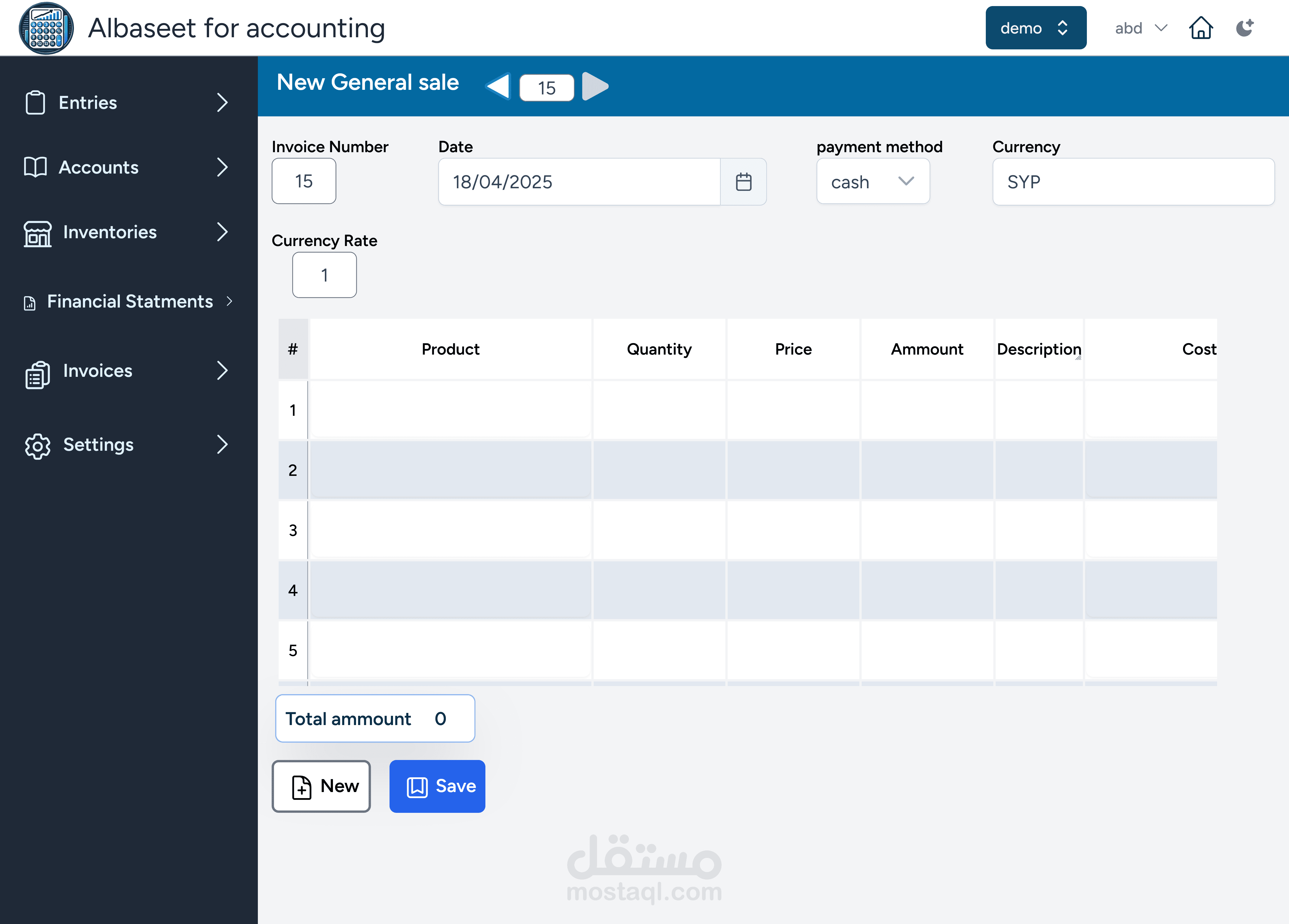 2- تسجيل فواتير البيع و الشراء و كذلك اجراءالقيود المحاسبة الناشئة منها بشكل الي , كذلك التطبيق يمكن من اجراء القيود المحاسبية بشكل يدوي , كذلك يمكن اضافة حقول اضافية عللى الفواتير و القيود حسب الحاجة