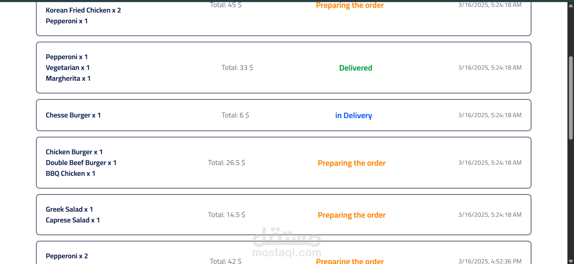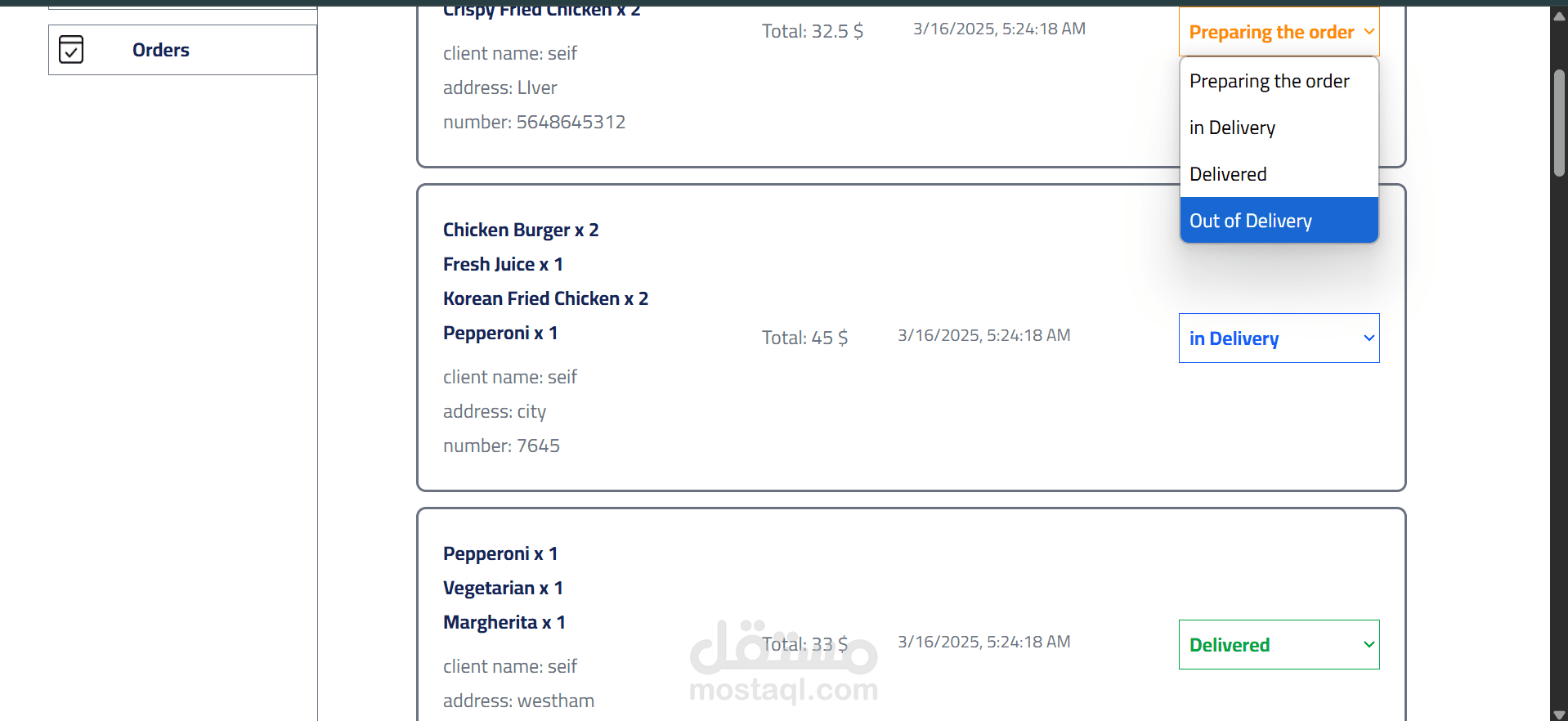 Control order status (Preparing the order, In Delivery, Delivered, Out of Delivery).