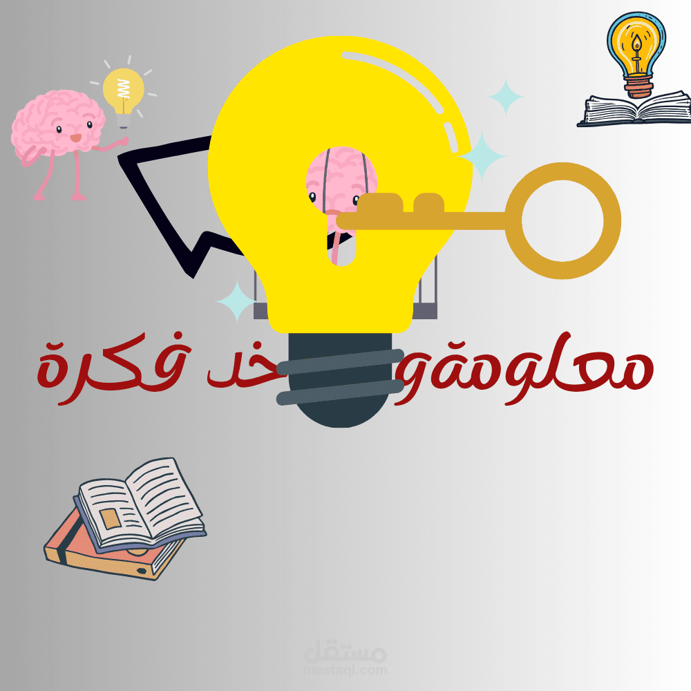 تصميم جذاب وموجه لتوصيل فكرة تعليمية بطريقة خفيفة وسهلة، بيعتمد على عناصر مرئية ذكية زي المصباح، الدماغ، والكتب، عشان يعبر عن مفهوم المعرفة والإلهام.