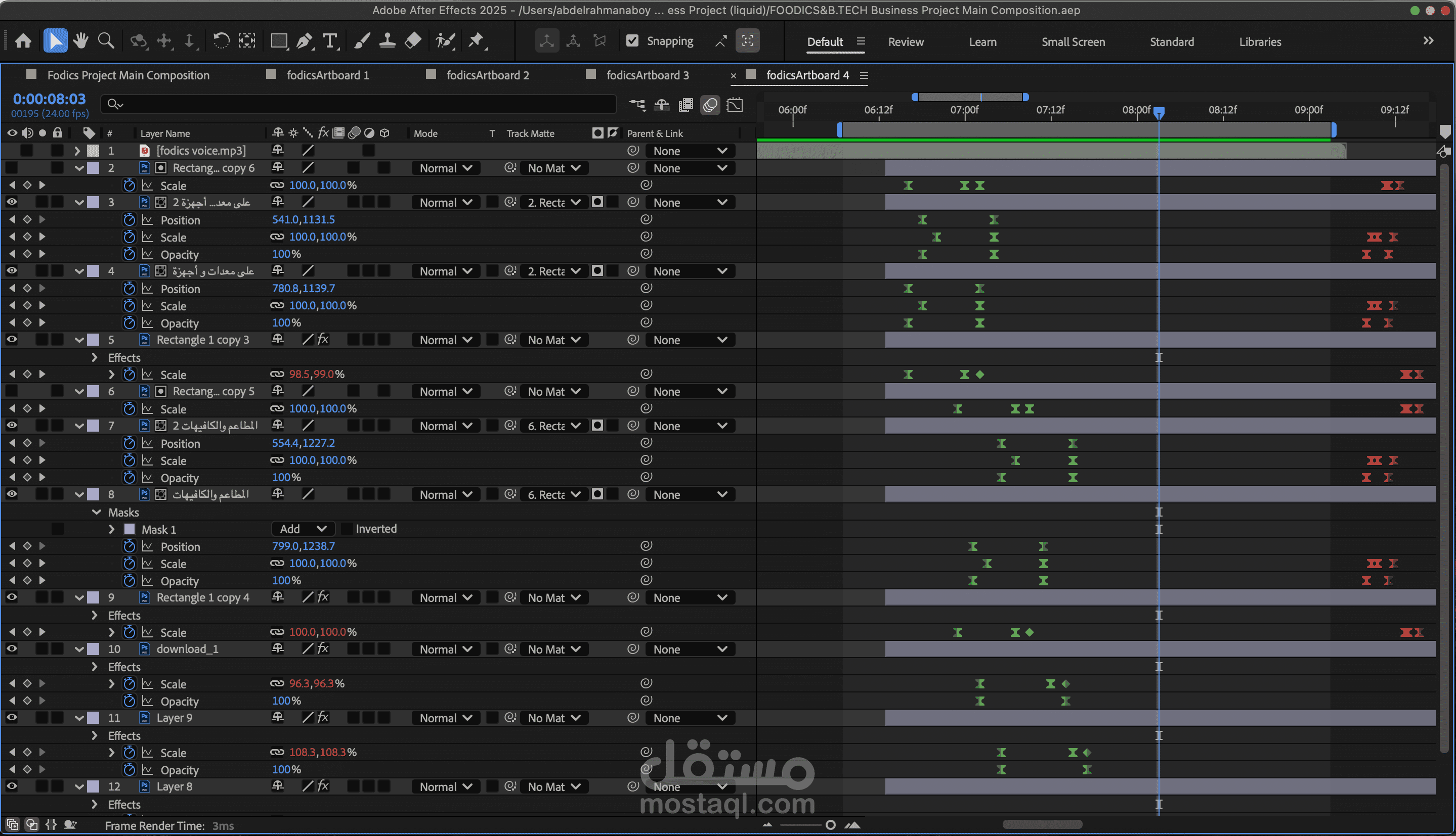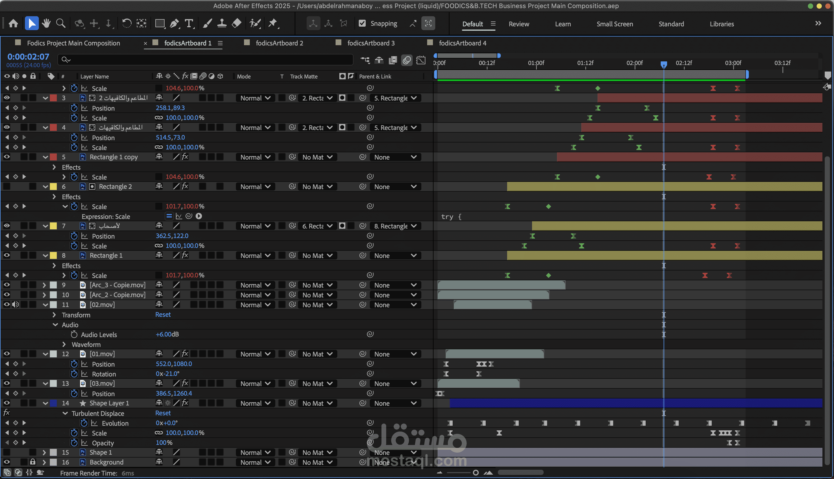 وبعد أن انتهيت من التحريك قمت بالمراجعة علي المشروع بالكامل وتحسين الحركة لجعلها أكثر سلاسة ومرونة