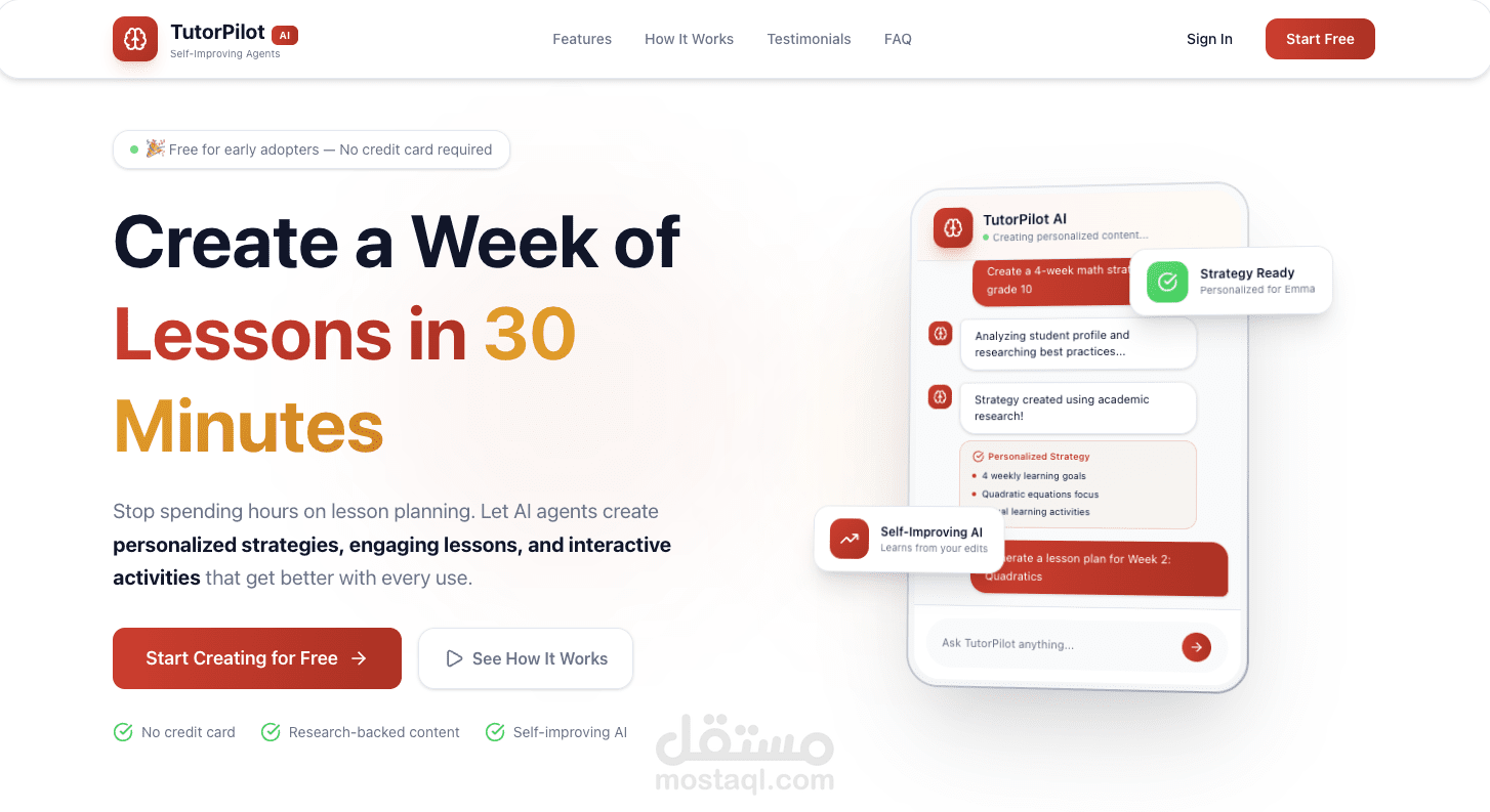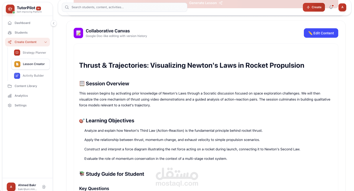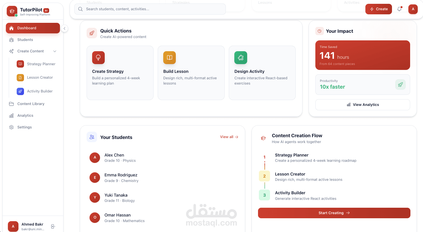 Built a self-improving multi-agent tutoring system using FastAPI with hierarchical context handoff (Strategy → Lesson → Activity agents), implementing dual-reward reinforcement learning from autonomous self-evaluation metrics (6 pedagogical criteria per generation) and tutor feedback captured via version history with explicit edit notes, feeding pattern analysis through LearnLM reflection service that generates actionable insights injected into adaptive prompts—reducing repeated mistakes by 40% and improving engagement scores from 6.5→8.5 average across 50+ generations