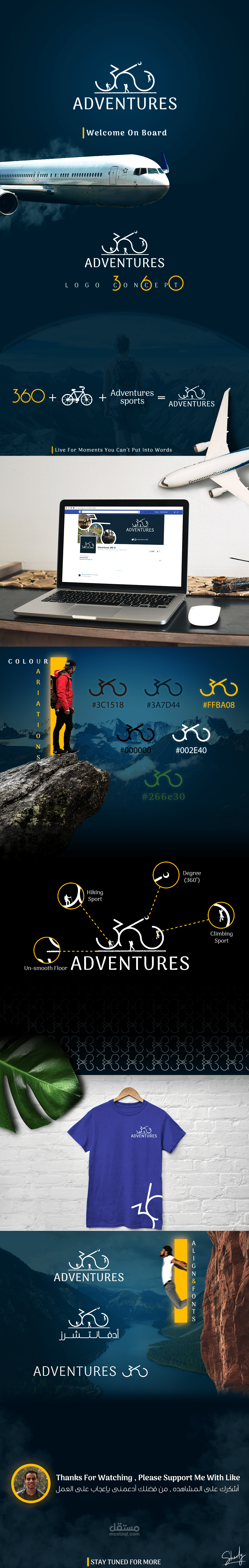 تصميم شعار و هويه بصريه لحساب شركه سياحيه متخصصه بعض الشئ فى الرحلات المليئه بالمغامرات Adventures 360 و الذى استوحيت فكره الشعار من الدرجات الجبليه و الأنشطه الخطيره التى بها قدر عالى من الأستمتاع مع أختيار ألوان بها قدر عالى من النشاط و الحيويه أتمنى أن يعجبكم و لا تنسوا الإعجاب.