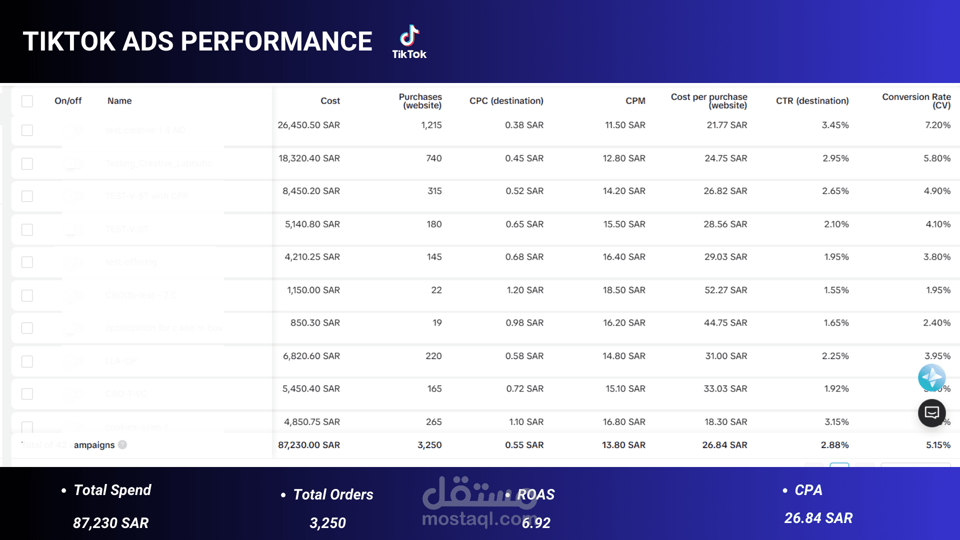 • TikTok: 3,250 orders at 26.84 SAR CPA