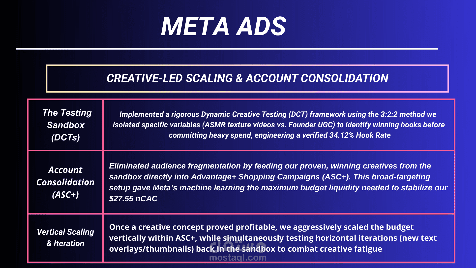 Meta Ads (Creative-Led Scaling): Shifted to a 3:2:2 Dynamic Creative Testing framework to identify winning hooks (34.12% Hook Rate) before feeding them into Advantage+ Shopping Campaigns (ASC+)