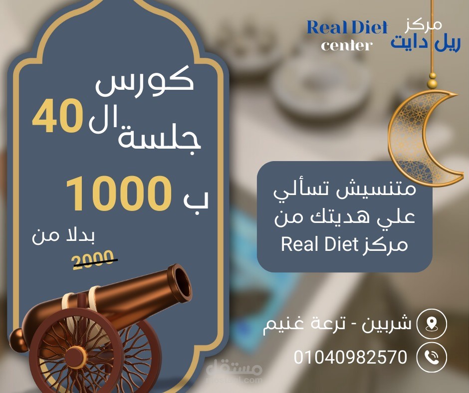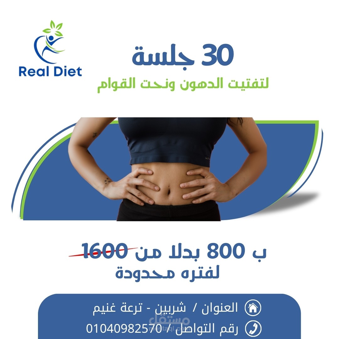 في هذا العمل، قمت بتصميم بوستر إعلاني لمركز "Real Diet" يروّج لعرض خاص على جلسات تفتيت الدهون ونحت القوام.