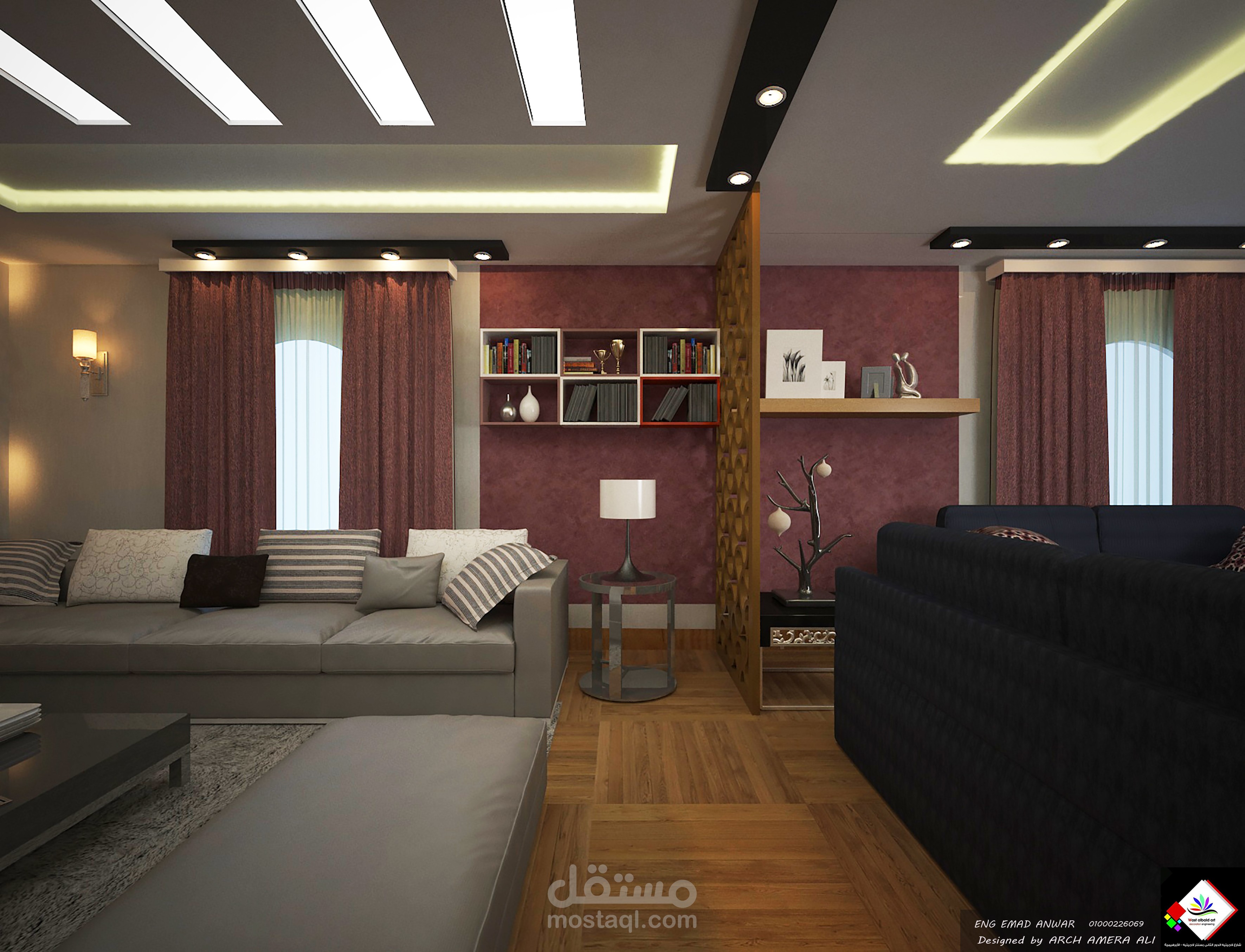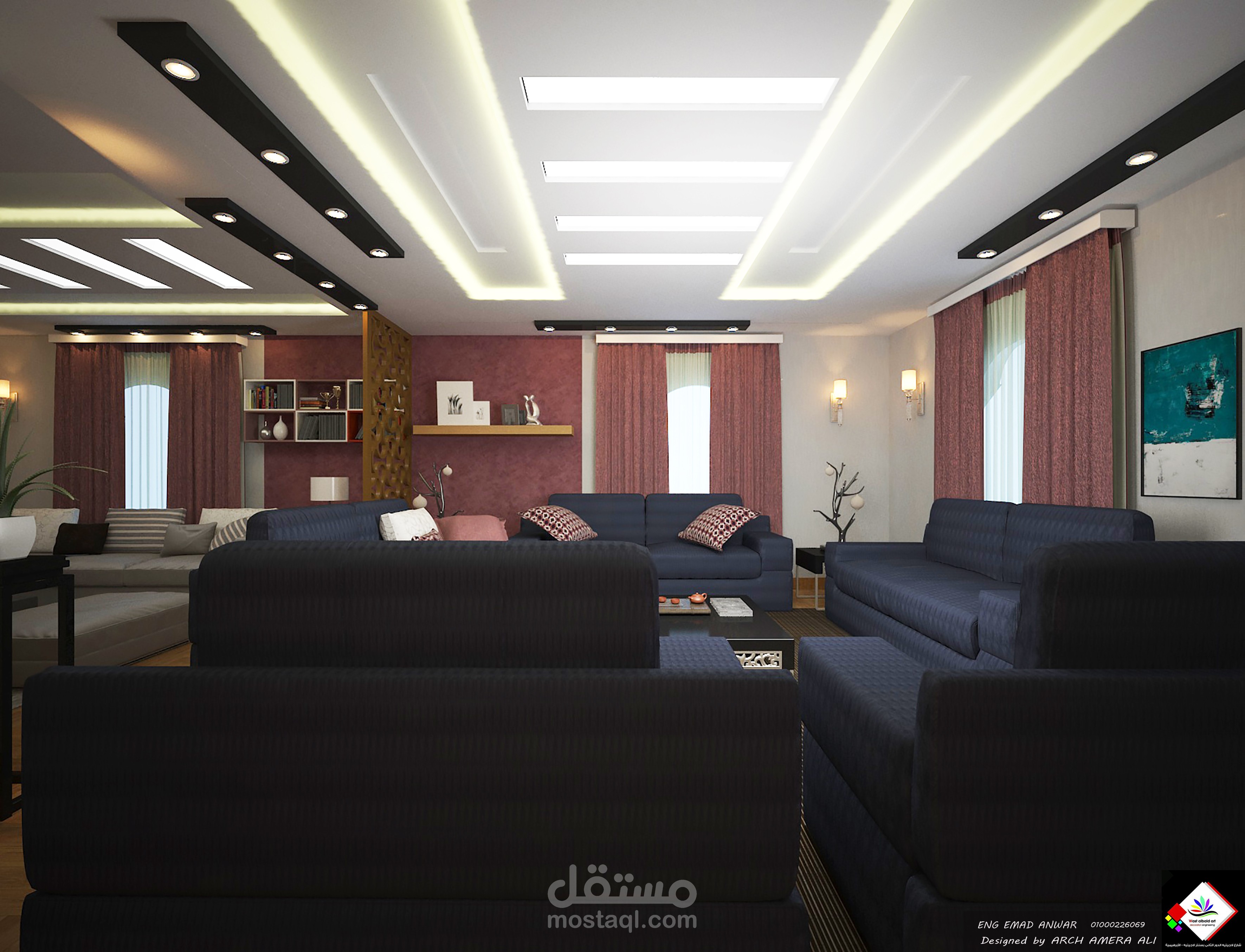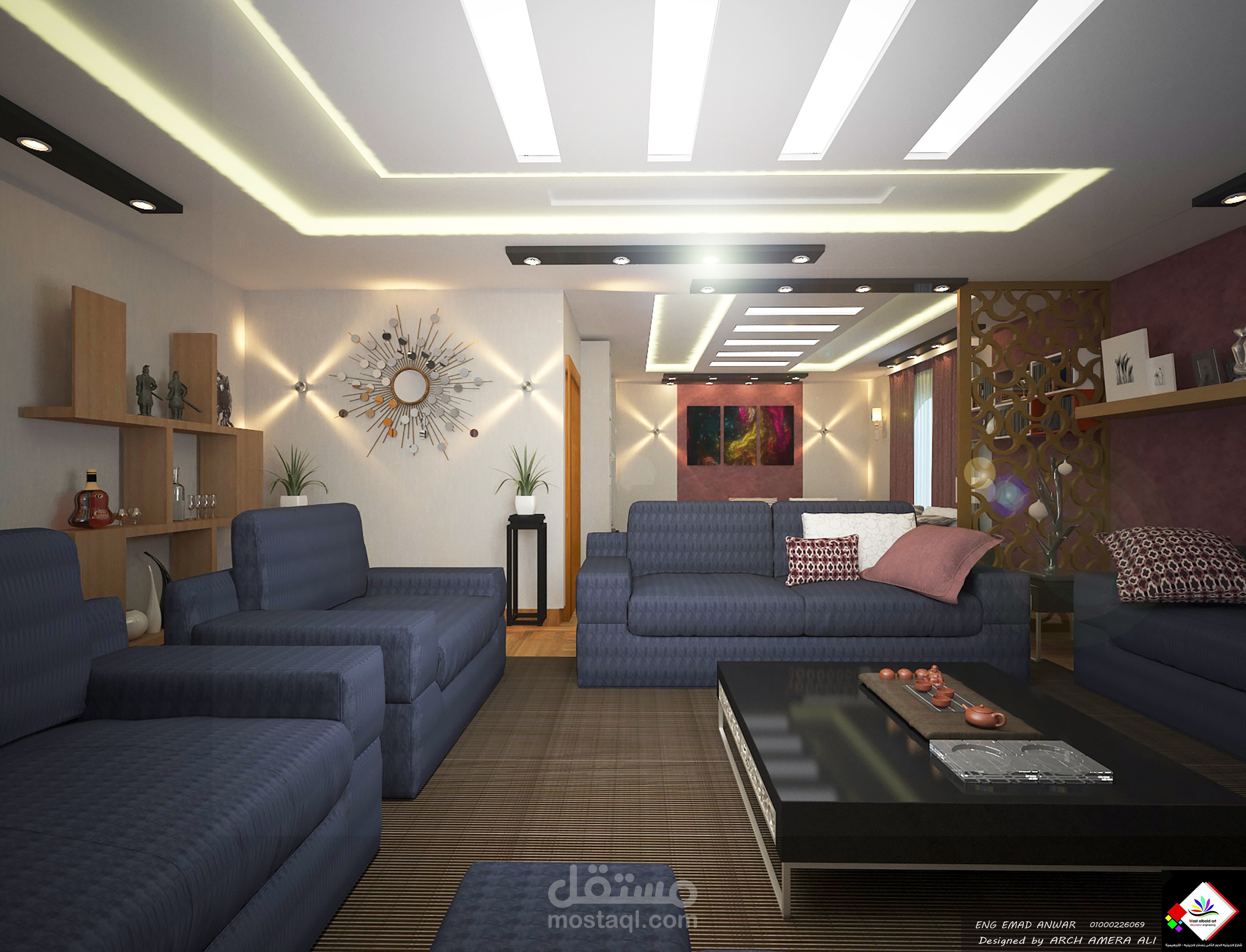 غرفه معيشه يفصلها عن غرفه طعام مستوى بسمك 15 سم وحائط من ال cnc