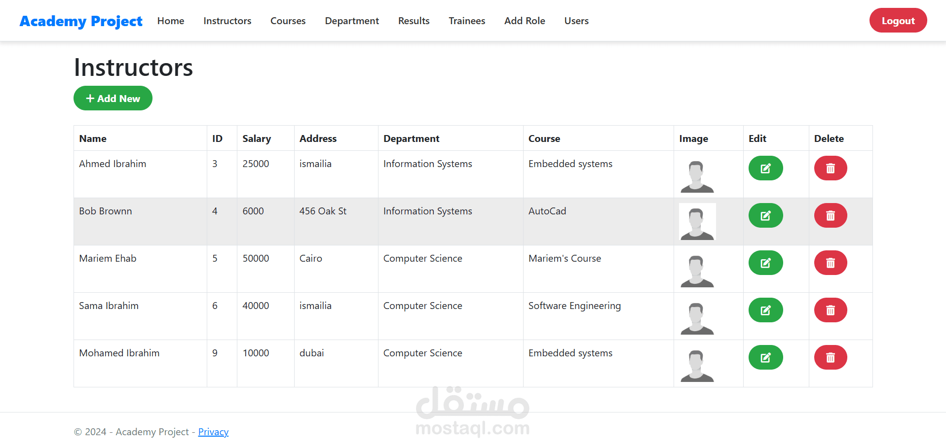 A complete web application for managing an academy's core operations, including students, courses, departments, instructors, and trainee results. The system features a dashboard for admins showing overall statistics and supports role-based access (Admin, Manager, User).